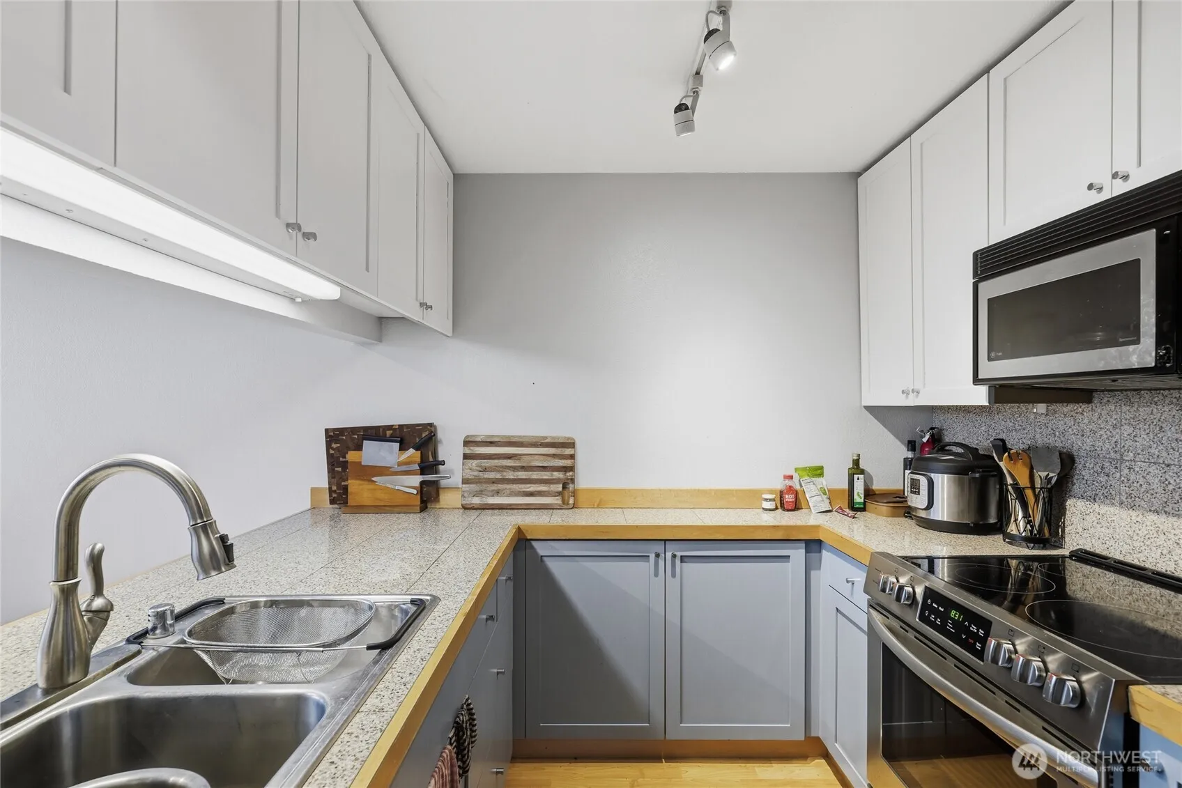 A sweet spot for urban living with a Walk Score of 94. Enjoy easy access to transit, urban trails, tennis courts, & the waterfront, all just steps from Seattle Center & Climate Pledge Arena. This light-filled one-bedroom unit overlooks a private courtyard garden & features an open layout with double sliding doors, granite kitchen counters, marble bath counters, stainless steel appliances, & is the only unit in the building with a built-in fireplace. Well maintained with a fresh feel, ready for your personal touch. Includes 1 secured parking spot. Storage unit on the same floor. Community amenities include gym, lounge/media room, bike storage, BBQ area, & pets are welcome. A rare blend of convenience, comfort, & location in Lower Queen Anne.