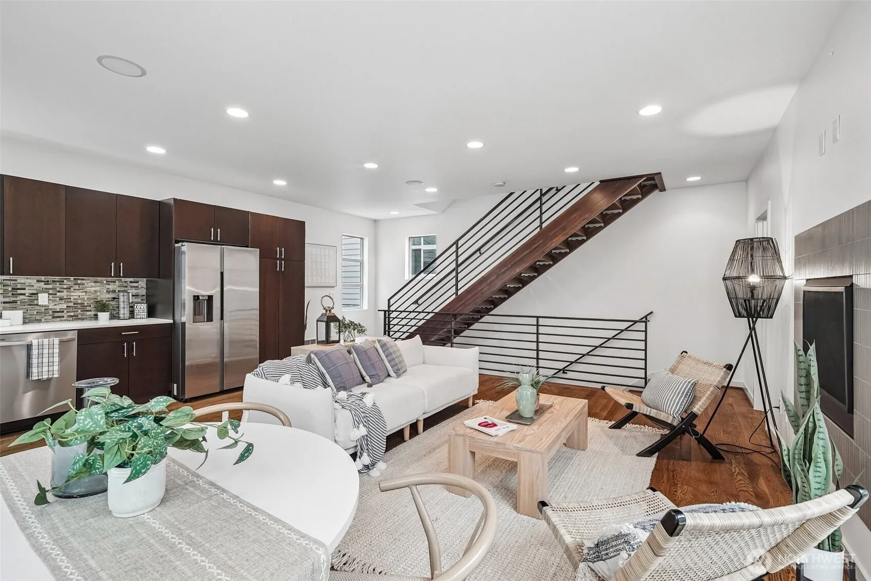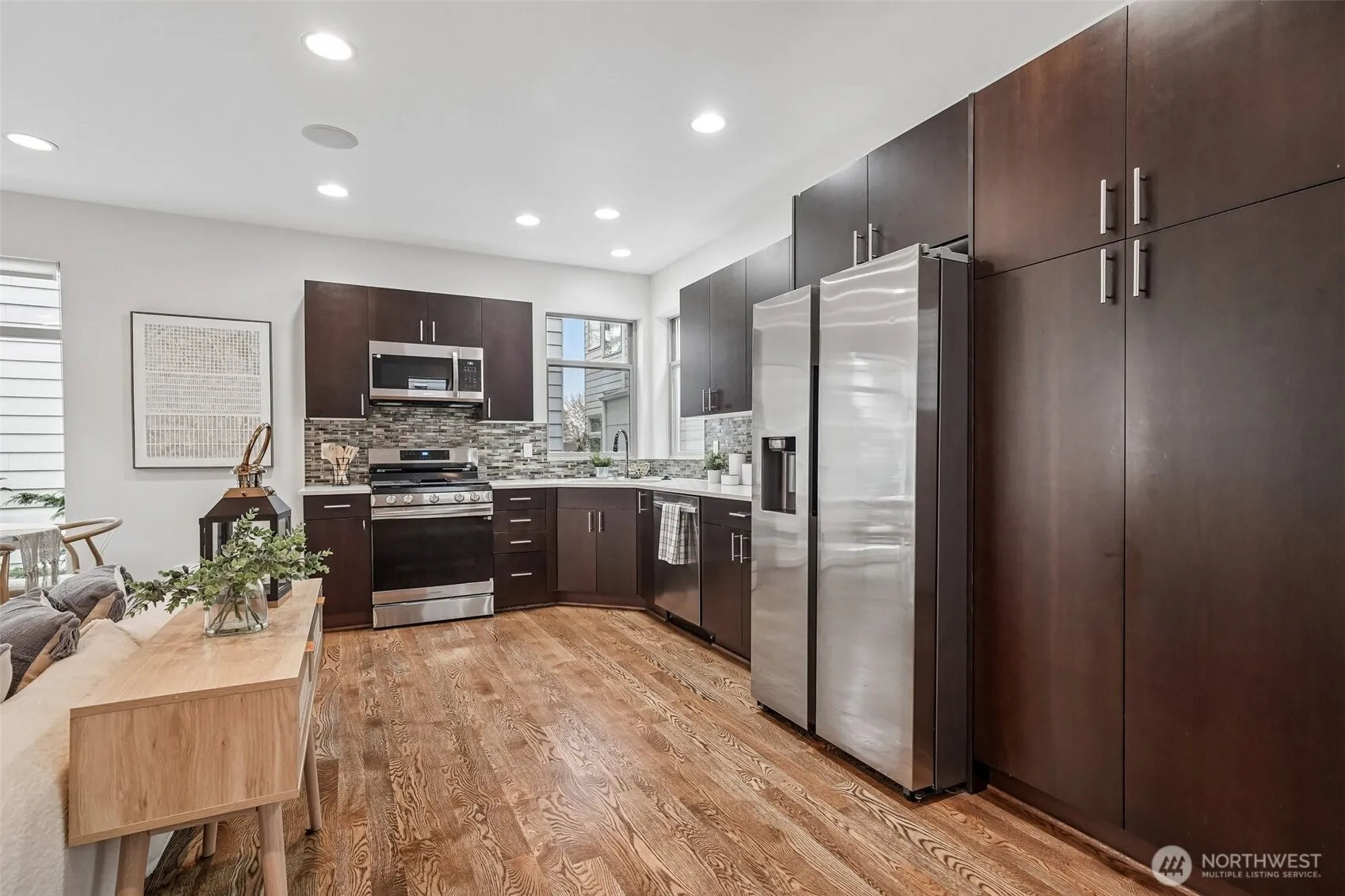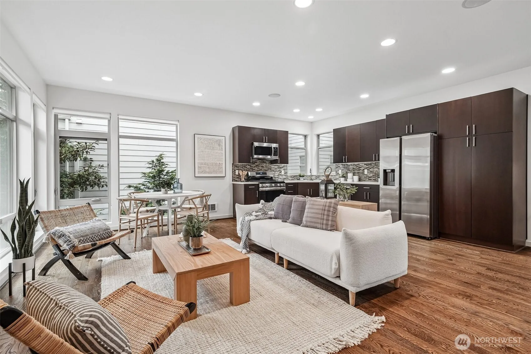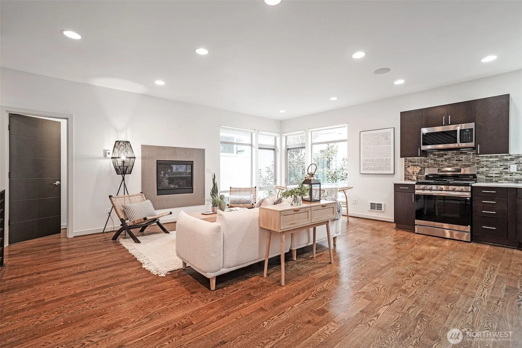 Located in the quiet and sought-after Maple Leaf neighborhood. This newer construction stand-alone residence offers the privacy of a detached home with no shared walls. High ceilings, gorgeous oak hardwood floors, and striking solid fir floating stairs create a warm, contemporary aesthetic. The open living space is complemented by a gas fireplace and new kitchen appliances, including a gas range. Fresh interior paint throughout and plush new carpets in the bedrooms make this home truly move-in ready! The spacious primary suite features an en suite bath and a generously sized walk-in closet. The expansive rooftop deck, where mountain views and peekaboo glimpses of Green Lake, set the stage for relaxing or entertaining. Fully equipped with gas, water, and electrical hookups, it’s ready for everything from summer barbecues to cozy evenings under the stars. The home includes an assigned off-street parking space and an unbeatable location just about a mile from the Northgate Light Rail Station and Green Lake. With easy access to Green Lake Village, Northgate, a variety of local cafés, pubs, and excellent restaurants, plus seamless commuting options, this home is ideal for peaceful city living.