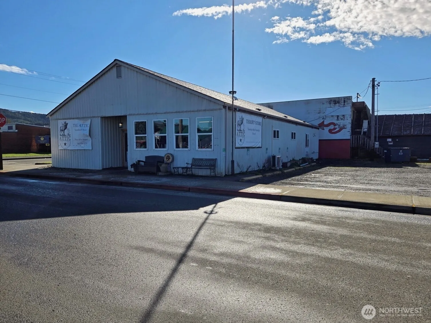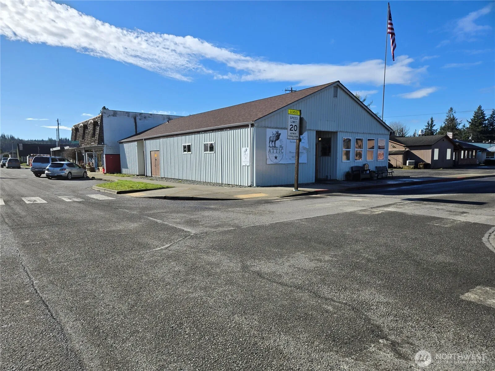 Commercially zoned 8,712 sq ft (0.20 acre) corner lot in the heart of Forks. The 2,834 sq ft building features metal siding and a new composition roof installed in 2024. Ductless heat pump provides heating and cooling. The interior layout allows for two bathroom areas and includes a 3-compartment sink in the kitchen area. Connected to city water and city sewer. This corner lot configuration offers easy access with approximately 8 parking spaces. The building offers a range of flexible opportunities for investors seeking business development or rental-income potential. Property has been recently updated to offer a RV power hookup on the west wall for many uses….food truck possibilities! Current owner planning on being out by 3/31/2026. City has address as 84 E A St.