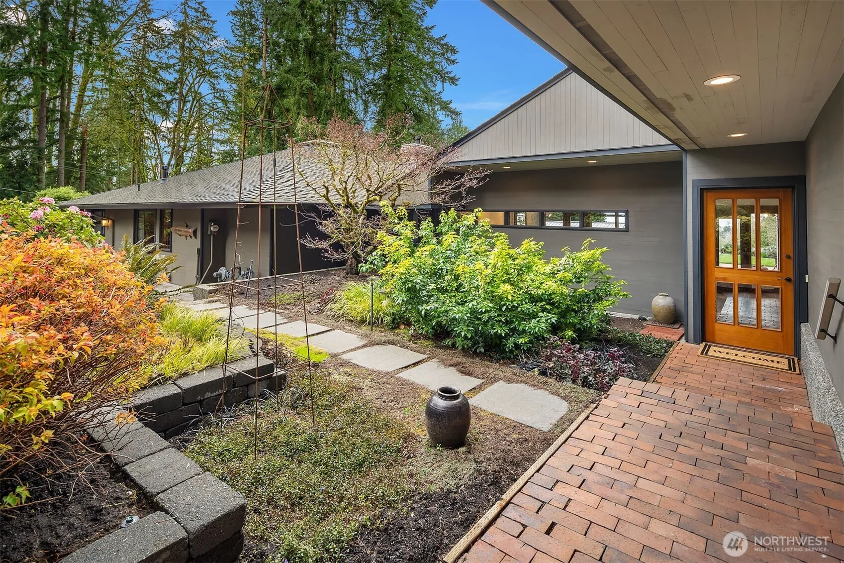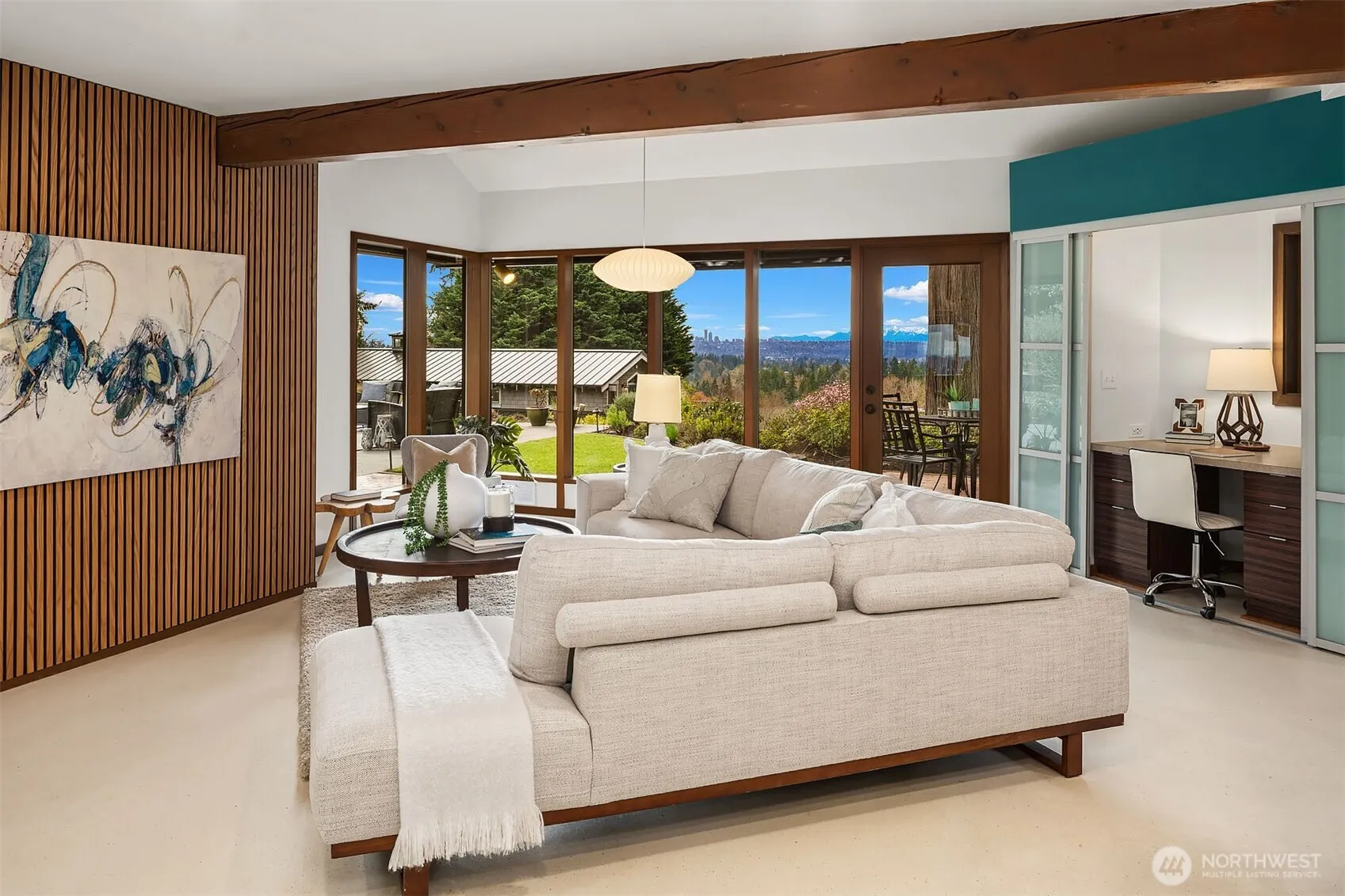 Distinctive David Gray mid-century modern estate in Pike’s Peak w/sweeping city/lake/mtn views & 3 separate structures. 3,050 ft2 Main House & 1,270 ft2 Guest House w/addtl 1,000ft2 detached office (5,320ft2 total)! Main House offers 20’ vaulted ceilings, skylights, extensive indoor lighting, main floor primary suite, 3 beds/2.5 baths, 3 exterior patios, remodeled kitchen/baths, attchd 2-car garage & more! Guest house connected w/ breezeway offers 2nd kitchen, 1 bed/1 bath, fireplace, 2 addtl patios, 1-car attchd garage. Car enthusiasts’ dream – detached garage/office with storage for 10 vehicles. Sun-drenched west-facing 1+ acre grounds directly adjacent to Bridle Trails State Park, fully landscaped & exclusively private. Extensive systemic upgrades. Welcome home…