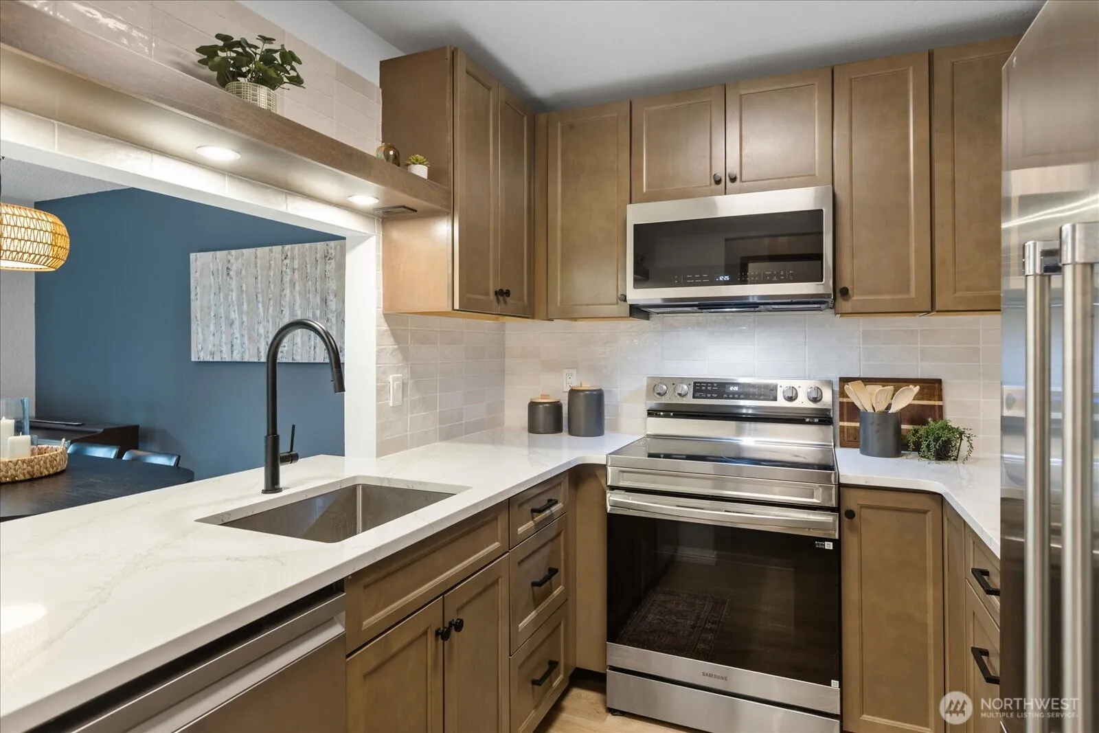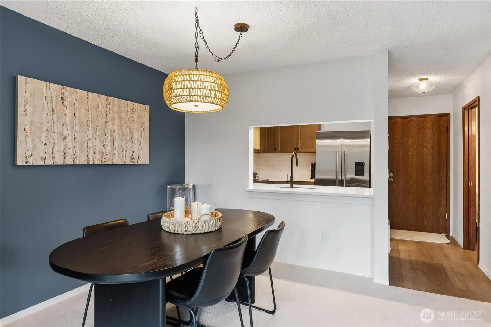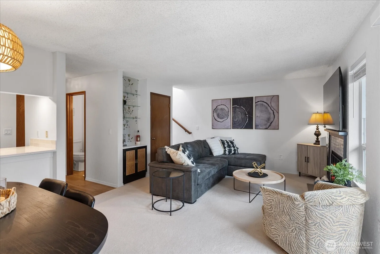 Welcome to the Golden Leaves condominium complex, a secured building offering comfort, convenience, and a vibrant lifestyle. This newly updated 2-bedroom unit is filled with natural light from its west-facing windows and boasts a large deck perfect for morning coffee, plus extra storage for everyday ease. Inside, you’ll find a beautifully tiled wood-burning fireplace, plush new carpet, and stylish new light fixtures that enhance the spacious living and dining areas designed for effortless entertaining. A convenient half bath is located off the kitchen and entryway. The brand-new kitchen is thoughtfully designed for easy meal prep, featuring all new cabinetry, quartz countertops, stainless steel appliances, a Fisher Paykel refrigerator, and a new sink. Upstairs, the primary suite and second bedroom are complemented by an updated 3/4 bath and a dedicated laundry room with full-size stacking units and additional storage. Residents enjoy one covered, dedicated parking space along with abundant guest parking, while the community cabana features a relaxing hot tub, exercise room, and sauna. Pet-friendly and ideally located with easy access to I-5, Swedish Hospital, Five Corners dining, and Downtown Edmonds, this home offers seamless commuting and the best of Edmonds living within the highly regarded Edmonds School District.
