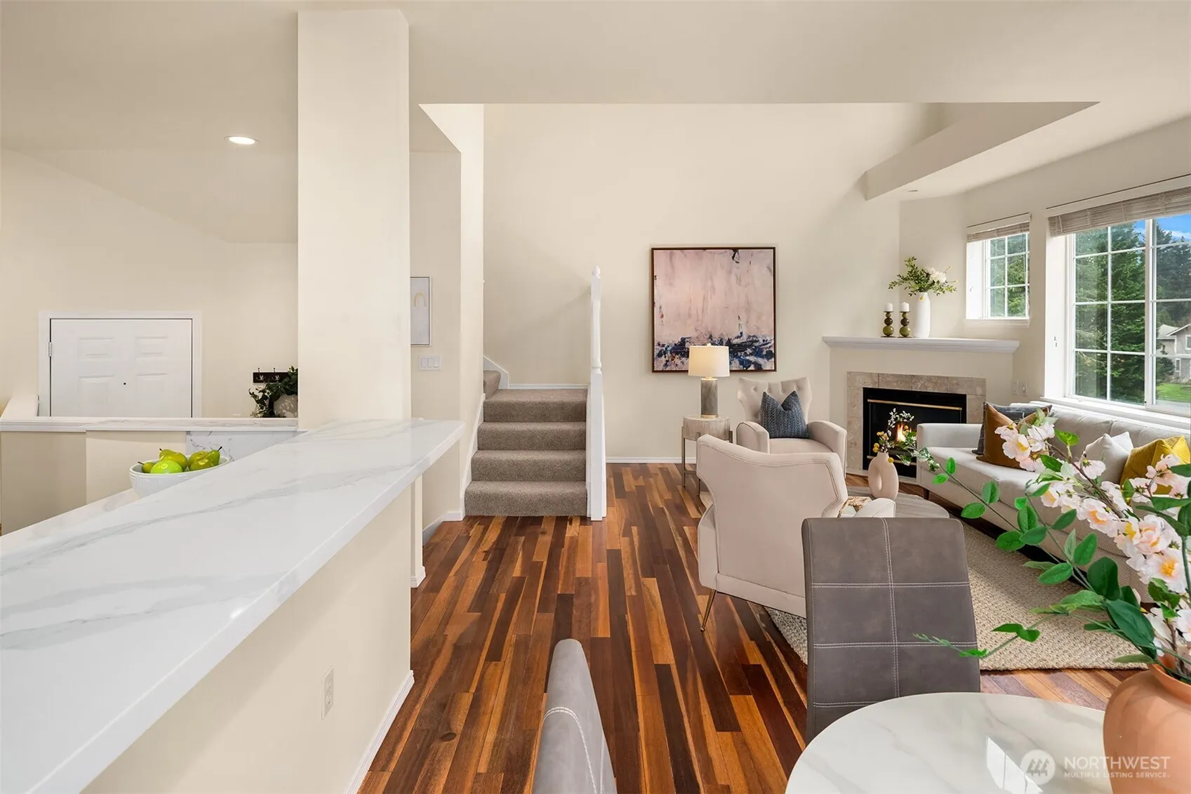Nestled in the beloved English Cove community, this bright 3-bedroom, 2.5-bath corner townhome offers an unbeatable combination of location, comfort, and natural beauty in one of the area’s top-rated school districts. Perfectly positioned on the Eastside, you’ll enjoy easy access to Bellevue Downtown, Redmond, and Kirkland within 10–20 minutes, while SR-520 provides a convenient commute to Downtown Seattle. Everyday essentials are just minutes away with nearby shopping, dining, parks, and Costco. Inside, the home features soaring ceilings in the main living area and an open-concept layout that creates a bright and inviting space for living and entertaining. Large windows on both sides of the home fill the space with natural light, enhancing the airy feel. The kitchen has been refreshed with a new countertop, and A/C has been added for year-round comfort. Upstairs offers three generously sized bedrooms and two full bathrooms, including a spacious primary suite where you can enjoy peaceful lake views. A 2-car garage provides ample parking and storage. Surrounded by serene scenery and supported by a well-managed HOA that covers water, sewer, exterior and common areas, this home offers a low-maintenance lifestyle in a prime location.