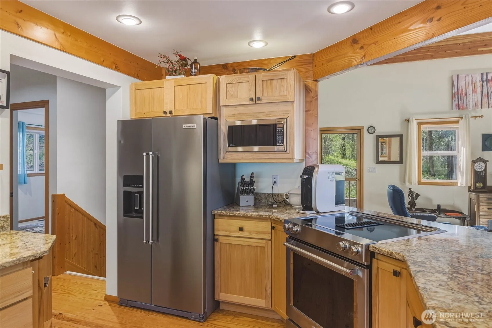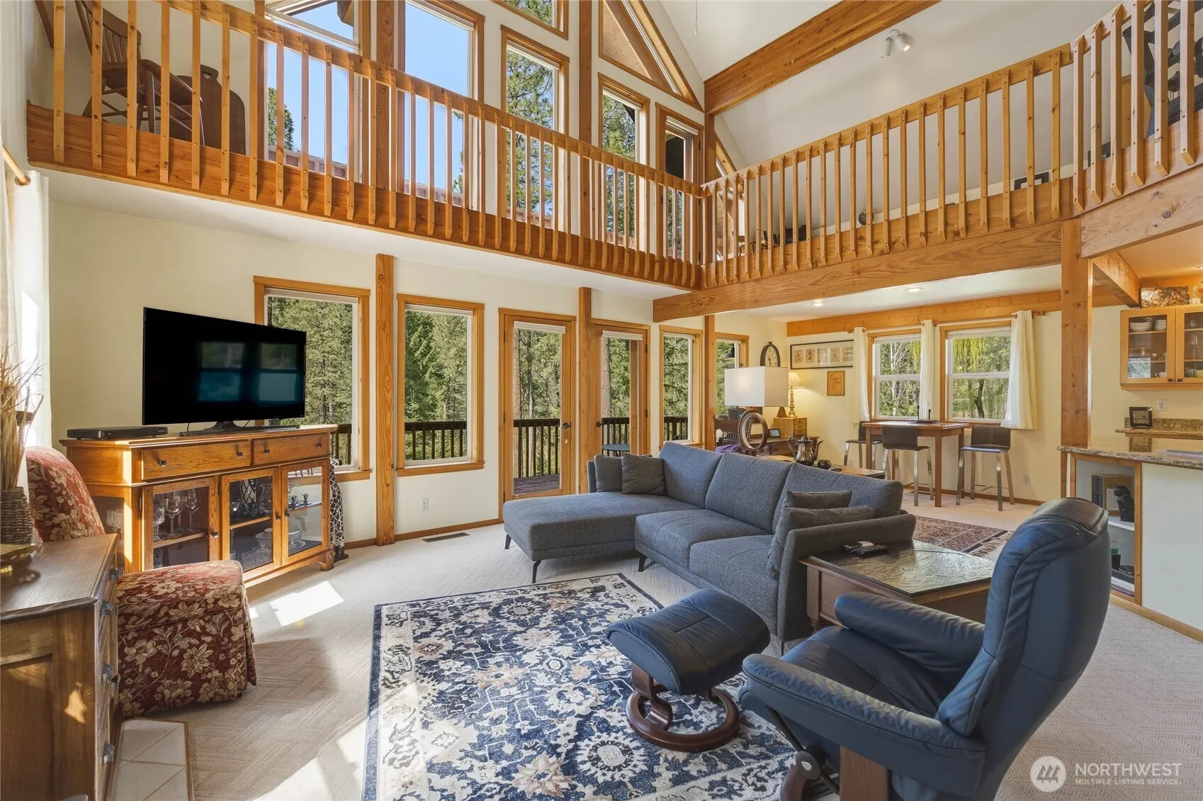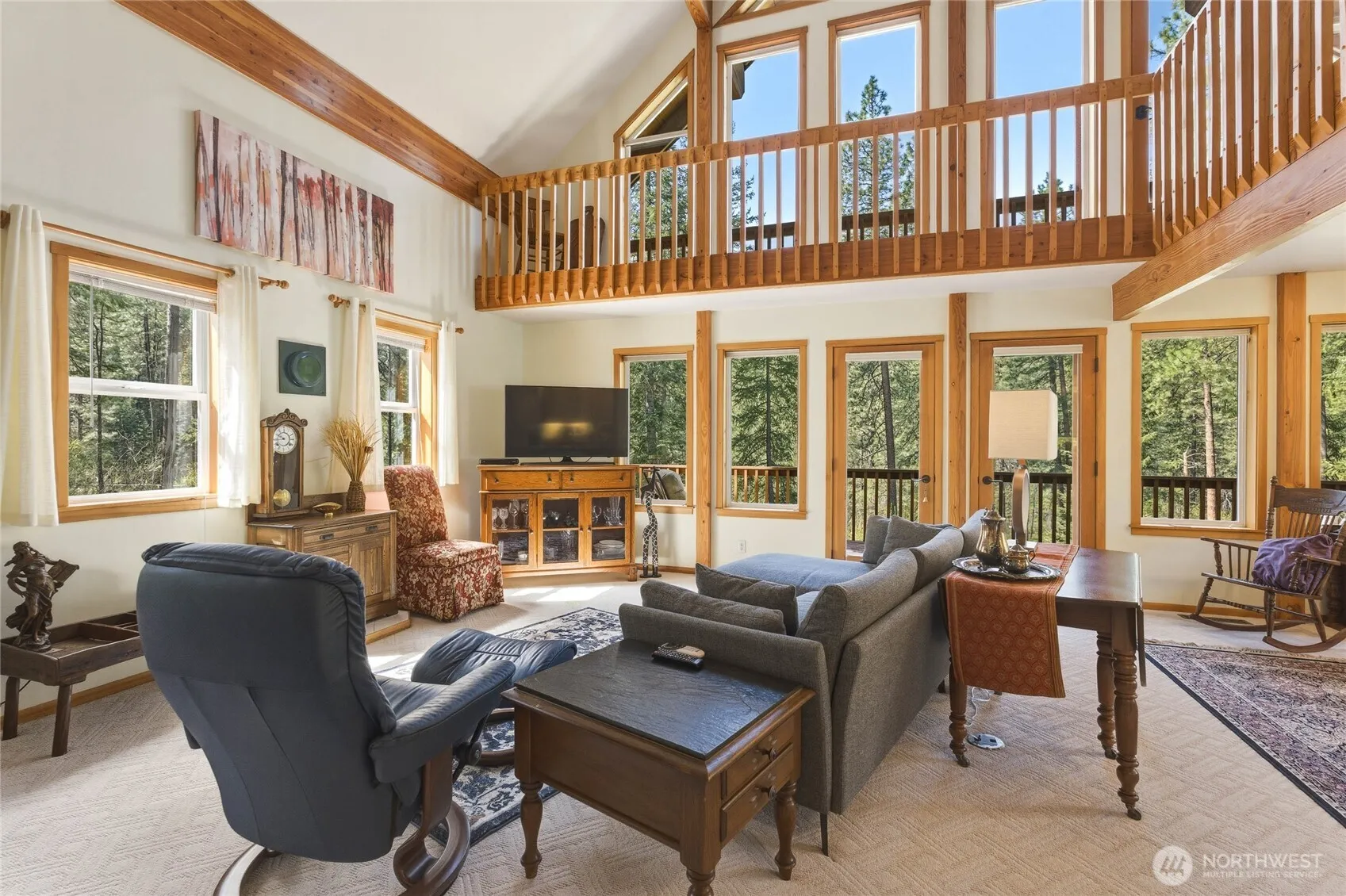 Perfectly positioned as an ideal getaway or year-round residence, this mountain home sits on 1.47 forested acres just minutes from Leavenworth and Wenatchee, with easy access to year-round recreation. Public lands are only a half mile away, offering hiking, alpine and Nordic skiing, and abundant wildlife. The interior offers a loft-style layout with main-level living, featuring hardwood floors throughout the kitchen, custom wood cabinetry, a spacious guest bedroom with dual closets, a full bath, and a large laundry/mudroom with access to a private back deck. The loft-level primary suite includes a custom-built window wall for added privacy or natural light. Property features include a 2023 heat pump, wood-burning stove, private well, and a 40×24 detached RV shop with a 16-foot door. Two front-facing balconies provide outdoor space on each above-grade level. The lower level includes a two-car garage with built-in storage, central vacuum, and wood stove, plus a fully insulated and heated bonus room and a root cellar for additional storage. A newly constructed retaining wall adds to the property’s appeal. Conveniently located just a half mile off Blewett Pass, offering an easy commute to Seattle and quick access to I-90.
