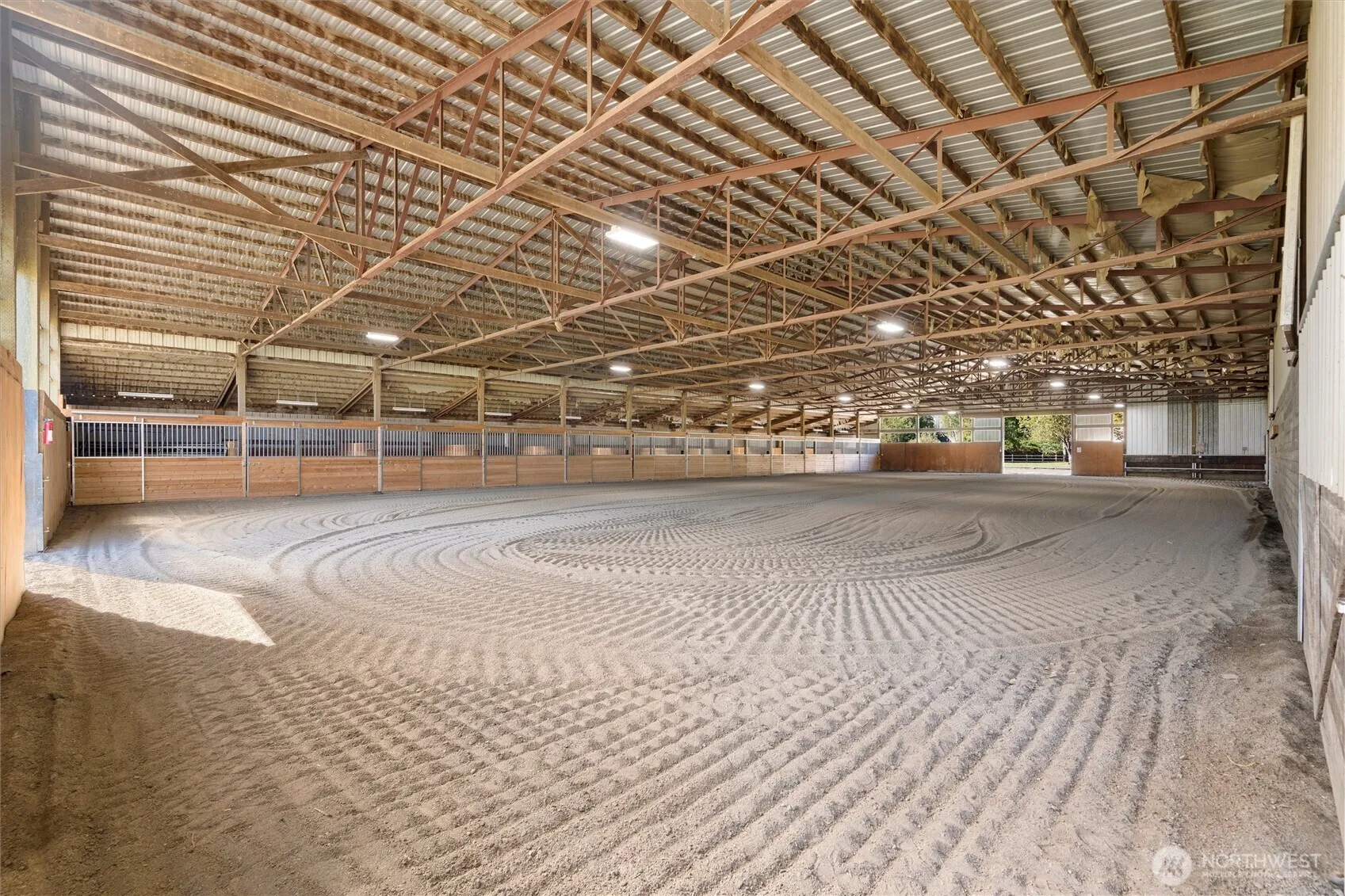 *No water intrusion into the house from recent flooding* Welcome to Eagle Creek Farms. This stunning gated 13.9-acre equestrian property is conveniently located just minutes from the U.S./Canada border. Designed with equestrian enthusiasts in mind, the property includes an impressive 120’ x 90’ indoor riding arena with 21 stalls (12 stalls with runs), a heated tack room, hay storage, covered shaving bin, and a heated indoor wash rack. A 4-stall loafing shed complements the fully fenced and cross-fenced acreage, complete with multiple pastures making this a turnkey training or boarding facility. This beautiful estate features a single-level, 3-bedroom, office/bonus room, 2-bathroom rambler with a spacious 3-car garage. The private primary suite includes an updated en-suite bathroom and direct access to the patio, offering serene views of the barn and surrounding property. The updated kitchen boasts quartz countertops and stainless-steel appliances, seamlessly opening to the inviting living room, complete with a cozy wood-burning fireplace. Designed for both comfort and functionality, this home provides a peaceful retreat in a tranquil rural setting.