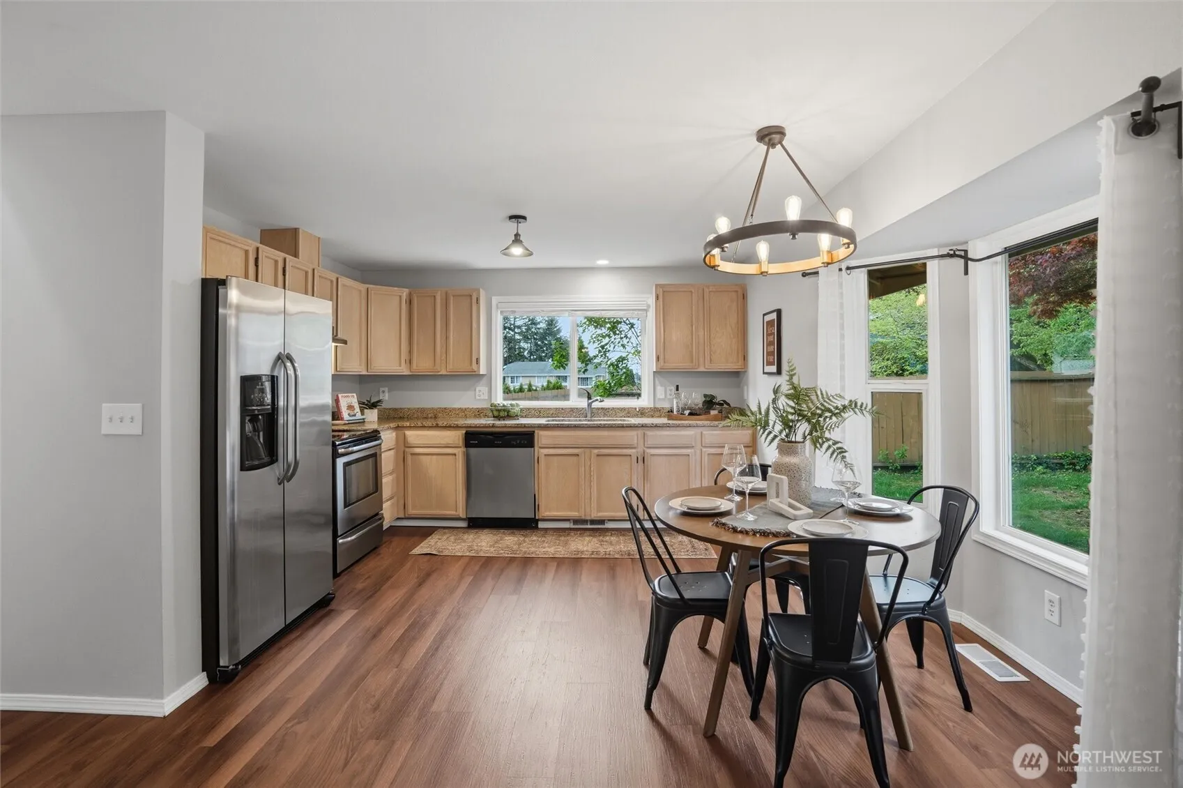 Perfectly placed between Poulsbo & Silverdale, this beautifully refreshed 3-bedroom, 2.5-bath home delivers the ideal blend of comfort, style & location. From the moment you step inside, soaring vaulted ceilings & abundant natural light create an inviting, airy ambiance that feels like home. The heart of the home is the thoughtfully designed granite kitchen, offering eating space & seamless flow into the cozy family room—perfect for everyday living or hosting. Step outside to a spacious deck overlooking a fenced corner lot, where summer BBQs, evening gatherings & backyard fun come naturally. Upstairs, retreat to a spacious primary suite featuring double closets & an updated bath, accompanied by two additional bedrooms offering flexibility for guests, work-from-home, or hobbies. Recent upgrades—including new LVP flooring on the main floor, fresh interior paint & central A/C—ensure modern comfort & move-in-ready ease. Beyond the home, enjoy a lifestyle that truly shines. Just minutes away, you’ll find local favorites like Silverdale Waterfront Park for scenic waterfront strolls, Old Mill Park with its charming boardwalk & beach access, and Nelson Park featuring playgrounds & open green space. Nature lovers will appreciate nearby access to Clear Creek Trail—a local favorite for walking, running, & enjoying the outdoors. All of this, plus quick access to shopping, medical, dining & both Bangor & Keyport Naval Bases, makes this location as convenient as it is desirable.
