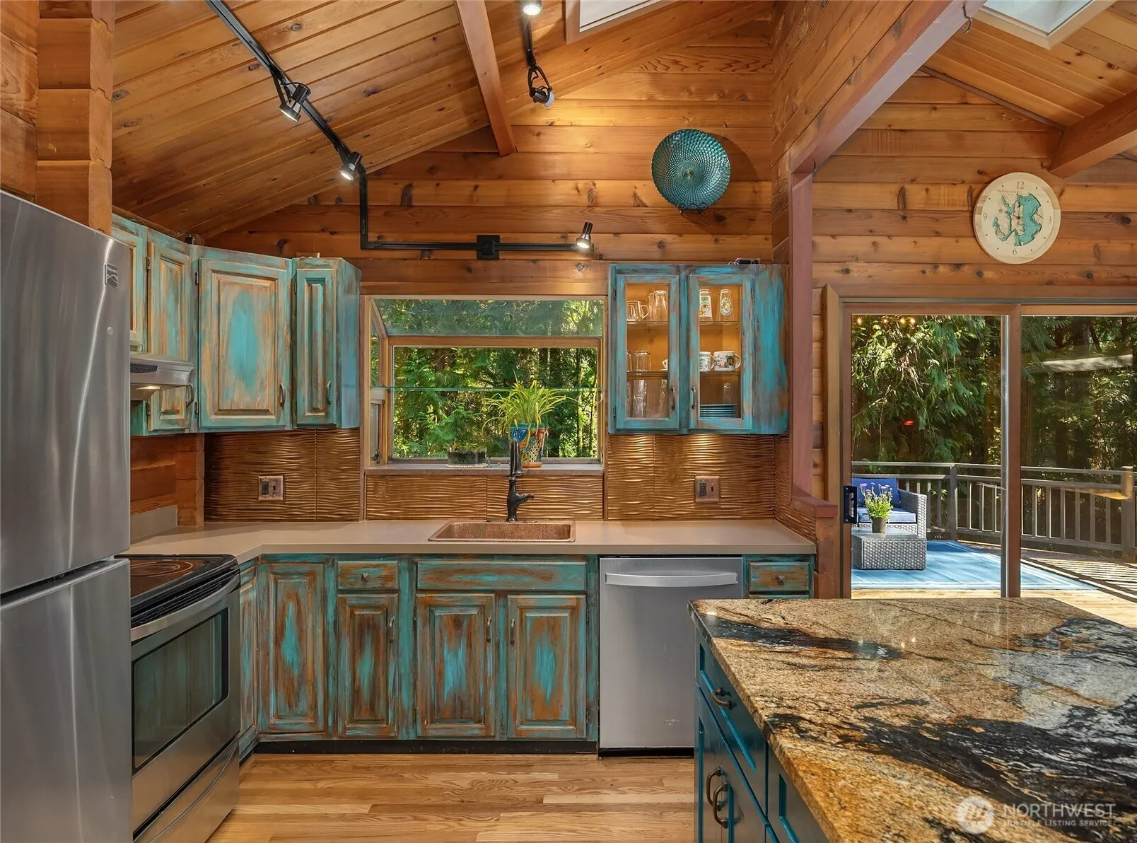 Tucked away on just over an acre in a serene, sun-dappled setting surrounded by evergreens in Bainbridge’s sought-after Rolling Bay neighborhood, this charming single-level home offers 3 bedrooms, an office, and a flexible bonus room, blending privacy, warmth, and island convenience. Built of cedar, with vaulted tongue & groove ceilings, exposed beams, and skylights, the home showcases classic Northwest cabin architecture and an open, airy atmosphere that draws the outdoors in. The inviting living room centers around a river rock fireplace, while refreshed kitchen finishes, remodeled baths, and hardwood floors bring modern comfort to this timeless cabin aesthetic. The kitchen opens seamlessly to the dining and living spaces with custom cabinetry, granite counters, and direct access to an expansive deck ideal for entertaining or peaceful evenings among the trees. A large bonus room with interior access, separate exterior entrance, and kitchenette offers versatility as a media room, art studio, home office, or guest suite. Outside, a single-car garage wired for level 2 EV charger, currently configured as a workshop, offers project space with easy potential to convert back to garage. Enjoy the expansive yard with a chicken coop & the tranquility of Bainbridge’s natural surroundings. Just a stroll to Rolling Bay’s corner market, neighborhood amenities, and Manitou Beach. About a 10-min drive to Winslow & the ferry terminal, with a nearby commuter bus offering easy Seattle access.