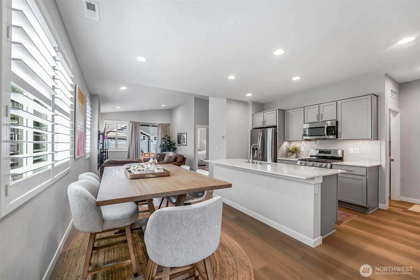 Beautifully designed home in the Tehaleh community featuring a sought-after main floor primary suite with a spacious walk-in closet and oversized shower, tall ceilings and doors. The open concept main level offers a bright great room, stylish kitchen with quartz countertops, oversized island, walk-in pantry, and under cabinet lighting, plus convenient main-floor laundry. Upstairs you’ll find two additional bedrooms, a versatile loft, and a full bath. Additional highlights include luxury vinyl plank flooring on the main level, central A/C, a covered patio expanded patio and walkway from front to back yard, fully fenced yard and in a premium location, attached 2-car garage. Enjoy all that Tehaleh has to offer, including parks, trails and a strong sense of community.