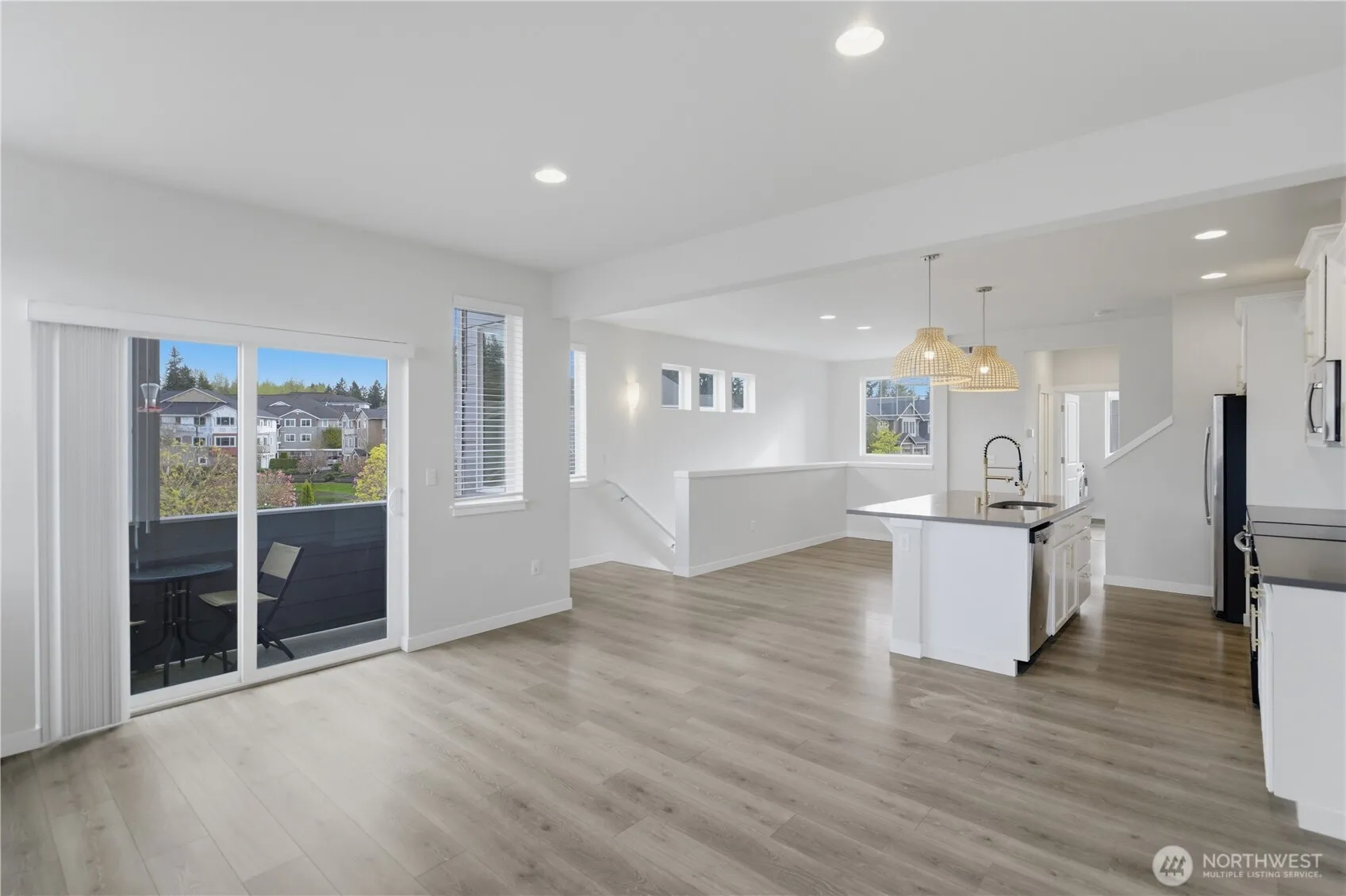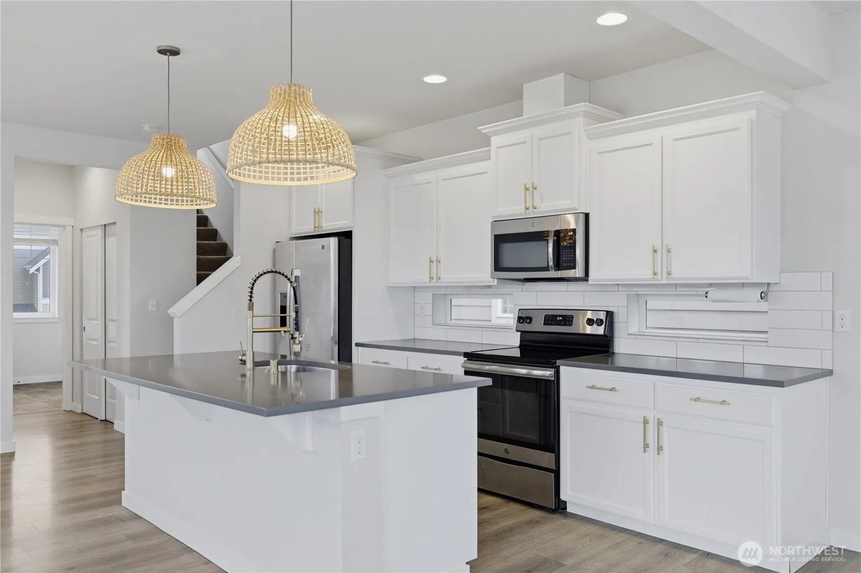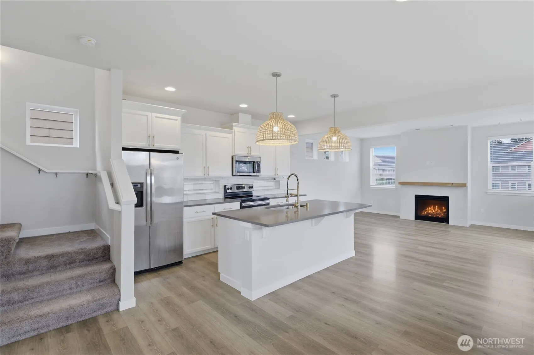Built in 2019 by Tru-North, this beautifully crafted home offers 4 bedrooms, 3.5 baths, a 2-car garage, and central A/C for year-round comfort. The thoughtfully designed open floor plan features a spacious family room with a tile-surround gas fireplace, seamless dining area, and access to a covered deck—ideal for entertaining or relaxing. The light-filled kitchen showcases white cabinetry, quartz countertops, and stainless steel appliances. The generous primary suite includes a spa-inspired bath with double vanity, glass shower, and walk-in closet. A convenient main-level en-suite provides flexibility for guests or multi-generational living. Professionally landscaped grounds and a gated entry complete this move-in-ready home! Homeowners also have the option to pay for access to the pool, gym, and clubhouse located in the condominiums just across the street.