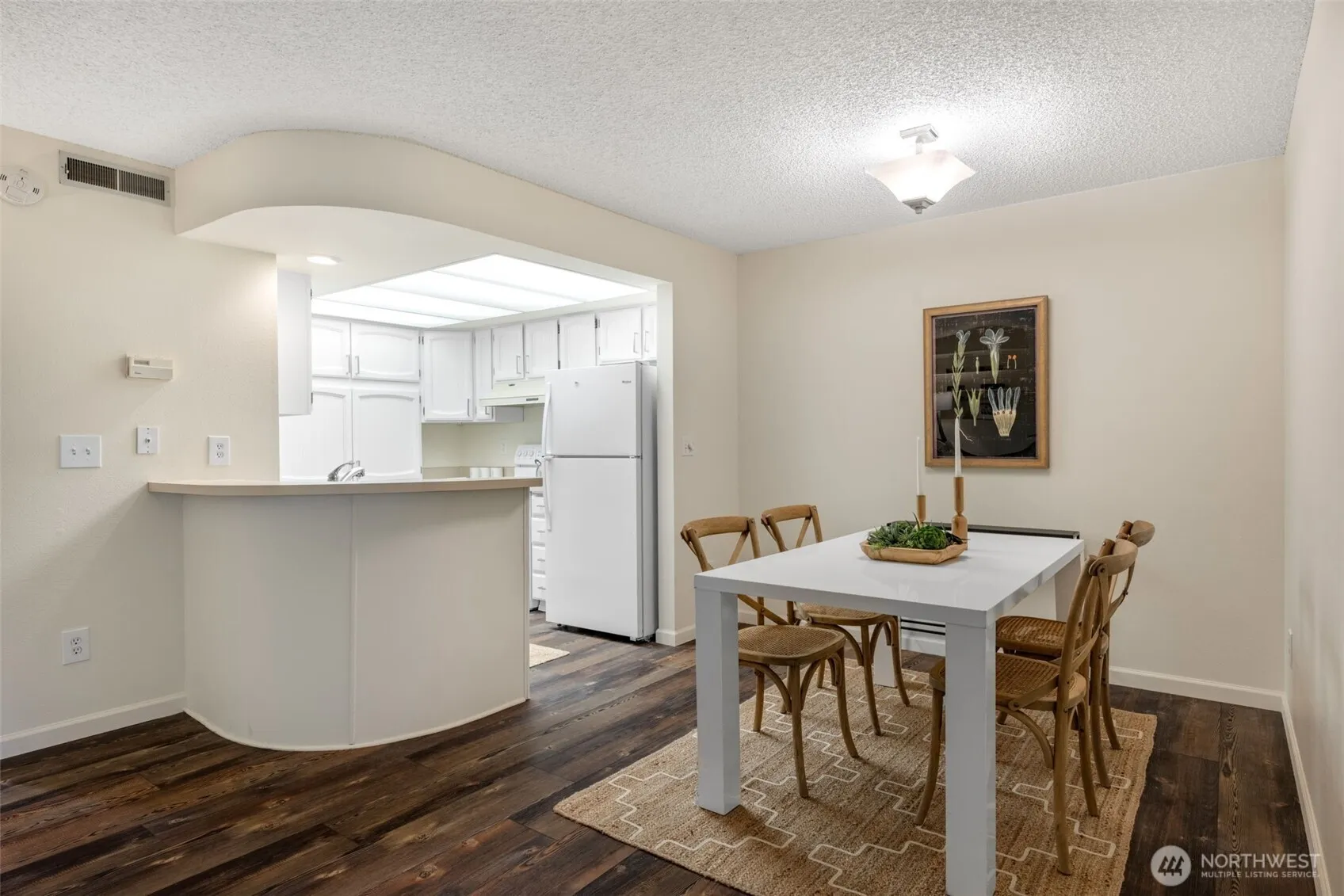 This charming end-unit North Juanita condo is calling! Featuring brand-new rich hardwood floors throughout, spacious kitchen with freshly painted cabinetry, and room for a 6+ person dining table to host all your loved ones. The living room centers around a wood-burning fireplace, while a covered patio surrounded by blooming flowers and greenery invites quiet mornings outdoors. Two bedrooms offer flexibility for everyday living, with one easily imagined as a quiet work-from-home retreat. A well-maintained heat pump ensures comfort through every season, and an abundance of cabinet space allows for a plethora of storage. Residents enjoy access to a private, gated community pool, hot-tub and clubhouse, along with an on-site storage unit, covered designated parking, and in-unit washer and dryer. Well-maintained HOA with no rental cap, and pet-friendly! Nearby Downtown Juanita favorites include Café Juanita, Sparrow, Urban Coffee Lounge, Juanita Beach Park, plus all that Totem Lake Village has to offer just moments away. Live where errands are easy, trails are close, and Kirkland’s energy is always just around the corner. A warm and welcoming retreat awaits!