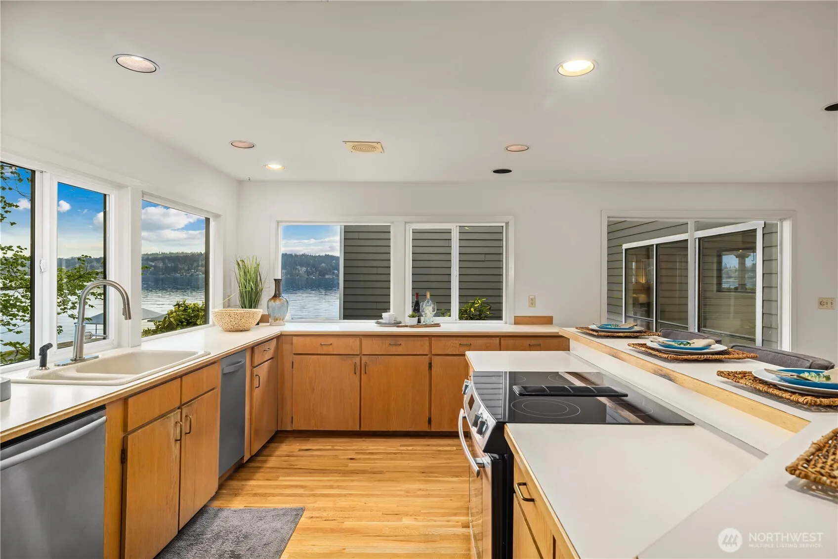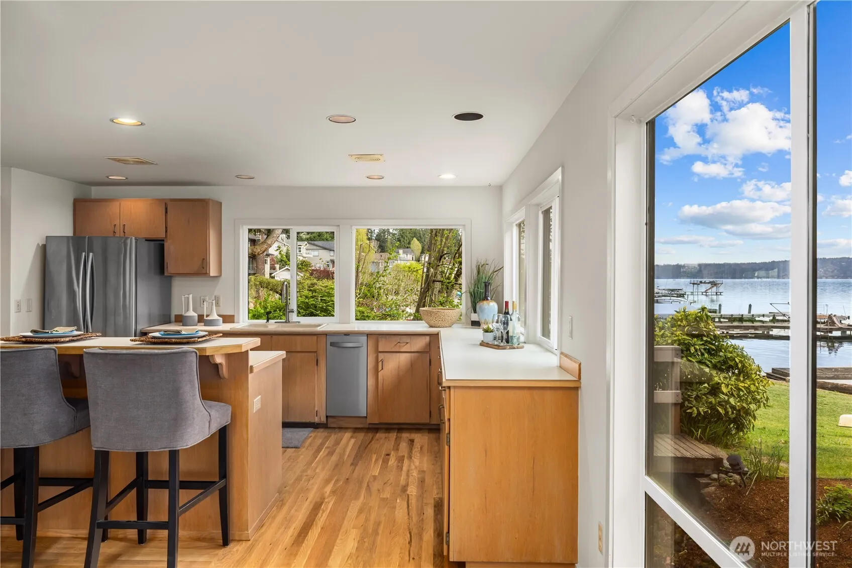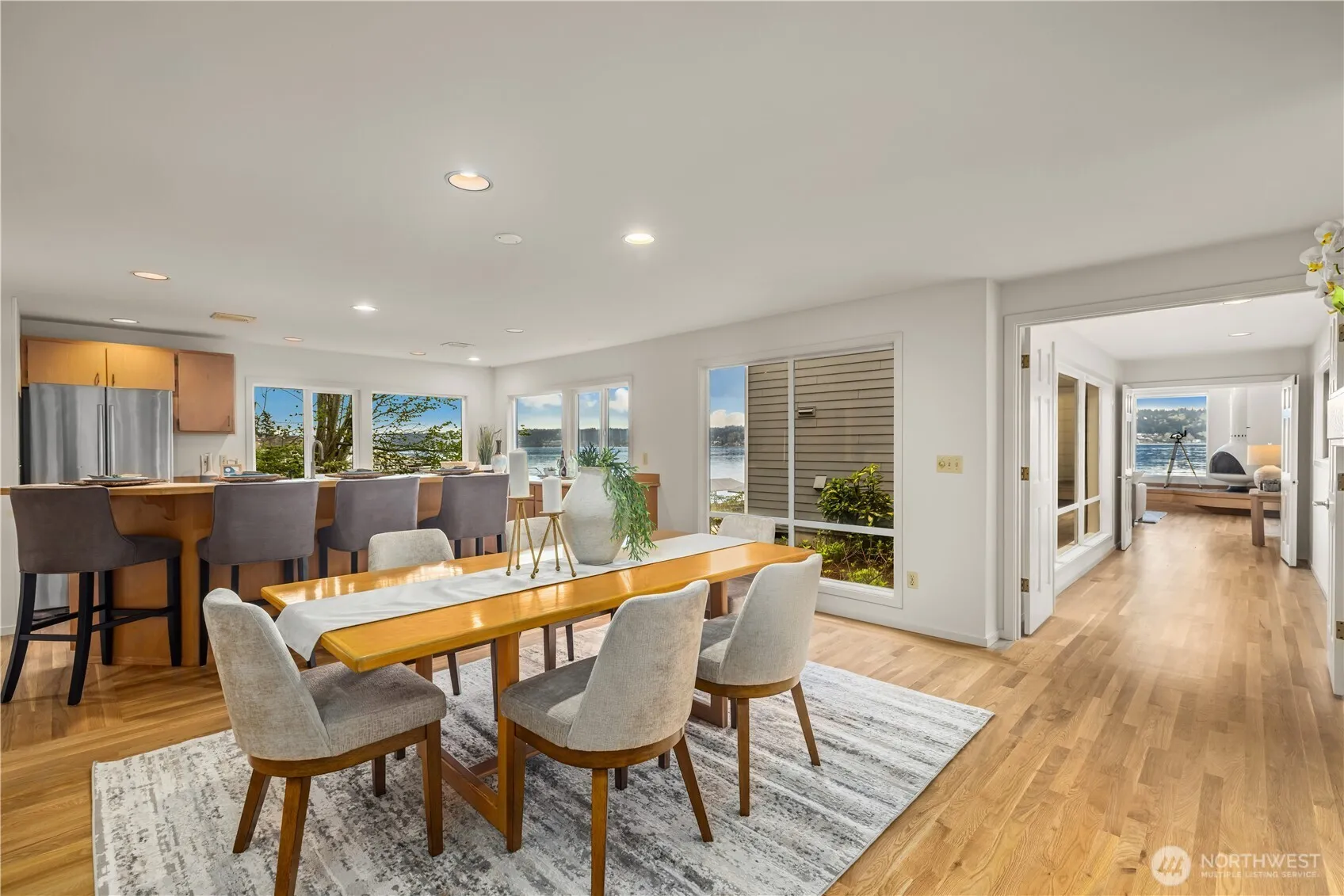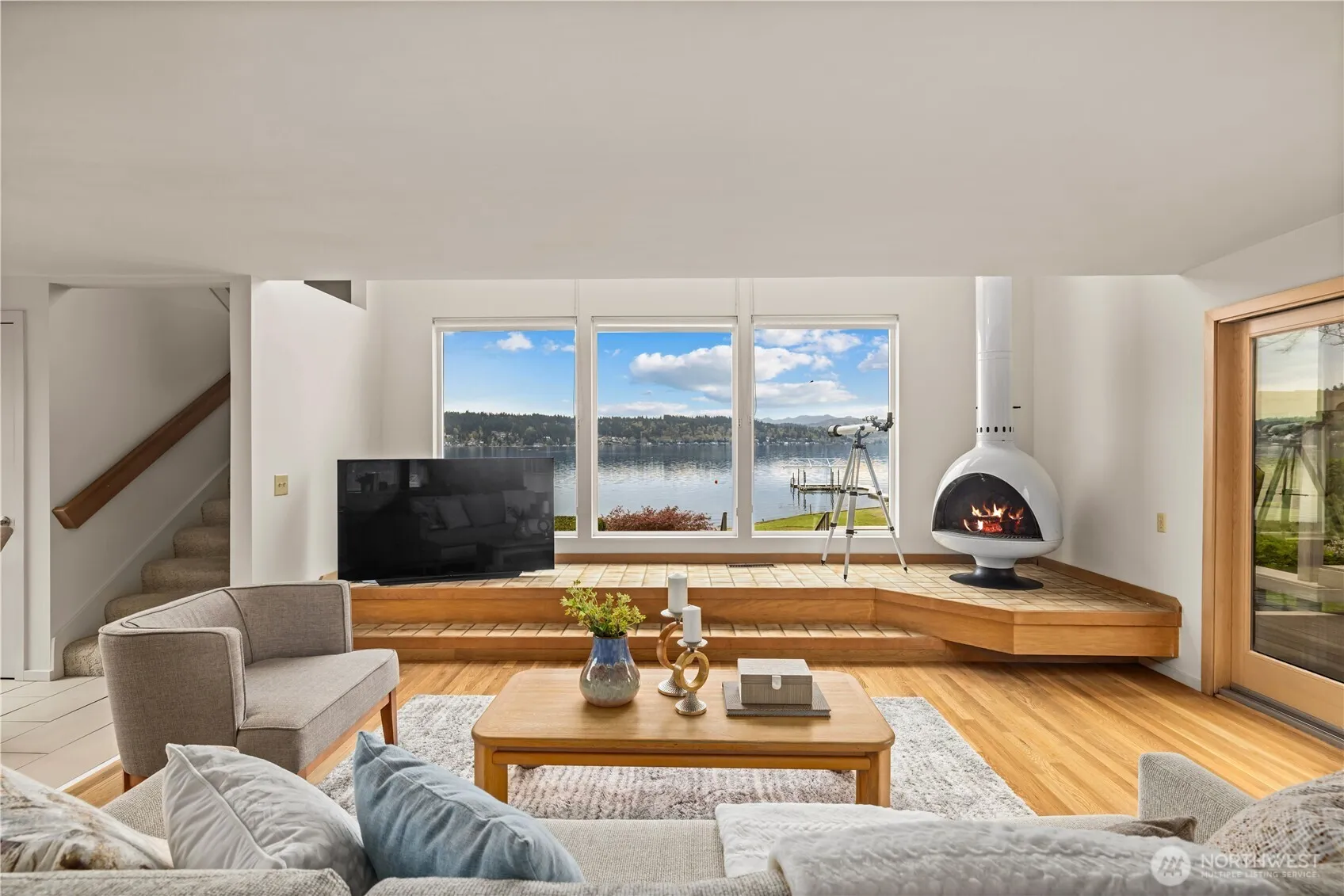 Perfectly positioned on a shy half acre stretch of West Lake Sammamish shoreline, this serene estate offers an elevated waterfront lifestyle with 75 feet of shoreline, sweeping eastern views, and a closer-to-water setting that can no longer be replicated. Begin on the expansive deck beneath a pergola strung with soft lighting, where mornings start with sunrise reflections across the lake and evenings unfold around the dining table overlooking the water. The lawn extends gently to the shoreline, with a stone firepit creating a natural gathering place, while a stream winds through the property, adding a gentle rhythm to the grounds. Inside, soaring ceilings and walls of windows frame the lake, filling the main living room with light and reflecting across new oak hardwoods. The kitchen, appointed with high-end JennAir appliances, connects seamlessly to dining and gathering spaces. The primary suite extends the lake experience, with views to the water and a spacious en-suite bath with jetted spa for unwinding at day’s end. With 4 bedrooms, two kitchens, and dual living spaces, the home offers flexibility without compromising comfort. A secondary living area with panoramic views and a sleek fireplace rounds out a residence that lives as beautifully as its setting suggests. Minutes from downtown Bellevue and Issaquah, with easy access to I-90 and WA-520, offering the tranquility of waterfront living without sacrificing connection to the Eastside’s best dining, shopping, & trails.