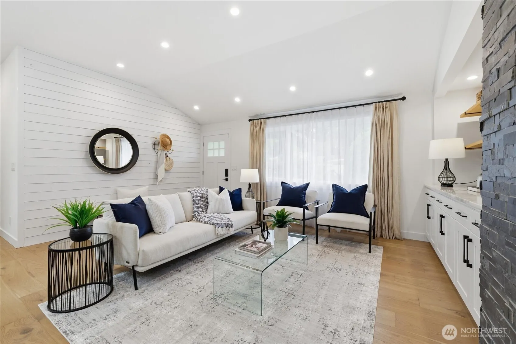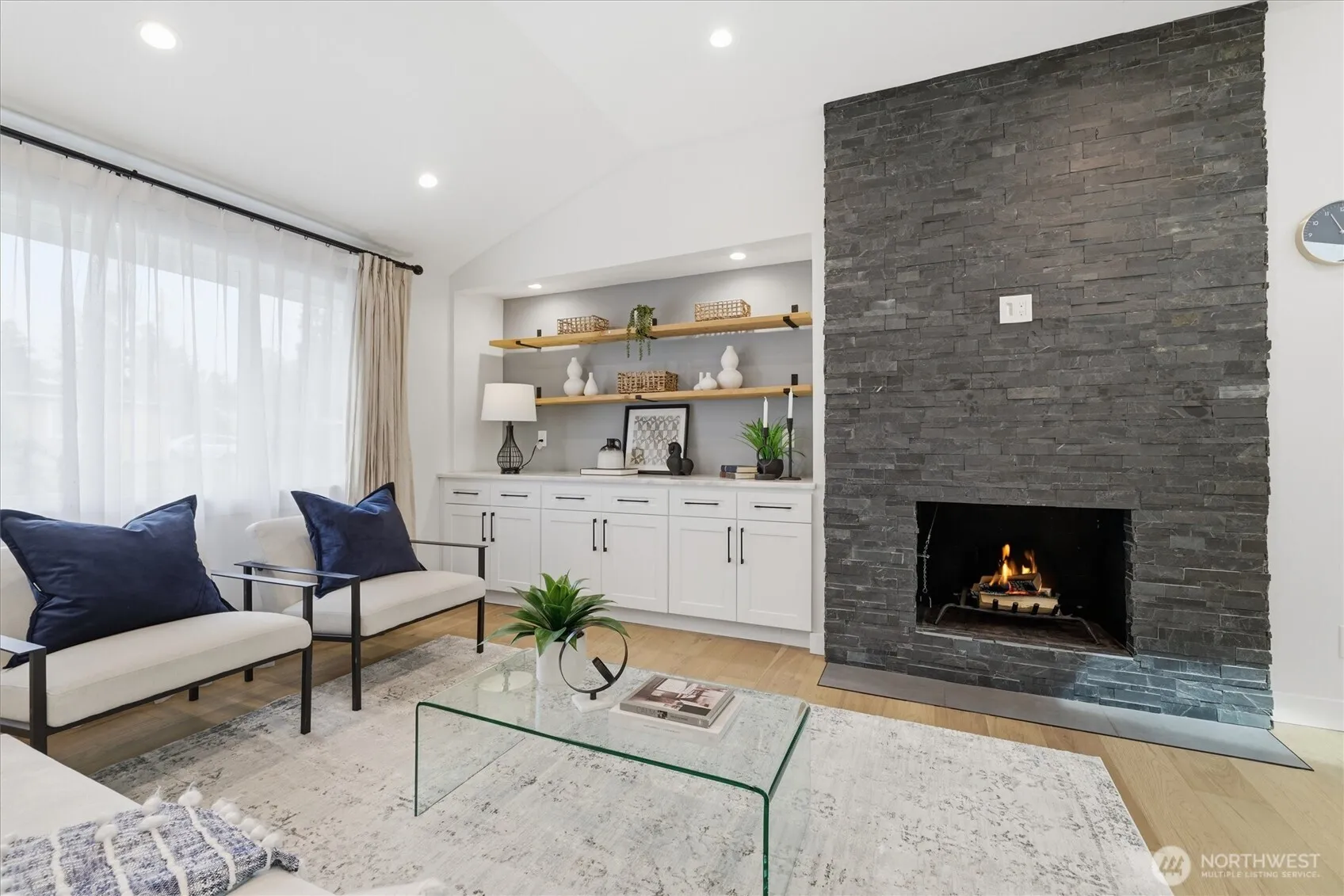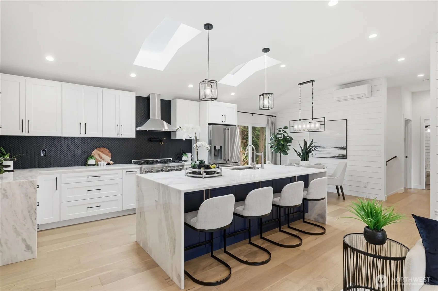 Thoughtfully designed spaces and modern upgrades define this Bellevue home offering both style and flexibility. The main level features an open-concept layout with vaulted ceilings and skylights that bring in abundant natural light. At the heart of the home, the kitchen impresses with marbled surfaces, a 9-foot waterfall island, stainless appliances, and a newer high-end reverse osmosis water filtration system. The primary suite includes a luxurious 5-piece bath with heated floors and a Toto washlet for added comfort. A finished lower level with wet bar and fireplace provides endless possibilities—media room, recreation space, or guest retreat. A/C mini splits ensure year-round comfort, while the finished 1-car garage offers EV charging and abundant storage, complemented by a generous driveway and RV parking. The backyard features a deck, patio, and mature fruit trees—including plum and pear—creating a peaceful outdoor setting. Conveniently located minutes to Microsoft, parks, shopping, dining, and major commute routes for effortless living.