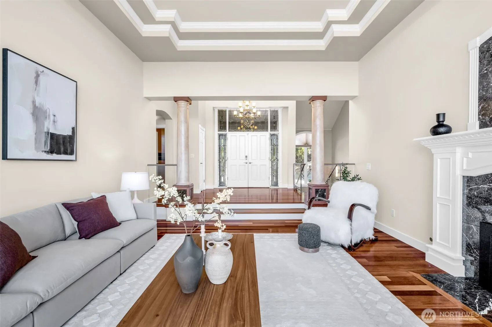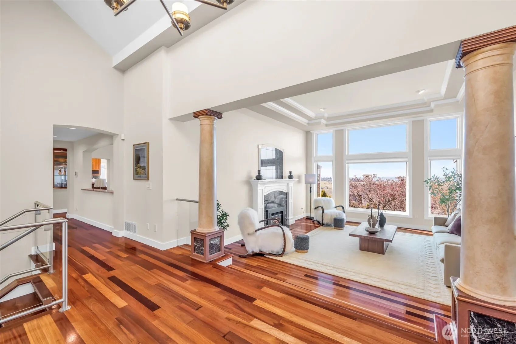 Stunning estate in the coveted Summit community showcasing breathtaking panoramic views of Mt. Rainier, Mt. Olympus, Newcastle Golf Course, and Lake Washington. Soaring vaulted ceilings, rich Brazilian cherry hardwoods, and expansive windows with skylights bathe the home in natural light and capture unforgettable sunsets. Luxurious main-level primary suite offers tranquil views and a private solarium retreat. Spacious layout includes three additional bedrooms plus an office/optional 5th bedroom. Elegant living spaces, a stylish kitchen with view nook, and inviting family room create the perfect setting for everyday living and entertaining. Unwind in the rec room, indoor spa, sauna, and second solarium. Over $100K invested in a beautifully renovated backyard, plus a new generator. Complete with A/C, 3-car garage, 24-hour security, and access to top-rated Bellevue schools, clubhouse, pool, tennis courts, and fitness center—resort-style living at its finest.