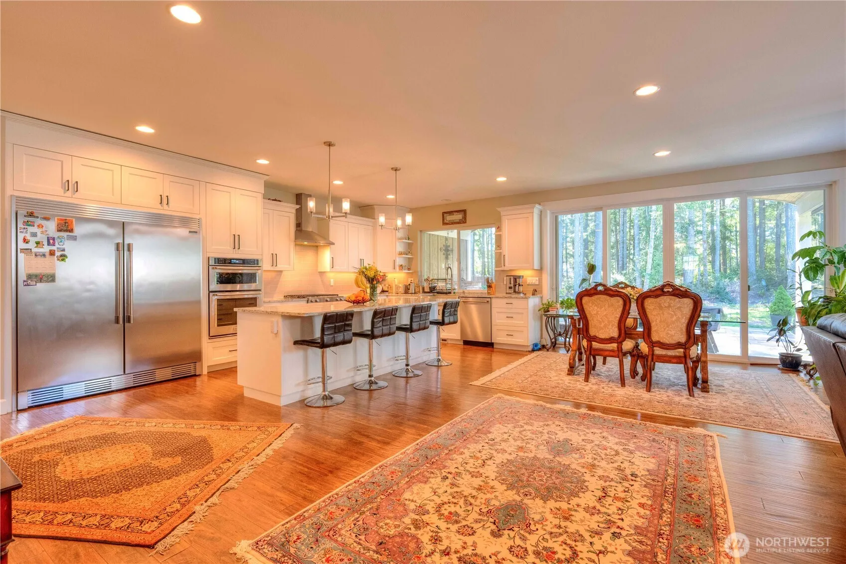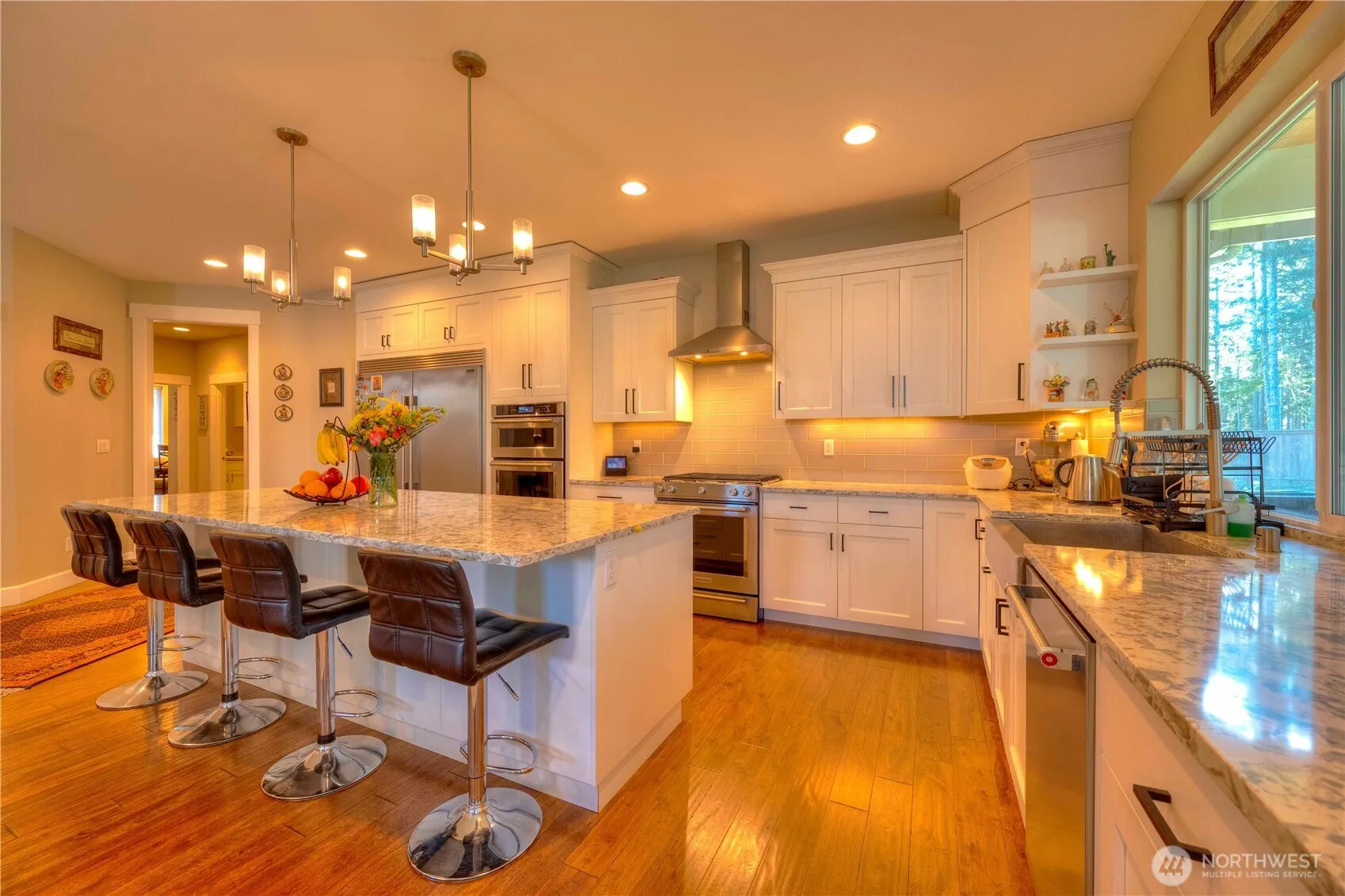 Main level living at its finest! The Woodlands at SilverHawk presents a home on 1.5 acres. This massive 4 bedroom 2.5 bath 3,141 square foot rambler offers formal dining, & covered back patio with a fireplace! Hardwood floors, kitchen boasts quartz counters, Huge Fridge/Freezer, Double Ovens, Farm Sink & White Cabinets. French doors into Master with Spa-inspired ensuite & huge walk-in closet. Heat pump with AC. Upgrades galore! Spacious 1,021 square foot 4 car garage with room to fit 6 cars. Tons of privacy within this gated community! All appliances stay. Original owner. Meticulous care. Home backs up to a greenbelt. Excellent some of the top schools in the state.