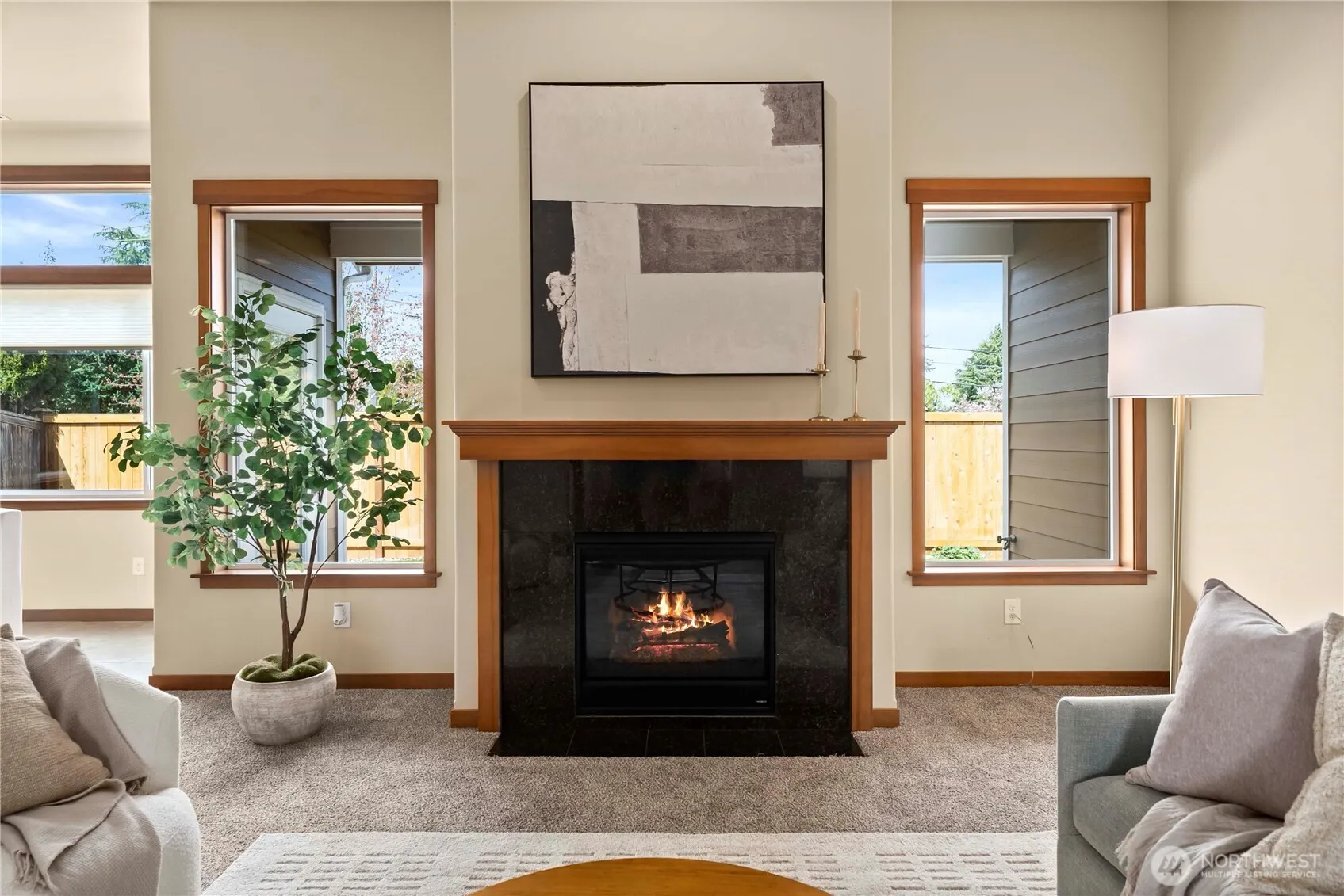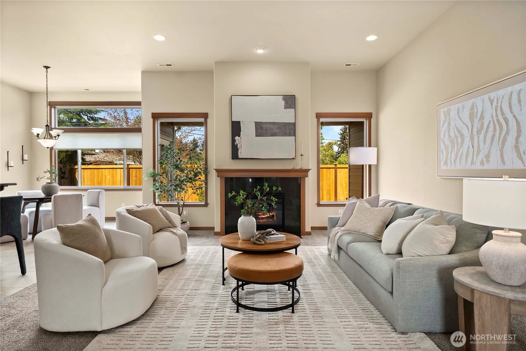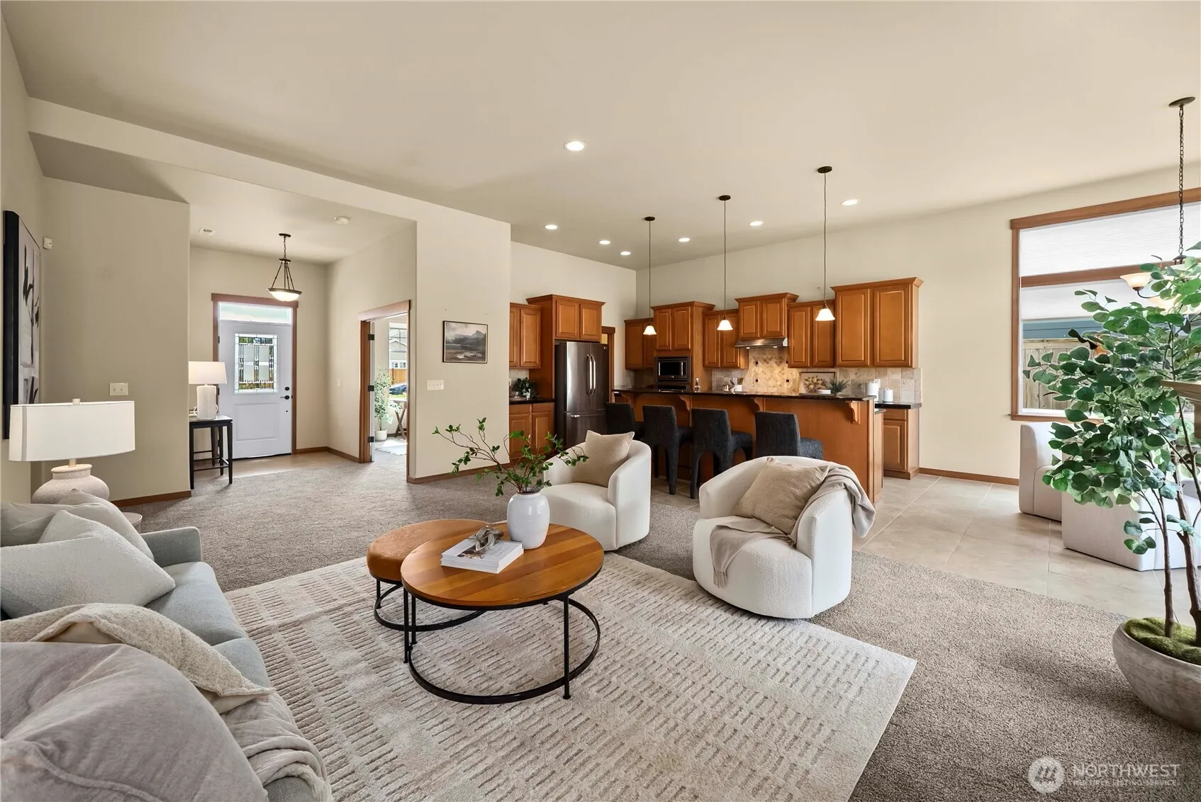 Welcome to The Boulders, in the heart of University Place—a highly sought-after enclave of meticulously maintained homes. This beautifully designed single-level residence offers 1,737 square feet of effortless living with not a stair in sight. Step inside to a light-filled, open-concept layout featuring soaring ceilings and oversized windows that create an inviting, airy atmosphere. Fresh new carpet pairs seamlessly with tile flooring, while rich dark wood cabinetry and granite countertops add a touch of elegance throughout the well-appointed kitchen. A large central island with bar seating, gas range, and walk-in pantry flows easily into the adjoining living and dining areas—perfect for both everyday living and entertaining. The spacious primary suite offers a private retreat with its own bathroom, complemented by a second bedroom, a generous laundry room, and a versatile third bedroom or office with French doors. Enjoy the fully fenced, private back patio—ideal for relaxing or hosting—along with the convenience of a two-car attached garage. Located within top-rated University Place schools and just minutes from Chambers Bay, Trader Joe’s, Whole Foods, and a variety of local dining and shopping options, this home combines comfort, style, and an unbeatable location.