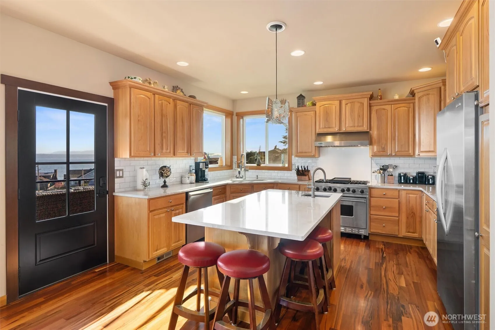 First Time on the Market! Stunning 3 bed 2.5 bath custom rambler with a front-row seat to the Pacific NW. Expansive views of Port Susan Bay, Mount Baker and the Cascade Mountain Range create a stunning backdrop throughout this home. Living area highlights warm tigerwood floors, vaulted ceilings, and a cozy dual-sided gas FP. Open kitchen offers hickory cabinets, granite counters, SS appliances, wine fridge, & breakfast bar. Primary suite enjoys gorgeous views with deck access, and 5-piece ensuite with heated floors. Spacious composite deck spans length of home, perfect for entertaining or just soaking in the views. ADU potential in unfinished basement with separate access, designed with the future in mind. Home also provides 3-car heated garage, whole-home auto generator, and ample parking for all your needs, including a 50-amp RV outlet. Community beach access just around the corner. This home has it all!