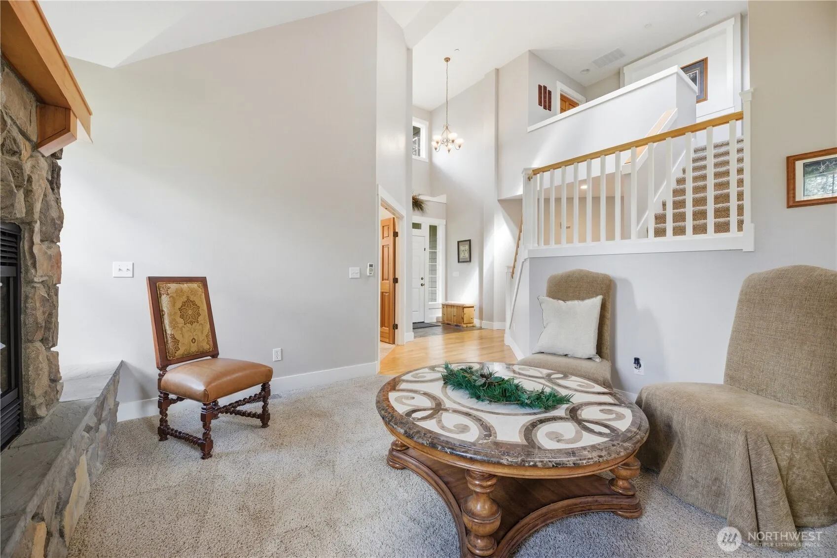 Gated entry welcomes you to this impressive 4,077 SF custom built home on 1.24 acres, designed for elevated living. The kitchen features quartz counters, a gas range, SS appliances, soft close drawers & an eating nook opening to a covered back patio with Trex decking—wired for a hot tub & overlooking your own private putting green. The main living room off the kitchen offers a gas fireplace, while the grand formal living room showcases a vaulted rock gas fireplace. A formal dining room with coffered ceilings & tongue & groove accents, along with skylights, fresh interior paint, hardwood floors & a main floor office with soaring ceilings adds function. Upstairs offers 3 bedrooms, a laundry room + an impressive primary suite with dual sinks, a soaking tub surrounded by extensive stonework, a large walk-in tile shower, a walk-in closet & French doors leading to a private balcony. The lower level lives like its own residence with 2 additional bedrooms, a kitchen, living room, office/den, full bath, separate laundry & private access—ideal for multigenerational living or rental income. Additional highlights include a water filtration system, heat pump with A/C (2024), new roof (2025), RV parking, no HOA, partially fenced, epoxy floors in the 3 car garage & a community well with a new pump. Luxury & privacy make this home truly stand out.