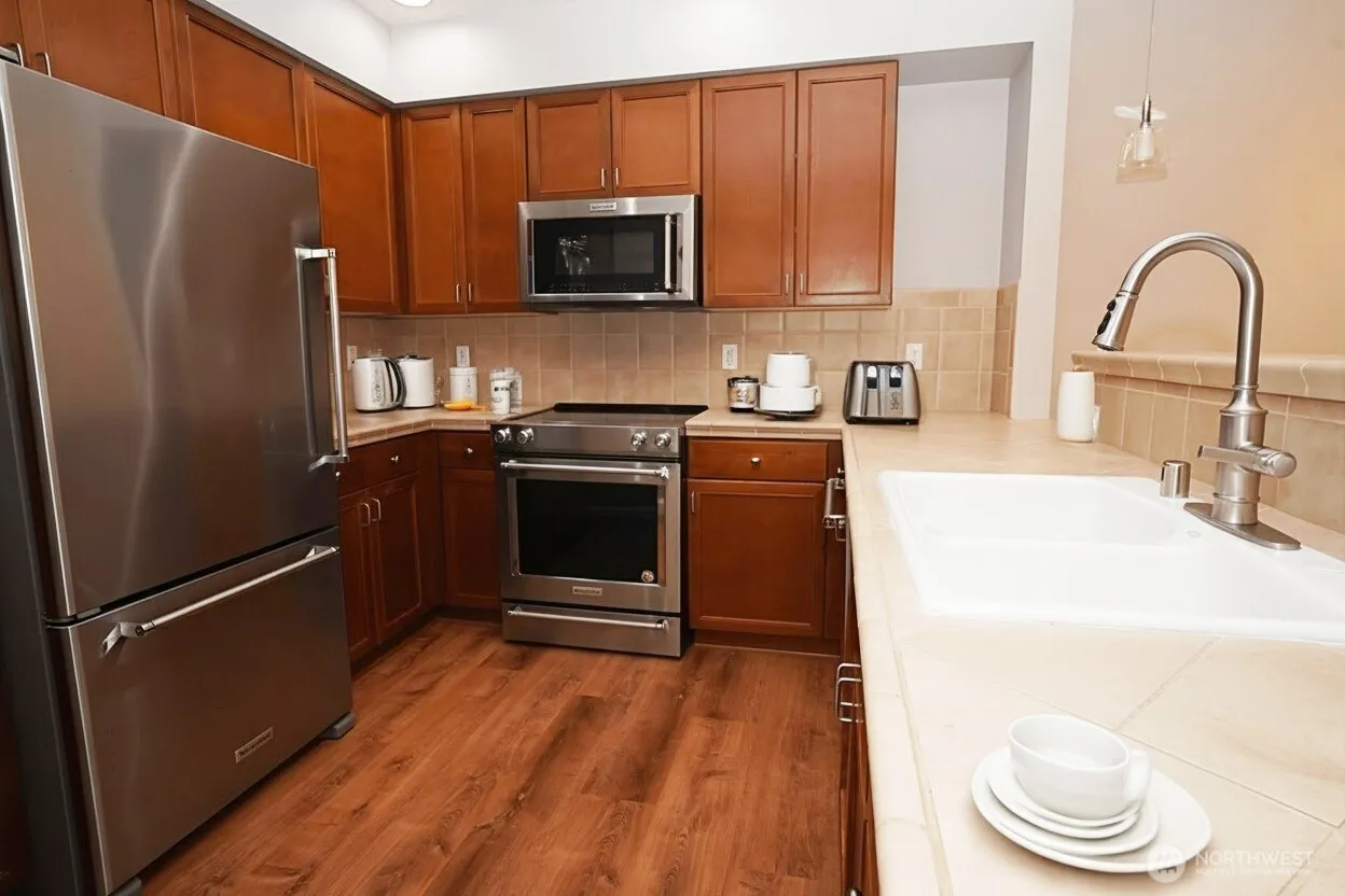 Experience the best of downtown Bellevue at Library Square! This rare corner condo with no shared walls offers unmatched privacy and quiet right in the city’s core. Featuring 990 sq ft, this 2-bedroom, 2-bath layout is bright and open with a modern kitchen, stainless appliances, bar seating, and a private balcony for year-round enjoyment. The spacious primary suite includes a walk-in closet and ensuite bath, complemented by a full second bath. Two deeded parking spaces, a well-managed HOA and no rental cap make this home a fantastic choice for buyers or investors alike. All just steps from Bellevue Library, shopping, dining, and the upcoming light rail!