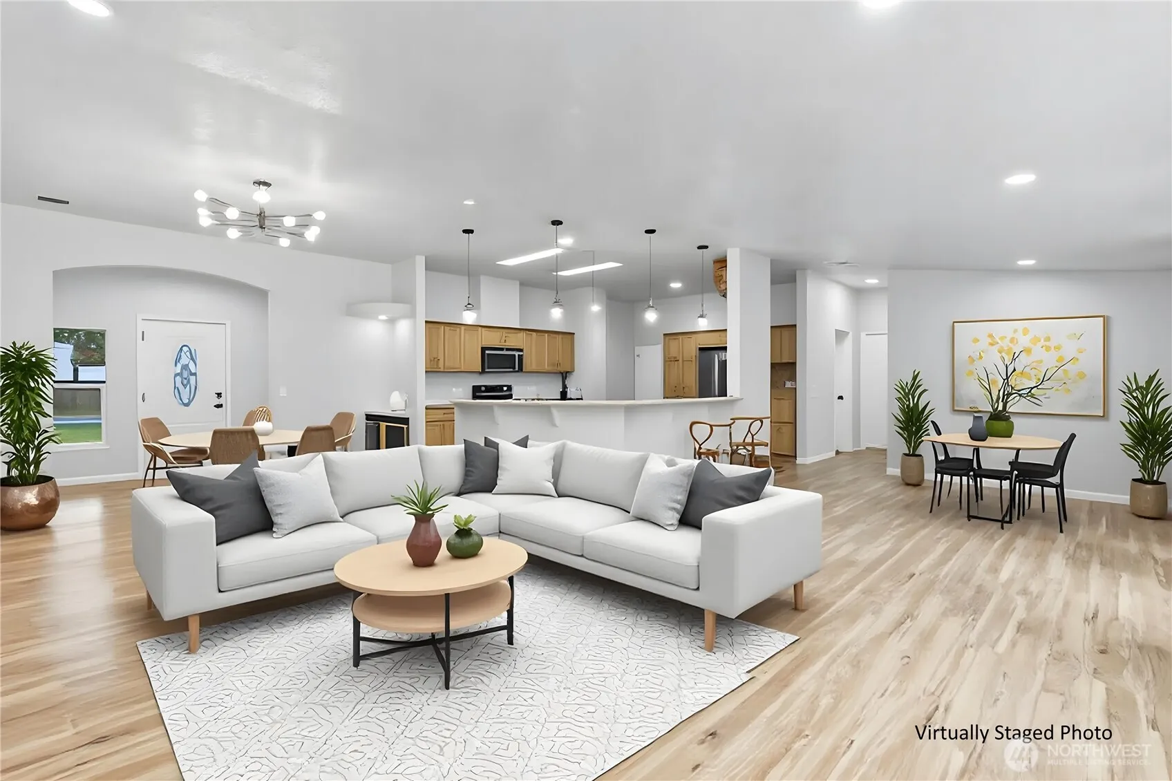 Fully renovated and move-in ready, this spacious 2006 home on its own lot offers exceptional value, flexibility, and room to grow. Featuring 5 bedrooms and 2.75 baths, the single-level layout is ideal for multi-generational living, shared households, or buyers needing space for a home office or guests. The expansive primary suite includes a private bath with double vanity, jetted soaking tub, and walk-in closet.The updated kitchen is the heart of the home, complete with new sink, hardware, generous pantry, and ample prep space, flowing seamlessly into oversized living and dining areas. Enjoy indoor-outdoor living with direct access to a wrap-around deck and patio—perfect for entertaining, summer BBQs, or relaxing in the fully usable backyard.Major upgrades include a new roof (2023), new water heater, fresh interior paint, and updated lighting throughout. A separate utility room with washer/dryer adds convenience, while the oversized attached garage offers high ceilings, storage, and flexible parking.Designed with accessibility in mind, including ramp entry and a large rear porch. VA & FHA financing welcomed. Ideally located near JBLM, major employers, shopping, dining, and commuter routes with easy access to Tacoma and Lakewood.A rare opportunity to own a fully updated home with land, space, and versatility—schedule your showing today!