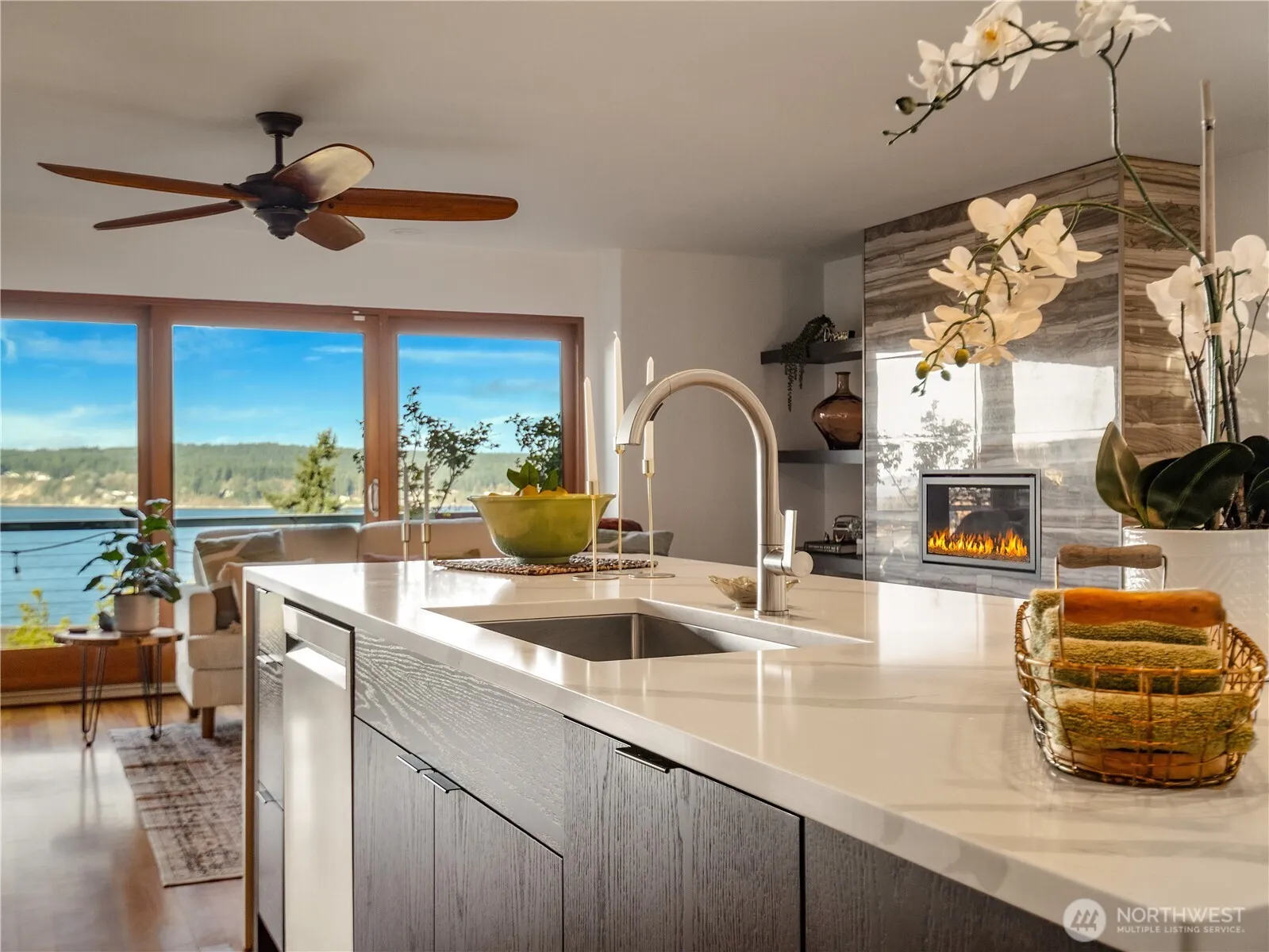 Perched high on the hill in desirable University Place, this stunning 3-bedroom, 2.5-bath home captures spectacular, unobstructed views of the Puget Sound and mountains from multiple vantage points. Large windows throughout fill the home with abundant natural light, perfectly framing the breathtaking scenery.The home features fresh interior paint, beautiful hardwood floors, and an open-concept layout designed for comfortable living and entertaining. The remodeled kitchen boasts stainless steel appliances, modern finishes, waterfall quartz island, and flows seamlessly into the main living area where you’ll find a cozy fireplace and access to the view deck and patio, ideal for enjoying sunsets and the surrounding landscape.The spacious primary suite includes a huge walk-in closet, providing excellent storage and comfort. Outside, the property features mature landscaping and a beautifully terraced yard, offering both charm and usable outdoor space. For relaxation; take a soak in the hot tub that is located in the private back yard. Additional highlights include a two-car garage plus a two-car carport, providing ample parking and storage. With its elevated setting, open design, and unforgettable views, this home offers a rare opportunity to enjoy scenic Northwest living at its finest.