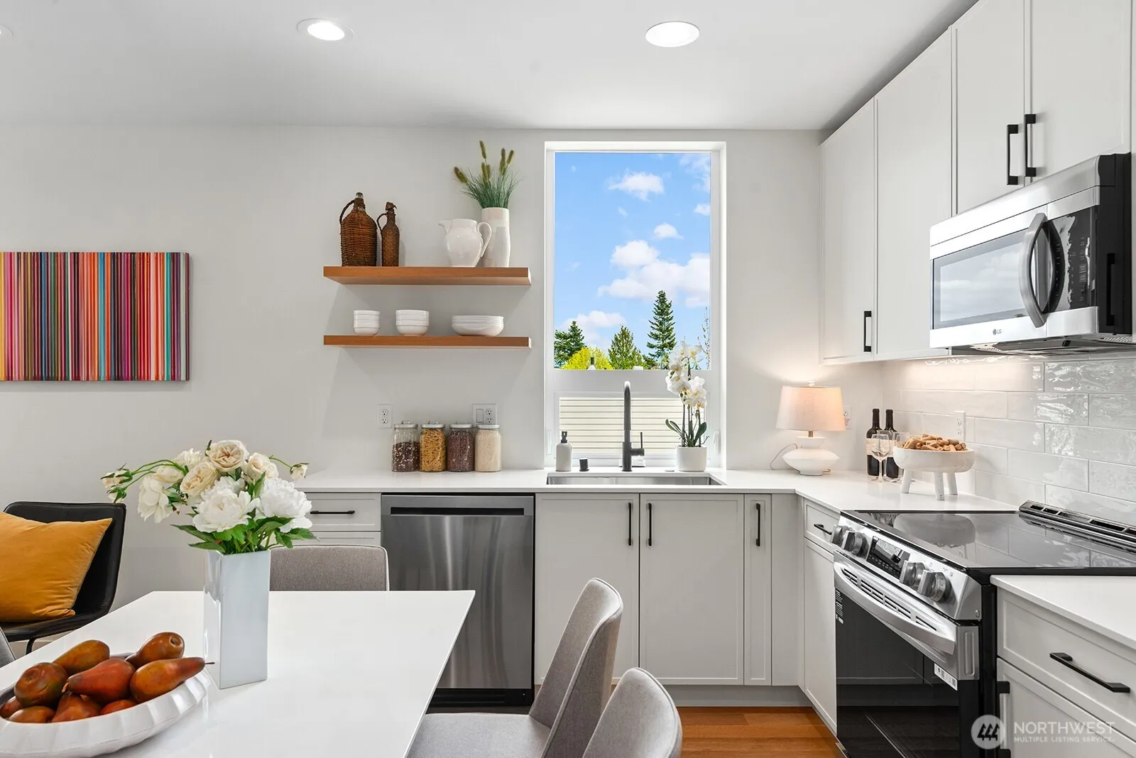 Stunning new construction by Build Sound, ideally positioned in the heart of Wallingford. This thoughtfully executed home offers crisp modern architecture, clean lines, real hardwood floors, elevated finish quality, abundant natural light, and picturesque Seattle views. The entry level features a spacious bedroom with a private en suite full bath—perfect for guests, a home office, or flexible living. On the second floor, enjoy bright open-concept living anchored by a chef’s kitchen with custom cabinetry, quartz countertops, stylish backsplash, and stainless steel appliances. The third level serves as a serene primary retreat, complete with a luxurious en suite bathroom. Crowning the home is an expansive rooftop deck offering sweeping views of the Olympic and Cascade Mountains, the Space Needle, and Lake Union—an ideal setting for entertaining or unwinding. With a Walk Score of 91, you’re steps from Wallingford’s vibrant collection of shops, restaurants, cafes, parks, and more. Additional highlights include dedicated EV ready off-street parking, mini-splits for efficient heating and cooling, additional storage, and convenient access to I-5 and Highway 99. If you’re seeking well-located new construction that’s built to last, this exceptional home delivers.