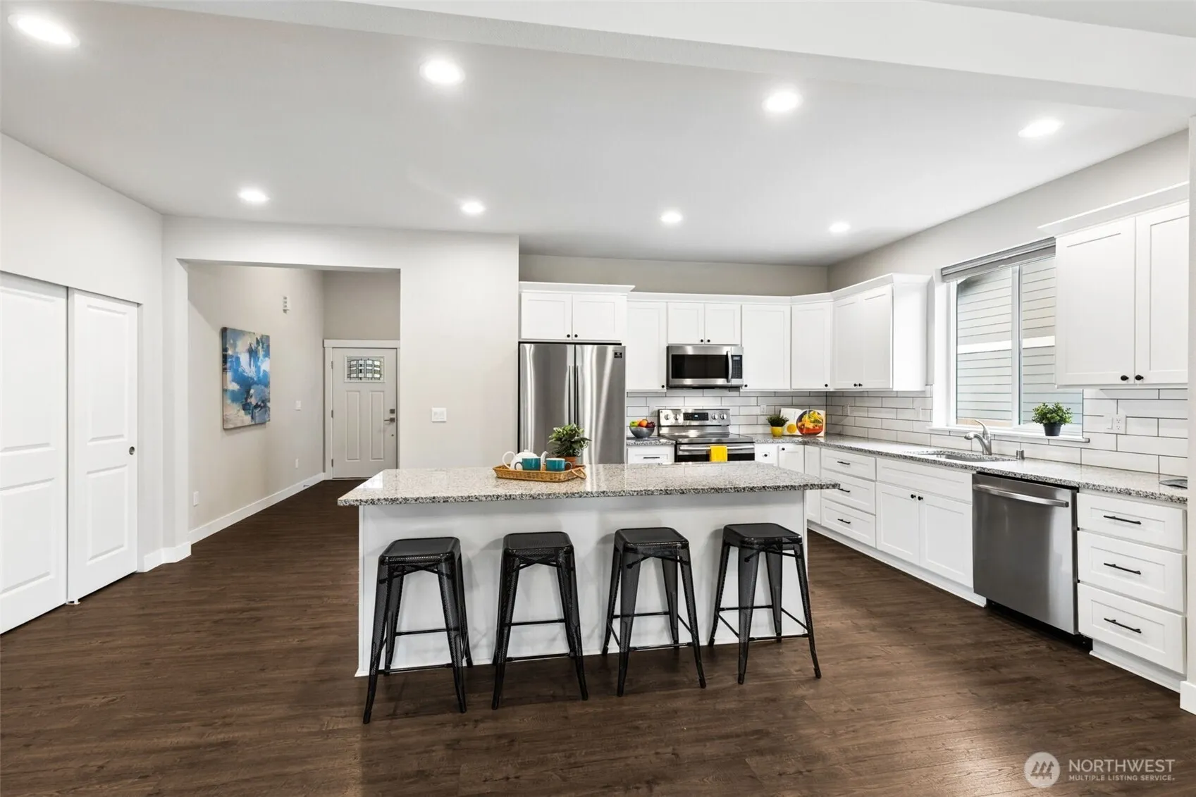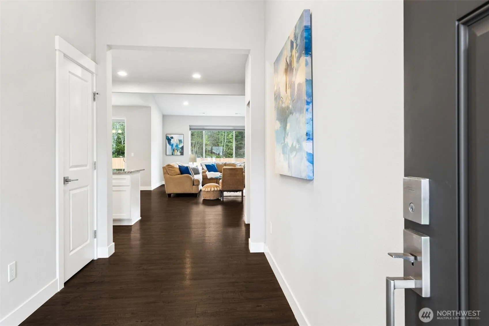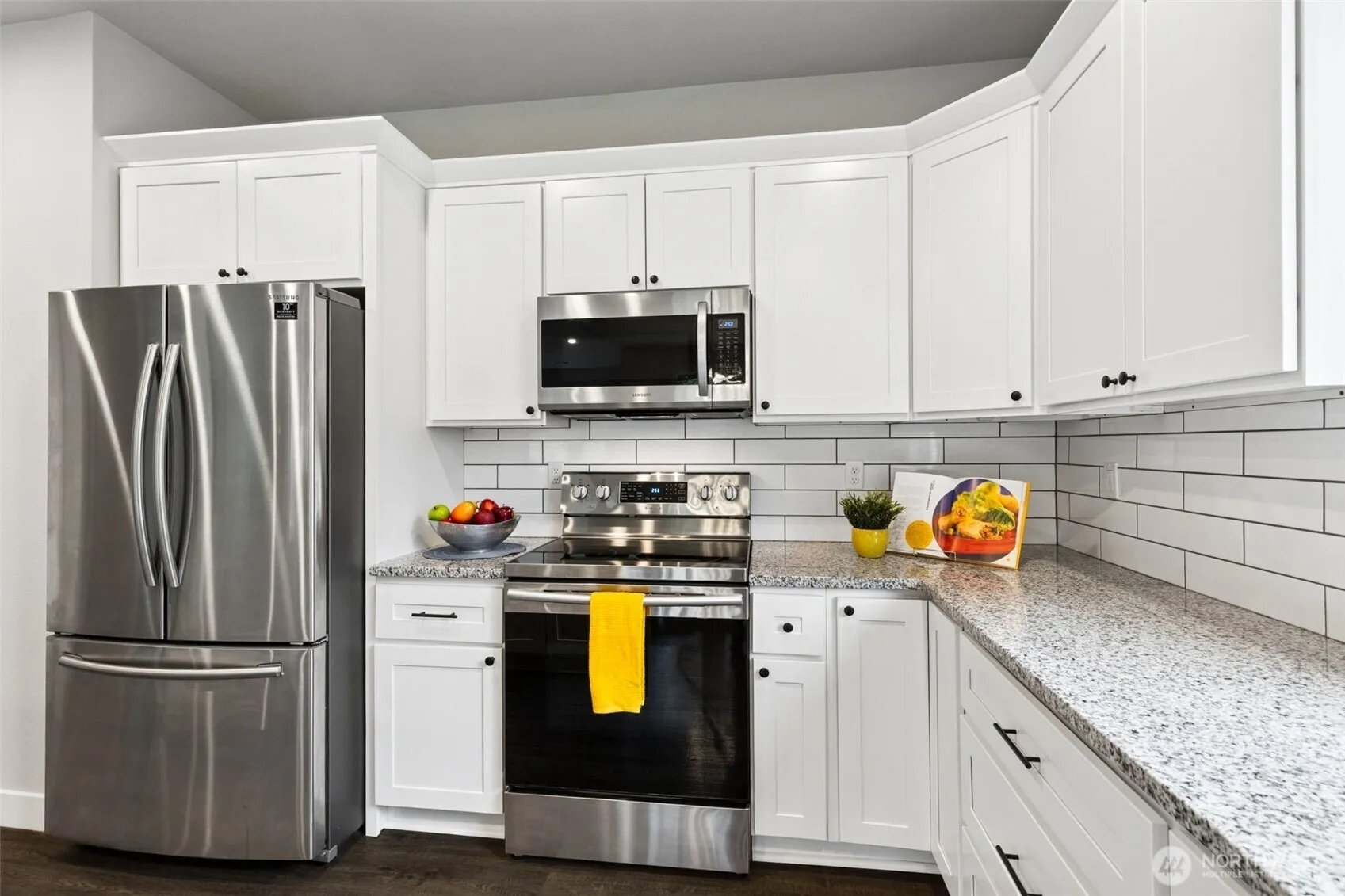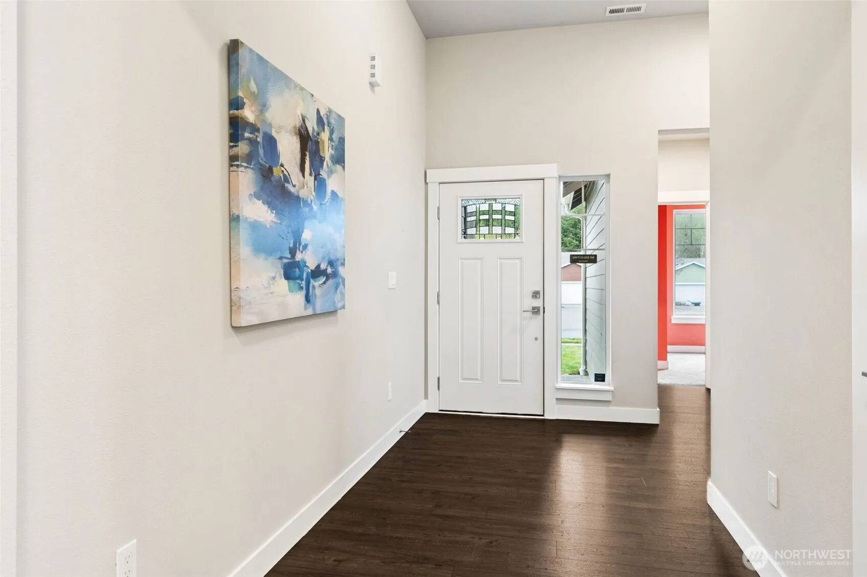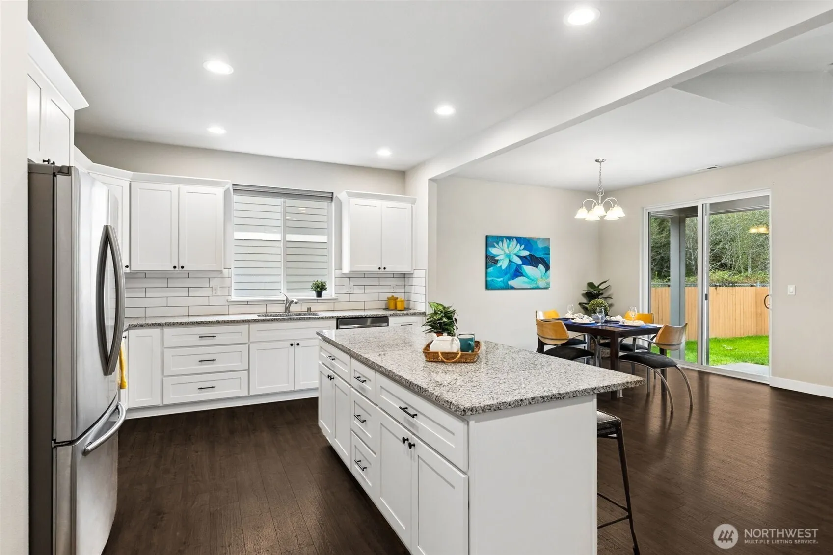 Bright and spacious in Summit Place! Sweet single story home on a fully fenced, large greenbelt lot, situated at the end of a cul-de-sac! Smart split floorplan allows privacy for the primary bedroom toward the back of the home. Lovely en-suite with dual vanity, granite counters, tile floors and walk-in closet. One bedroom has french doors. High ceilings, vaulted ceiling in living room, open kitchen, dining, living space– plus a fun, built in electric fireplace! Custom cabinetry with granite counters, stainless appliances, gracious island for gathering and ample storage with pantry! Luxury vinyl plank flooring throughout living areas/kitchen, custom interior mill work, exterior siding accents and covered back patio space! High efficiency furnace (recently serviced). No HOA, no neighbors behind you, 20 min to Oly’s Westside! Bedrooms/Bathrooms virtually staged.