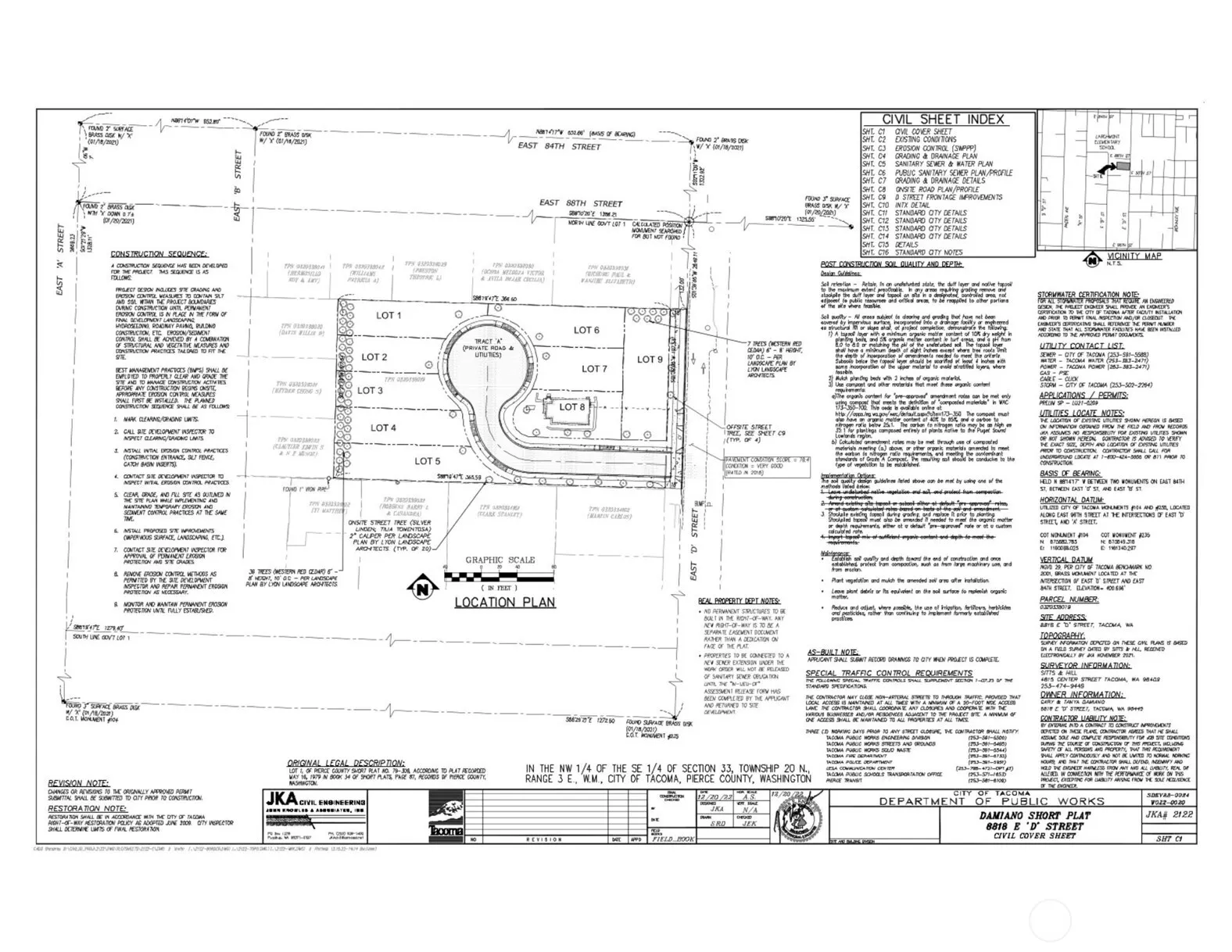 Investors/Builders. Great opportunity for a City-approved short plat of 1.78 acres, creating 9 residential building lots averaging 5,565 sq. ft., including the existing 1,728 sq. ft. house. Located in a quiet residential neighborhood, close to shopping, schools, and minutes to I-5 & 512. Thanks to the Feb 2025 “Home in Tacoma Plan”, the property was also rezoned Urban Residential-2 (UR-2) to allow for even more building opportunities. This level property has electric, water, and sewer on-site and is ready to be developed. The existing 4-bedroom, 2-bath house will need updating, but it is in good to fair overall condition.
