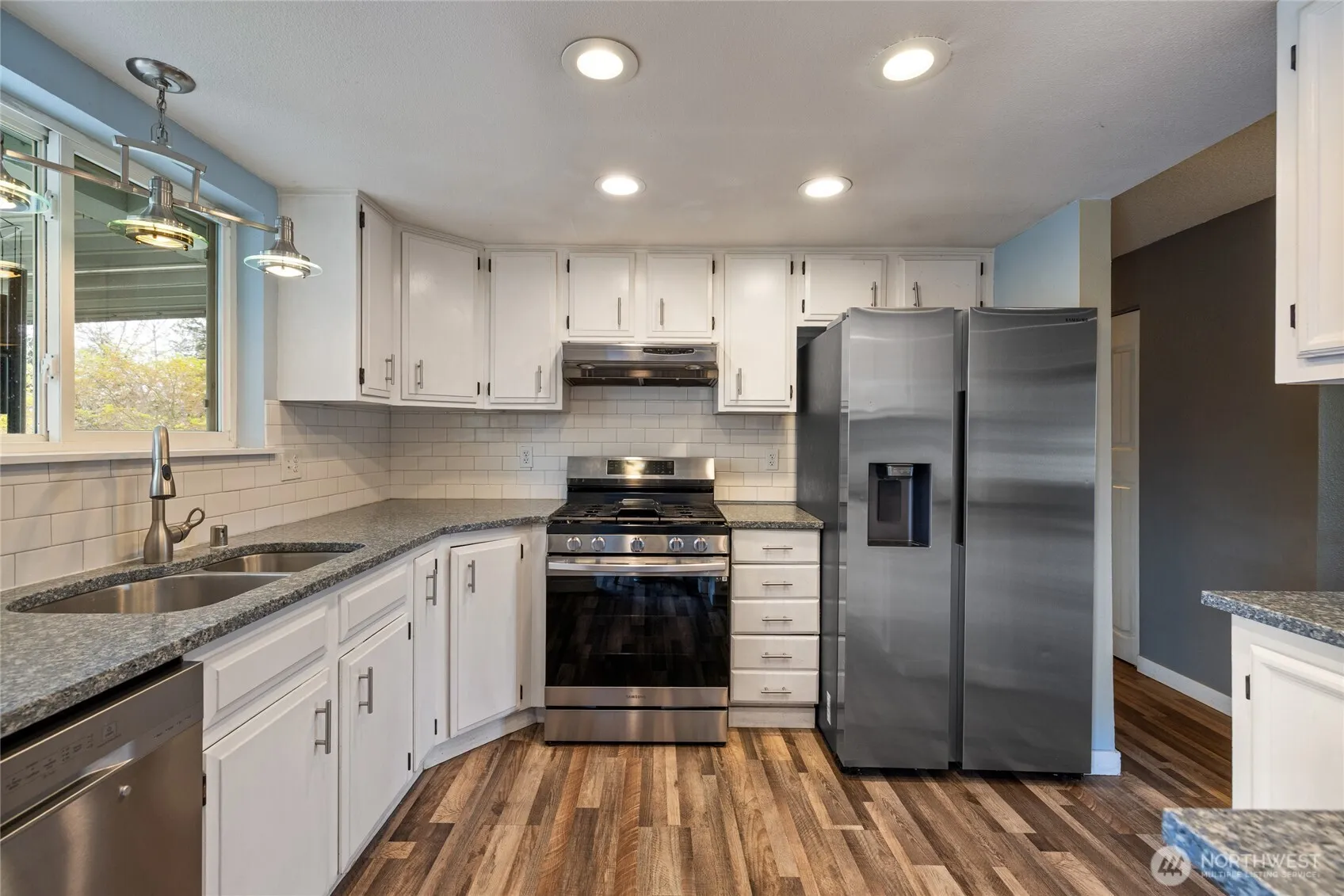 NW Contemporary Split Level Home. Remodeled Kitchen, Quartz Counter Tops, Cabinets are Crafted by the Original Owner, Large Primary Bedroom En Suite, Living Room with Brick Fireplace. Spacious Dining Area With Built-In Shelving, New Mill Work, and New Flooring Through Out Home. Large Covered Deck off Dining Area Perfect For Entertaining. Lower Split Spacious Gathering Area With Brick Fireplace, Large Bedroom With Built-In Shelving, Laundry Area. RV Parking, Garden Shed, Ample Room For Garden