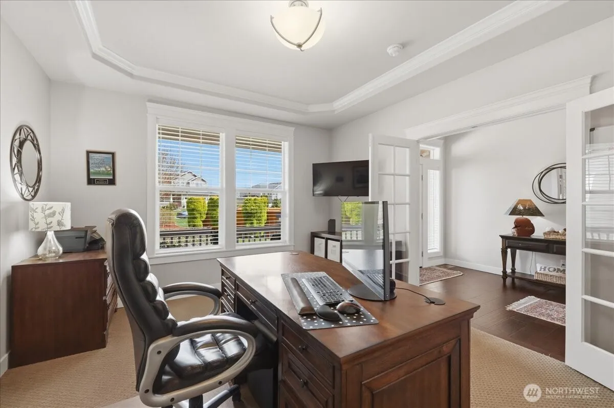 An exceptional offering in Puyallup’s coveted Shawnee Ridge, this luxury rambler pairs refined design with breathtaking mountain views on an expansive, 1/2 acre lot. Meticulously maintained, the home features 3 bedrooms, 3 baths ( 1 full, 1 3/4 & 1 powder), and a private den, with a thoughtfully designed layout that blends comfort and sophistication. The great room is anchored by a slate-surround gas fireplace & a wall of custom built-ins, creating an inviting yet elevated living space. The chef’s kitchen showcases engineered hardwoods that flow to the dining area, granite countertops, full tile backsplash, double ovens, a wine refrigerator, & custom soft close cabinetry with pull-outs. Throughout the home, generous storage solutions—including custom closets and built-ins—offer both beauty and functionality. The secluded primary suite provides a true retreat, complete with a spacious custom closet and a luxurious soaking tub. Outdoors, the fully fenced, park-like grounds impress with a covered deck featuring a gas fireplace, perfectly positioned to capture stunning mountain views, along with a large garden shed. Car collectors and hobbyists will appreciate the 1,300 sq ft, 4-bay garage with additional overhead storage. A whole-house automatic transfer generator ensures year-round comfort and peace of mind. Ideally located near Shaw Road for an easy commute and within the Puyallup School District, this is Pacific Northwest living at its finest. Welcome home!