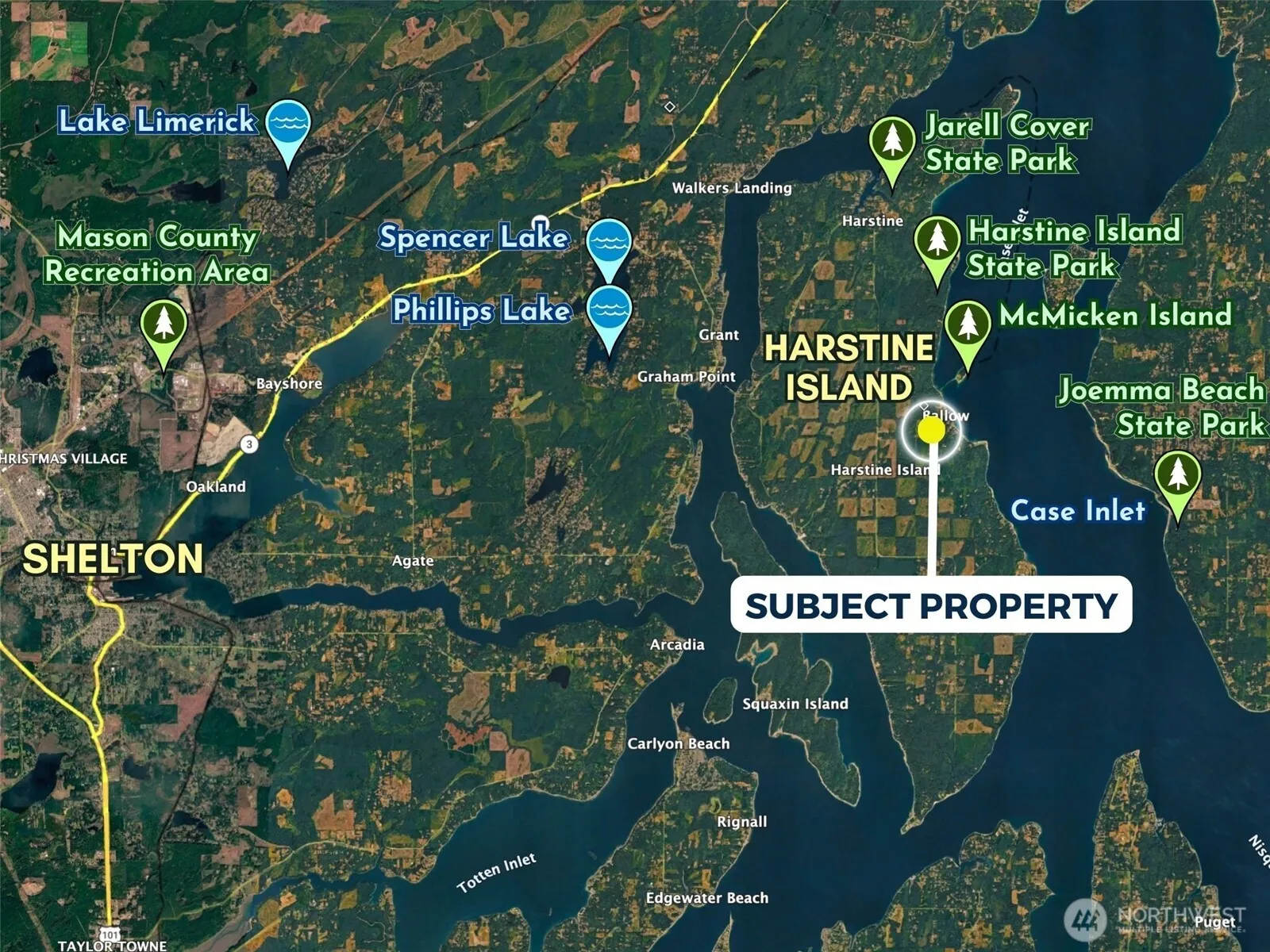 4.91 acres with development potential. Power is available at the road, and the soils are generally suitable for supporting a septic system. This lot is mostly wooded with a mix of mature conifers and hardwoods, plus a small clearing near the gated entry. McMicken Island Marine State Park is less than 200 feet away, offering more than 100 acres to explore, including a walkable sandbar that connects to McMicken Island at low tide. Peaceful and private setting with no HOA or CC&Rs. Under 30 minutes to Shelton and just over an hour from Tacoma. This is a rare opportunity to bring your vision to life in a truly special setting.