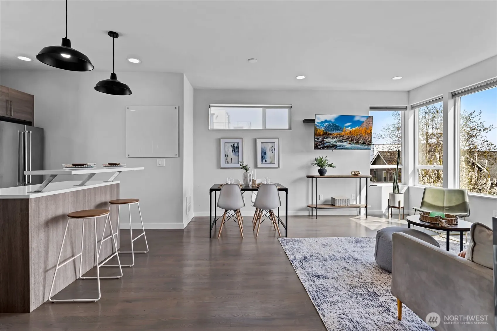 Live the Ballard lifestyle in this light-filled 3bd/2ba townhome tucked on a quiet, tree-lined street in one of Seattle’s most loved neighborhoods. From the moment you step inside, a striking custom steel staircase sets a bold, modern tone—an architectural centerpiece that makes a lasting impression. Oversized windows bring in beautiful natural light throughout the day, while stained oak hardwoods add warmth and character at every level.The home is thoughtfully designed for flexible living, with a welcoming entry level featuring a bedroom, bath, and convenient laundry. Upstairs, a spacious primary suite and additional bedroom offer comfort and versatility for guests, work, or creative space.The heart of the home is made for connection—an open-concept living area anchored by a sleek chef’s kitchen with quartz counters, stainless steel appliances, and generous storage. Whether it’s quiet mornings or hosting friends, it’s a space that simply works.Step out to the large south-facing view deck and enjoy open skies, sunsets, and peaceful outdoor living above it all. Radiant floor heating and a Nest smart system add everyday comfort and ease.All just moments from Ballard’s best cafés, restaurants, parks, waterfront trails, and the iconic Locks—offering the perfect balance of energy, walkability, and neighborhood calm. Designated parking included.