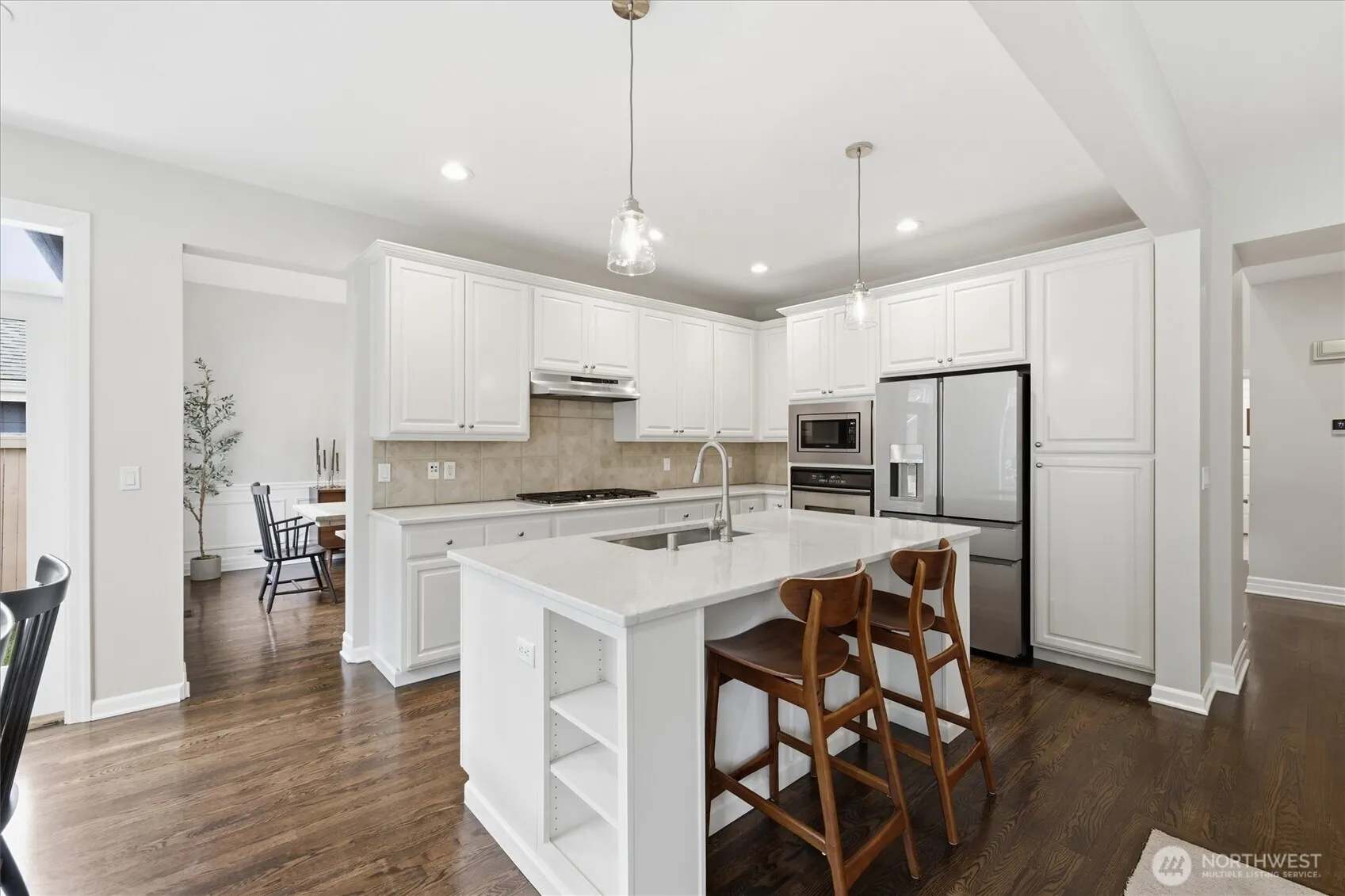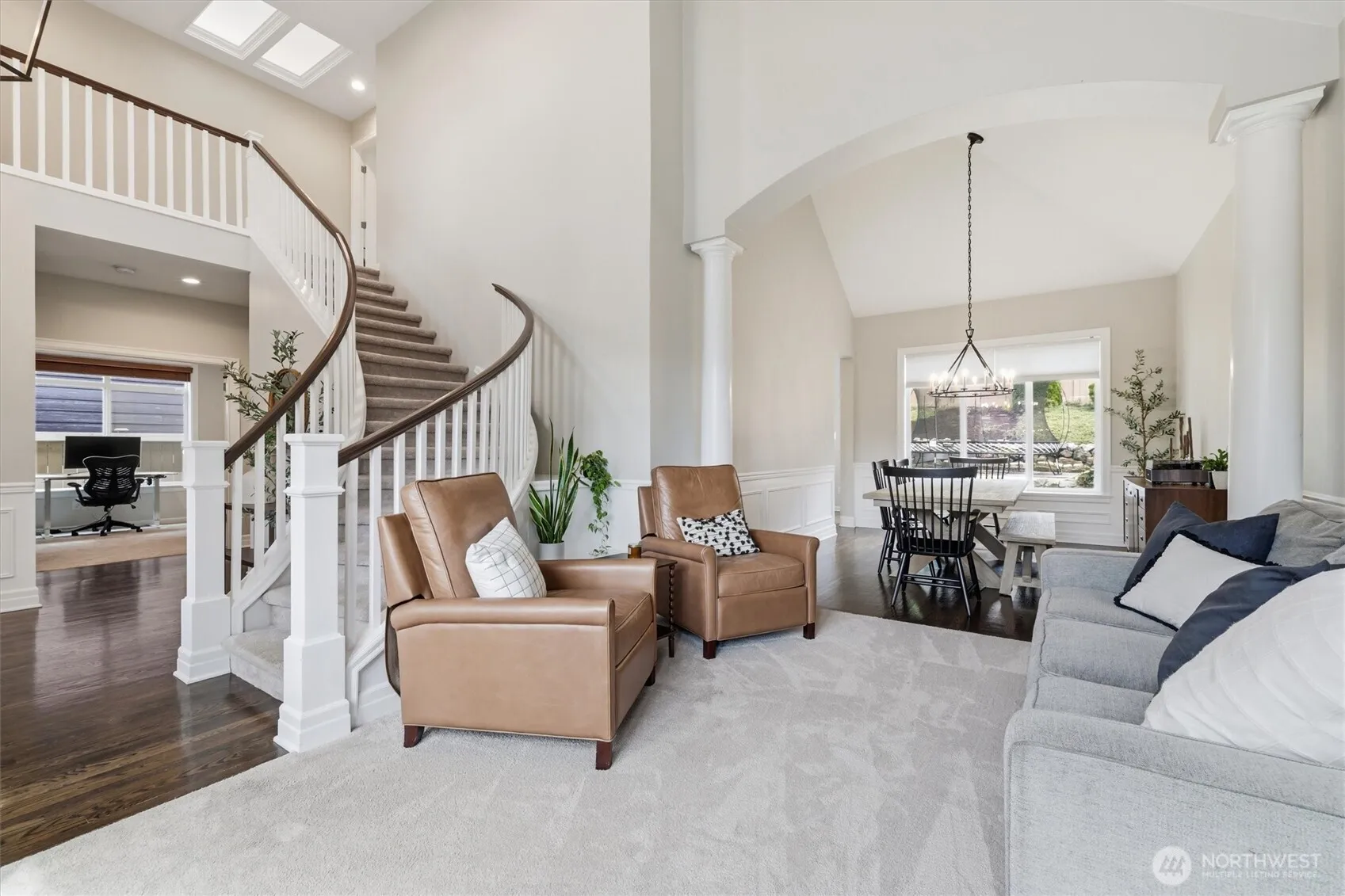 Highly Coveted Crest View Loop charmer! Sits perfectly at the end of the loop providing ample privacy on greenbelt lot. Enter & be greeted w/ rare vaulted ceilings & grand spiral staircase + office on main. Remodeled kitchen flows perfectly for entertaining w/ refinished hardwood floors, SS appliances, new quartz countertops & island w/ seating & storage. Grand wrap around staircase leads you to spacious bedrooms + primary suite w/ custom walk-in closet & 5-piece bath w/ brand new flooring. A/C, updated paint & light fixtures throughout. Greenbelt lot w/ fully-fenced yard + gardening & entertaining space. Additional updates include new solar panels, EV charger in 2-car garage w/ extra storage, new heat pump, Air Scrubber filtration system & furnace + updated roof w/ transferable warranty. Top rated Snoqualmie schools including CVES & Mt. Si HS, community park + walking distance to The Club at Snoqualmie Ridge.