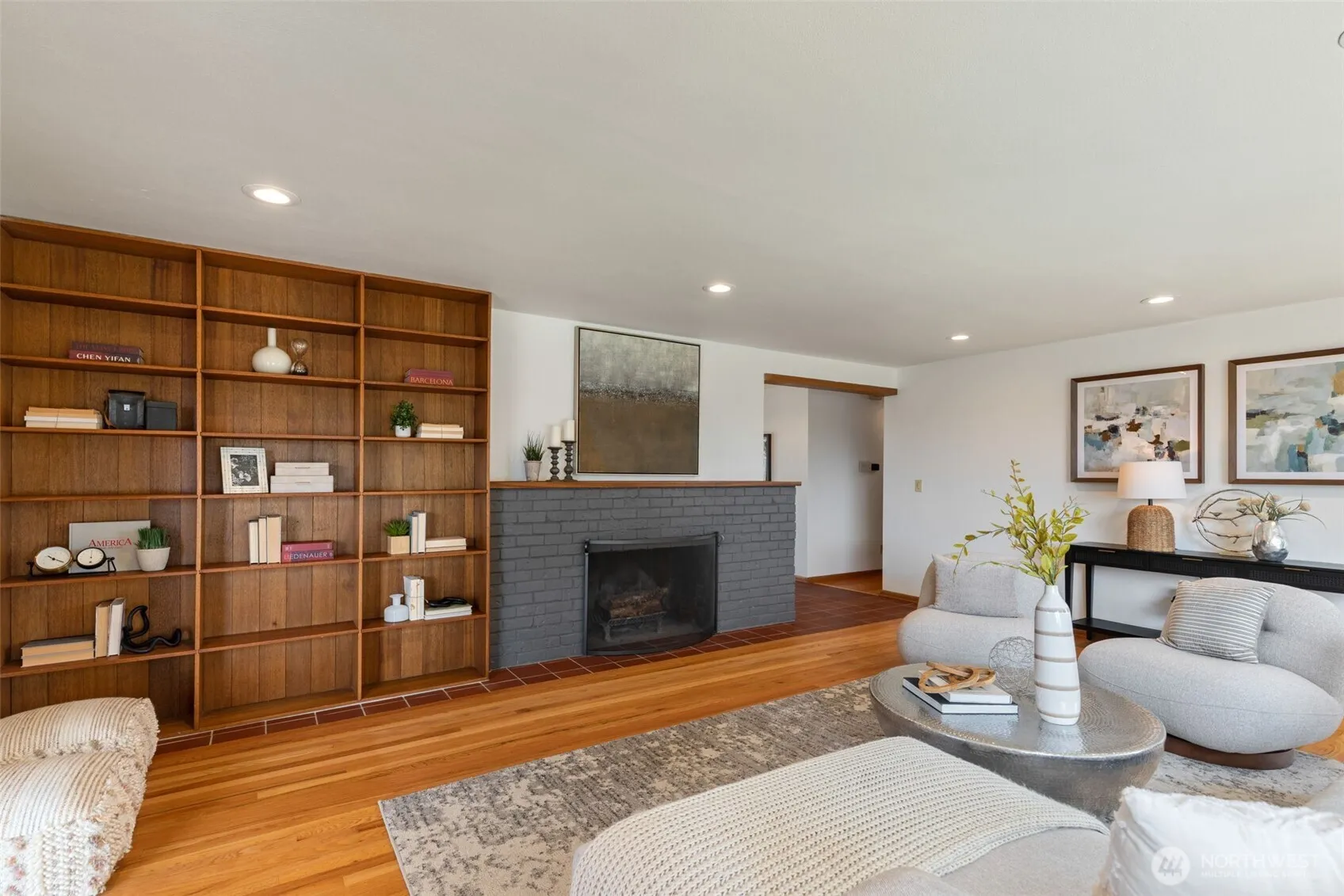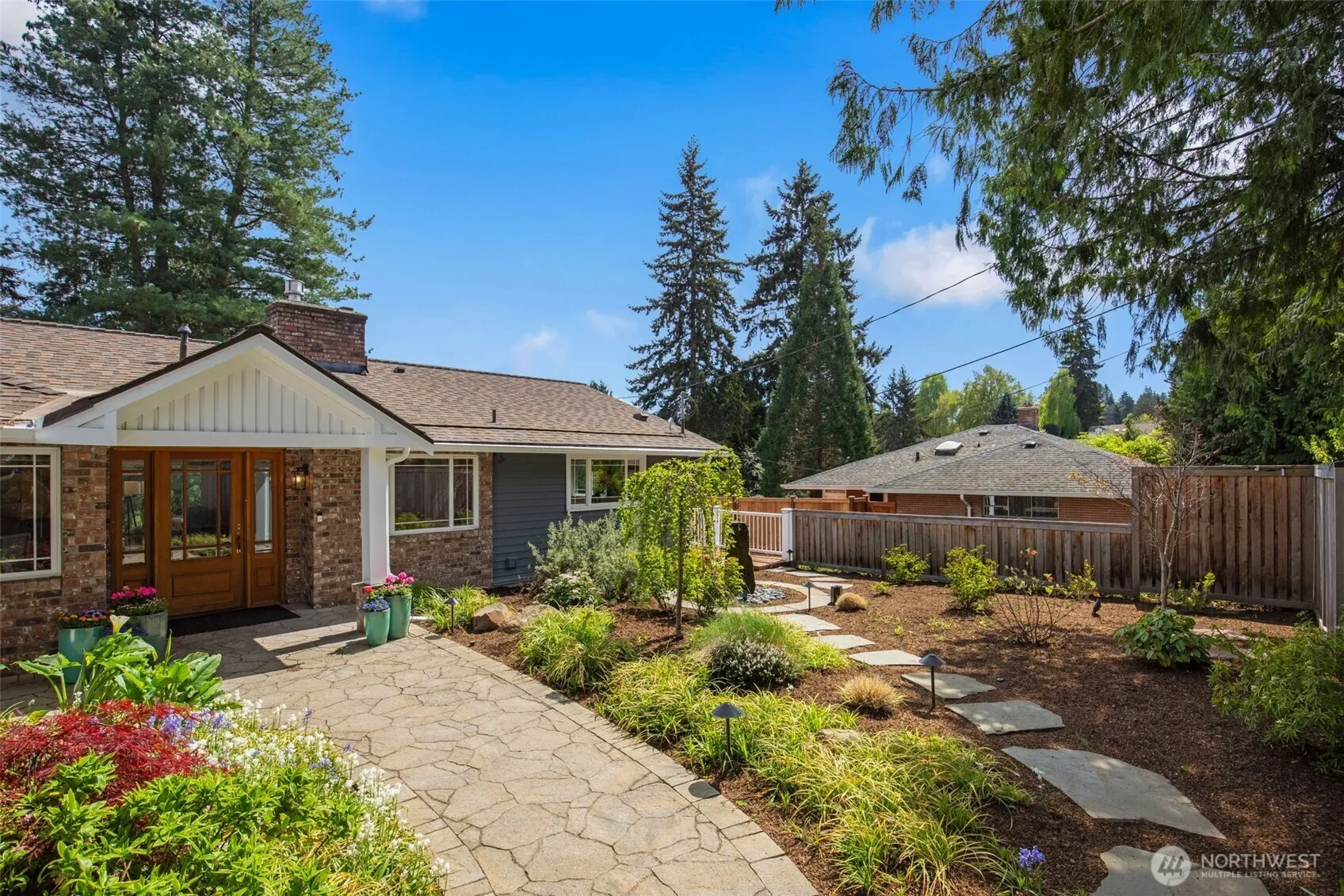 Discover serene Northwest living in this inviting daylight basement 1950’s rambler, perfectly positioned in Lake Forest Park to take advantage of Lake Washington and Mount Rainier views. A beautifully manicured courtyard creates a warm, private welcome. Inside, a dramatic wall of southeast-facing windows fills the expansive living room with natural light while showcasing breathtaking lake and mountain vistas. Rich hardwood floors, generous living areas, and a cozy wood-burning fireplace set the stage for both relaxed living and effortless entertaining.The main level features a chef’s kitchen with commercial-grade appliances, seamlessly connecting to a bright dining area and an entertainment-sized deck overlooking the lush grounds and panoramic scenery. Three spacious bedrooms are located on this level, including a stunning primary suite with view outlooks, a spa-inspired bath with heated floors and a Japanese soaking tub thoughtfully positioned to take in the scenery. One bedroom is thoughtfully suited for a home office.The daylight lower level offers exceptional flexibility, with a large rec room, gas fireplace, wet bar, three additional bedrooms, tiled bath, plus abundant storage and laundry space—ideal for guests or multi-generational living. Outdoors, enjoy a private retreat with patios, expansive lawn space, and tranquil surroundings. Peace-of-mind updates include newer windows, roof, furnace, central AC & hot water heater. Interior and exterior freshly painted.