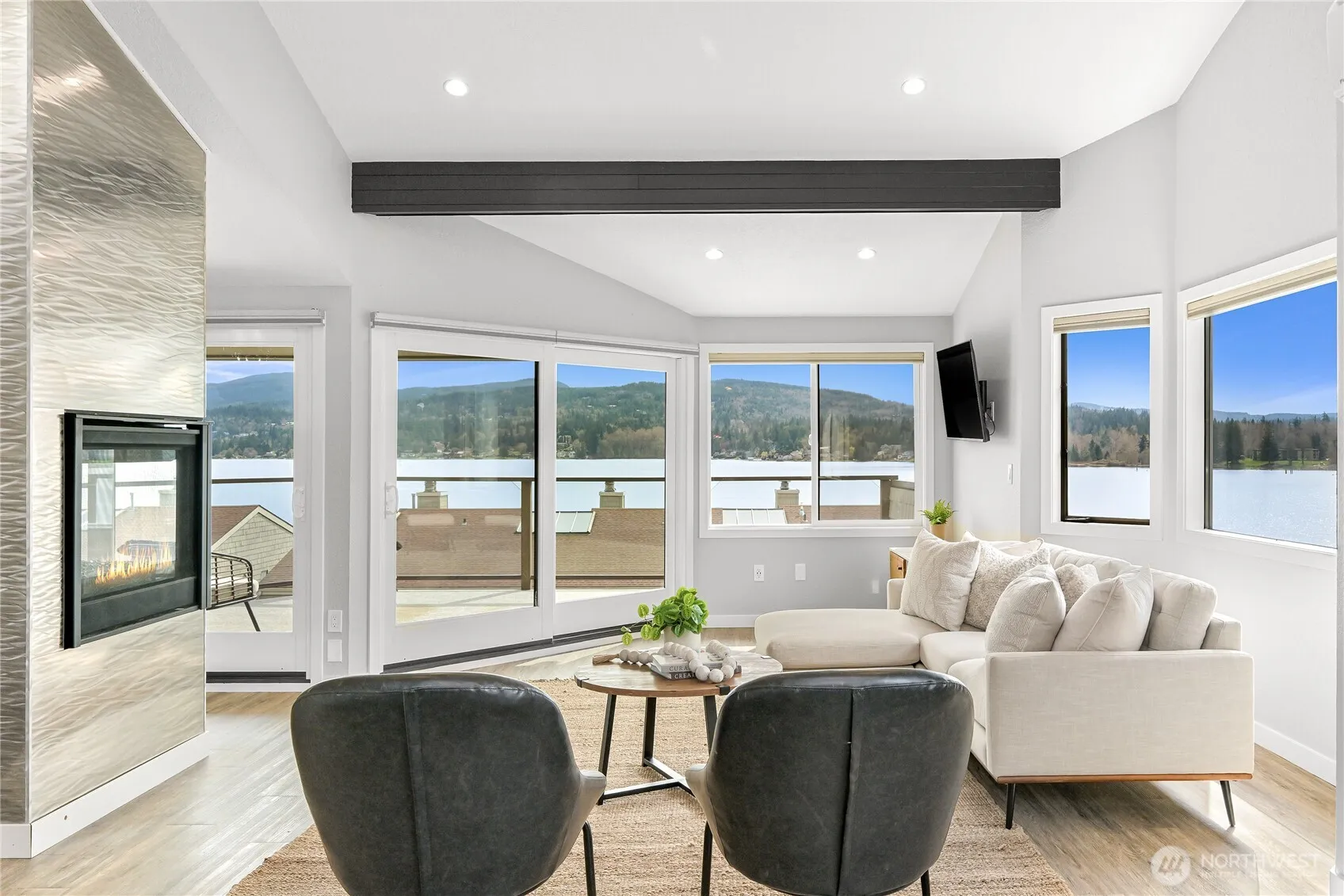 Don’t miss this rare opportunity to own at Lakeside North – Lake Whatcom’s premier condominiums, located on sunny Northshore Drive, close to town & across the street from two new restaurants and store . This is a 3 bedroom, 3 bath, South facing end unit that’s flooded with sun, and includes a private boat slip. It’s the largest unit in the complex with nearly 2,500 square feet, two massive private sun decks a private 2-car carport. Completely remodeled throughout featuring a brand-new kitchen, bathrooms, flooring throughout, fireplace, new trim and doors, modern lighting, and upgraded hardware—every single detail has been thoughtfully refreshed! Other features include a wall of windows facing West for light, vaulted beamed ceilings, multiple skylights, wet bar & many versatile interior spaces that can be used for a den, gym, media room, office, bunk room… you name it! Be on vacation year-round & enjoy the lake lifestyle at half the cost without the maintenance of a single family home!