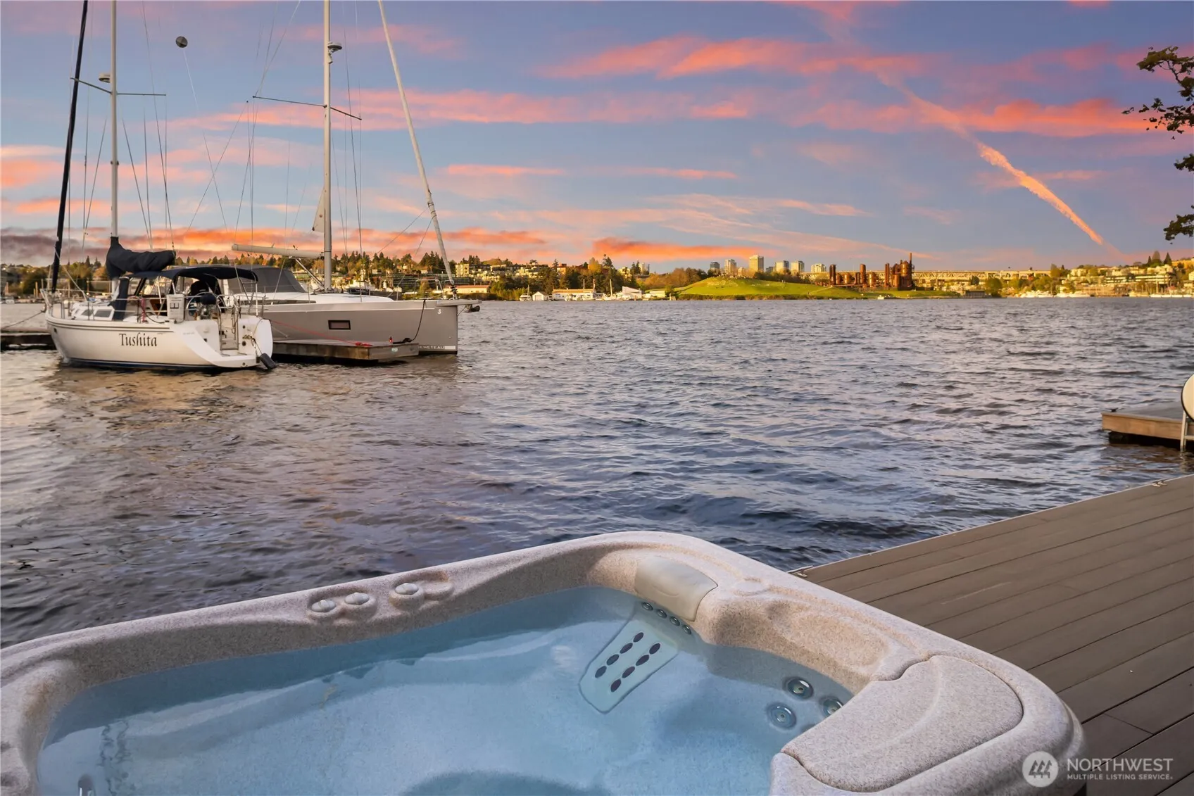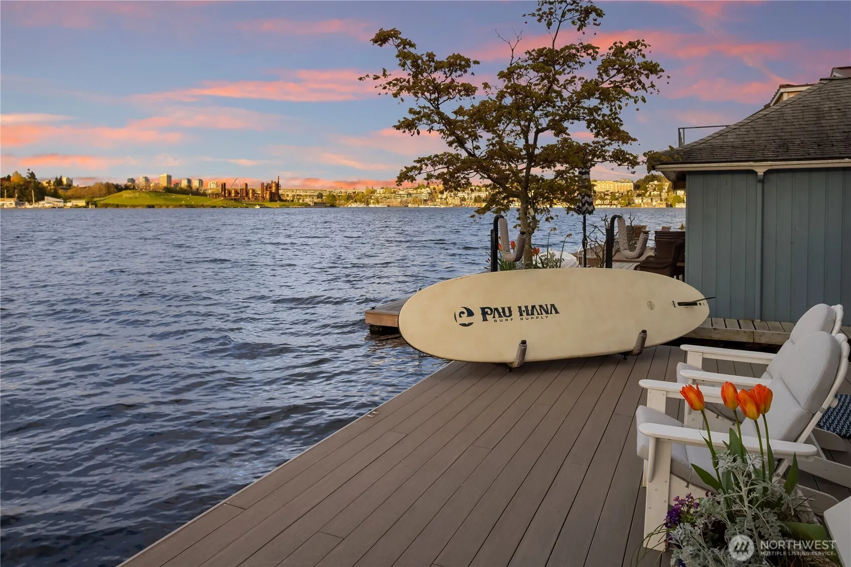Quintessential Seattle living awaits on this rare 4-bedroom floating home on Westlake’s coveted Nesika Chuck dock, ideally positioned on the sought-after outside row with wide-open channel frontage and protected north-facing views to Gas Works Park. Blending classic coastal charm with a crisp, modern palette, the home is filled with natural light and thoughtful design throughout. Vaulted wood ceilings with exposed beams bring warmth, volume, and a strong architectural presence, while the airy great room is framed by soaring windows overlooking the water. Two sets of French doors open to an expansive waterside deck with hot tub, creating a seamless indoor-outdoor connection and a true front-row seat to the rhythm of Lake Union. Recently updated baths, geothermal heating, and 1,878 sqft of well-utilized living space offer comfort and efficiency. A 30’ boat slip plus additional side moorage for smaller watercraft provide true on-the-water convenience. Nesika Chuck is widely regarded as Westlake’s premier dock, with secure gated entry, low dues, strong reserves, city parking for residents, and a reputation for exceptional dock stewardship. Ideally located on Westlake, just a short stroll to both Downtown and Fremont. From morning sunrises to evening sunsets, with sailboat races, seaplanes, 4th of July fireworks, wildlife sightings, and passing ships, there is always something unfolding just beyond your deck. Live your own ‘Sleepless in Seattle’ moment.