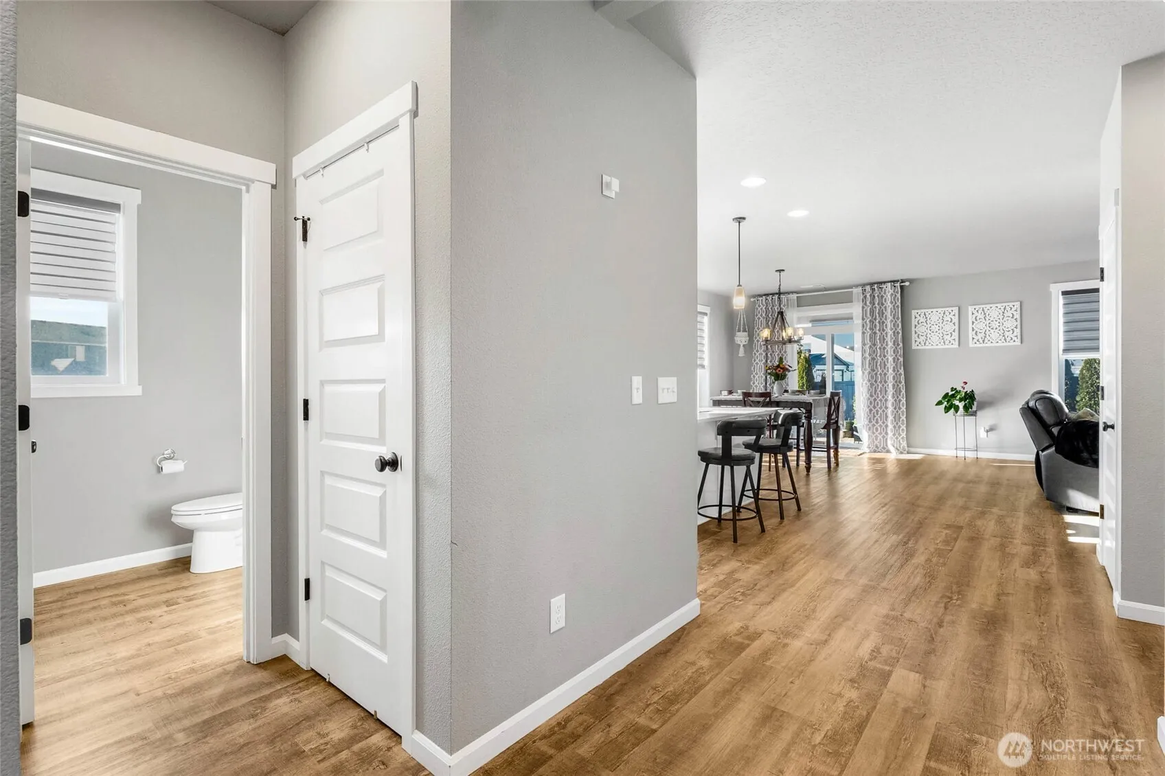 Built in 2020 and impeccably maintained, this stylish modern home sits on a desirable corner lot in a fabulous neighborhood just steps from a 5-star golf course with clubhouse and restaurant. Offering 2,372 sq ft, this 4 bedroom, 2.5 bath home features a versatile den/flex space perfect for a home office or bonus room. The bright kitchen showcases quartz countertops, on-trend white cabinetry, stainless appliances, under-cabinet lighting and is open to the living space with LVP flooring and a cozy electric fireplace. The spacious primary suite includes a luxurious 5-piece en suite bath and generous closet space. Enjoy outdoor living on the covered back patio overlooking the fully fenced yard with UGS. Custom blinds throughout, washer & dryer included. An expansive 5-car garage with epoxy floor provide both style and function for the mechanic, car restoration, artist, toys, boat, workshop or home gym. Close to Blue Heron Park for recreation and water sports with easy I-90 access—this home truly offers the perfect blend of comfort, convenience and lifestyle.