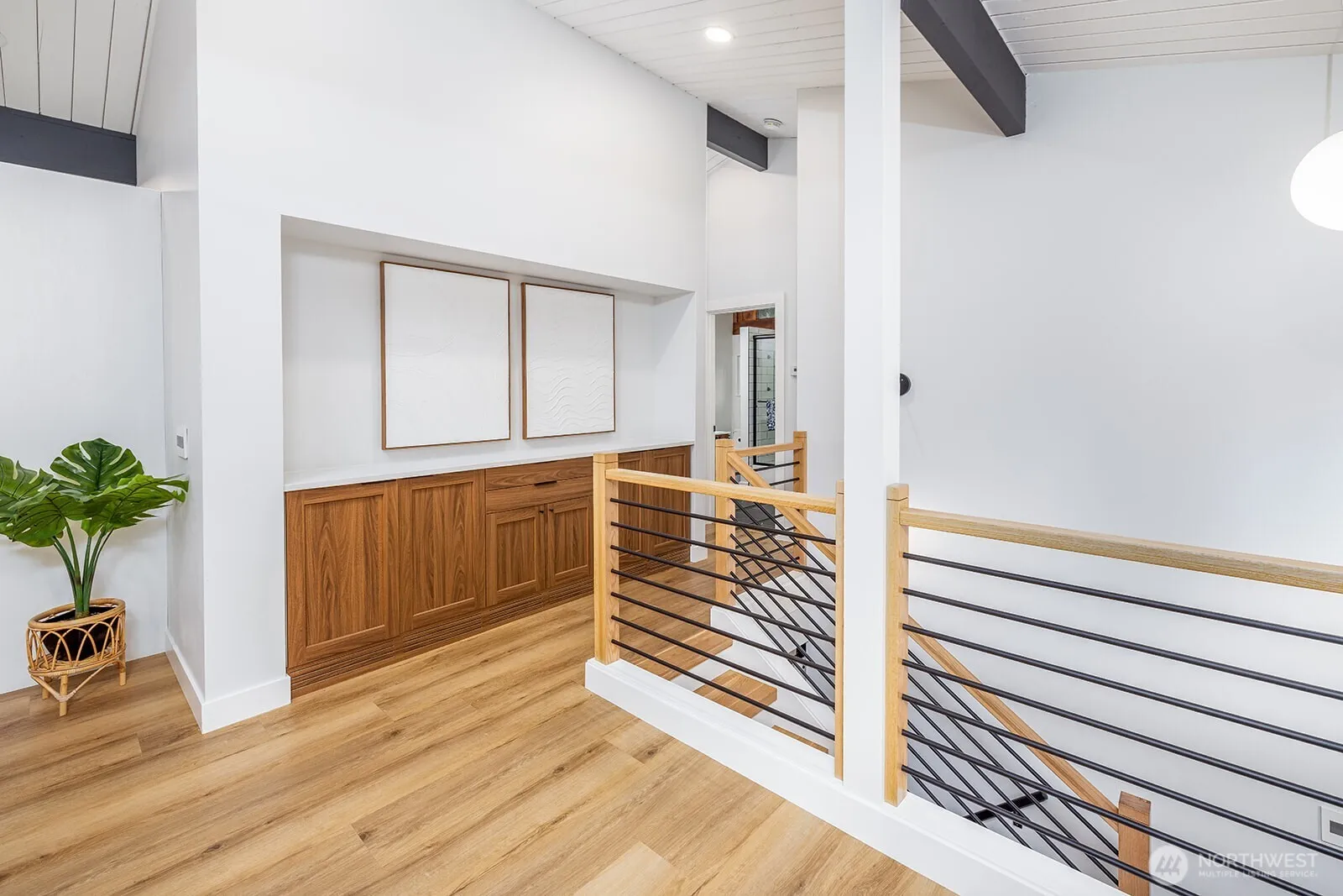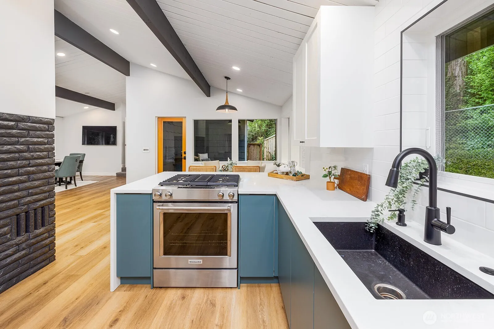 Quiet the noise & experience the true peaceful beauty within this stunning mid-century renovation in LFP. Thoughtfully updated w/exceptional modern amenities including central A/C & sustainable technology throughout, blending comfort & style. A bright, open floor plan w/vaulted beam ceilings & an expansive window wall creates a warm, inviting atmosphere, anchored by a striking central wood-burning fireplace. The chef’s kitchen is sleek & refined, featuring SS appliances, gas range w/ electric oven & abundant, thoughtfully designed storage. The serene, spacious primary suite offers a spa-like experience w/a dual-entry bath, soaking tub, heated floors & walk-in glass shower. The opposite wing: a private guest ensuite w/its own deck and a versatile office/bedroom w/loft complete the main level. Downstairs, discover a relaxed retreat w/a second wood-burning fireplace, media/family room, private kitchenette, 2 additional bedrooms, chic minimalist bath & extensive storage. Oversized 3+ car garage includes a heated bay—perfect for workouts, hobbies, or projects—plus a large utility room & shop space. Set back above the street, enjoy a spacious park-like front yard & private backyard w/covered porch—ideal for morning coffee or quiet evenings. Additional highlights include a sprinkler system & hot/cold exterior hose bibs. BONUS: deeded access to Lake Washington through the Lake Forest Park Civic Club. This is a truly special home—distinctive, inviting, and best experienced in person.