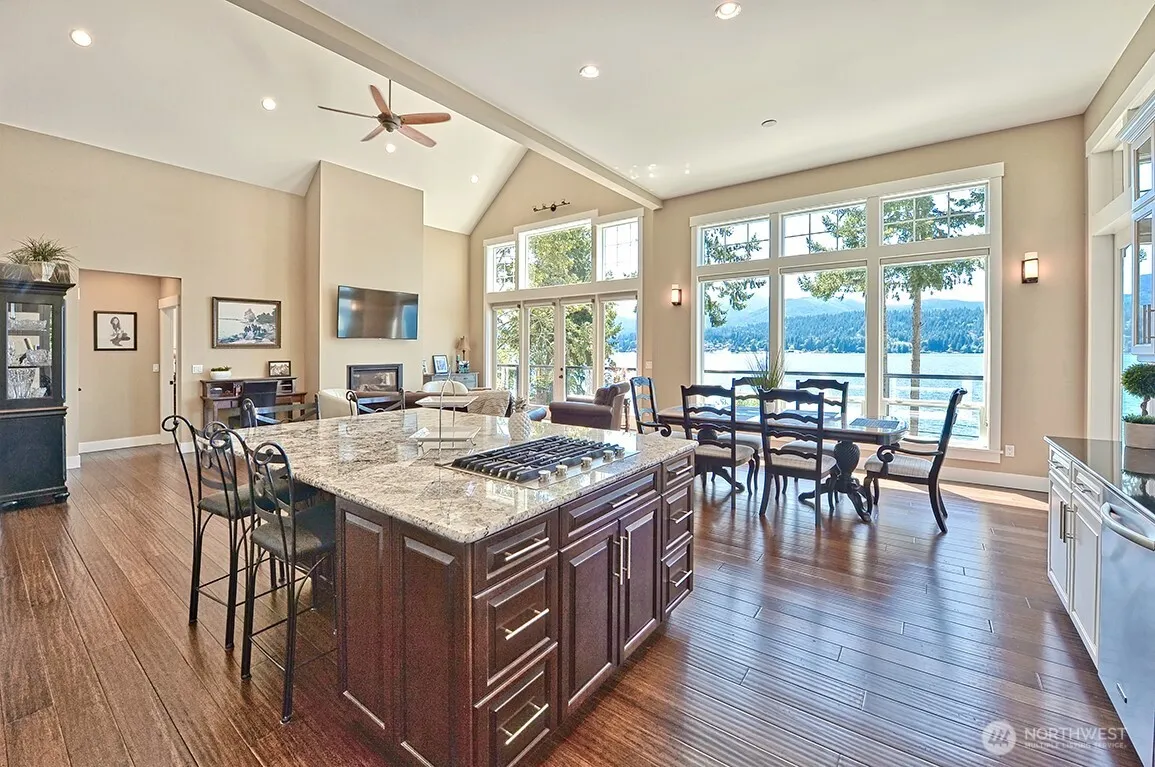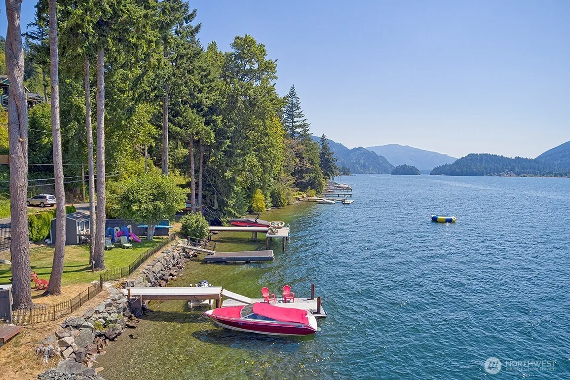 Owner Financing Available. Luxury living on Lake Whatcom! Experience refined waterfront living with sweeping lake views from nearly every room in this stunning contemporary residence on the sunny side of Lake Whatcom. Set on a private 0.56-acre lot with 80 feet of pristine shoreline, the property offers expansive parking and potential for building expansion. The main floor features a thoughtfully designed open layout with floor to ceiling windows, spacious living room, dining room and chef’s kitchen with a large island. Custom cabinetry and Butler’s pantry. All flowing through a custom-built pass-through window to the large covered outdoor living area. With a statement fireplace and a separate hot tub deck, all overlooking the water. The main floor primary suite provides a peaceful retreat with gorgeous views. The lower level offers 2 spacious bedrooms, full bath, versatile flex room, Second kitchen and laundry room. Lower area is ideal for guests, extended living or potential rental use. The waterfront is equipped with two docks, propane, power, hot and cold water, irrigation and beach storage All creating a Turnkey Opportunity for Summer Fun, Recreation and Relaxation.