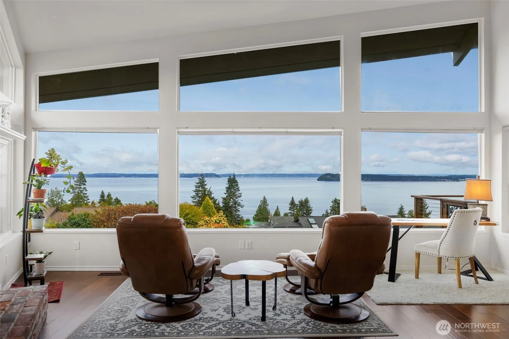 Discover a stunning view home in Port Ludlow capturing breathtaking 160° panoramic views of Admiralty Inlet, Puget Sound and the Cascade Mountains. This architecturally inspired residence blends artistic design with everyday comfort, featuring vaulted ceilings, engineered hardwood floors, and expansive walls of windows that flood the home with natural light and showcase unforgettable sunrise vistas. The chef’s kitchen is a showpiece with a one of a kind live-edge breakfast bar, built-in live-edge wine bar, and seamless flow to the dining area and covered deck—perfect for year-round indoor-outdoor entertaining. The main-level primary suite offers a private retreat with custom art feature wall, its own secluded deck, en-suite with soaking tub, tiled walk-in shower & heated floors. The lower-level walk-out basement is ideal for multi-generational living, guests, or flexible use, featuring two additional bedrooms, a spacious living room, wet and dry bar, and an updated bathroom. The private over-the-edge home theater with built-in seating and surround sound creates an exceptional entertainment experience! Settle in for the drama! Outside, enjoy easy-care landscaping, multiple view decks & built-in firepit—perfect for relaxing under the stars. Located in the heart of Port Ludlow, this home offers a rare combination of luxury, privacy, and Pacific Northwest lifestyle with world-class views, outdoor recreation, marina access, private club, and nearby golf amenities.