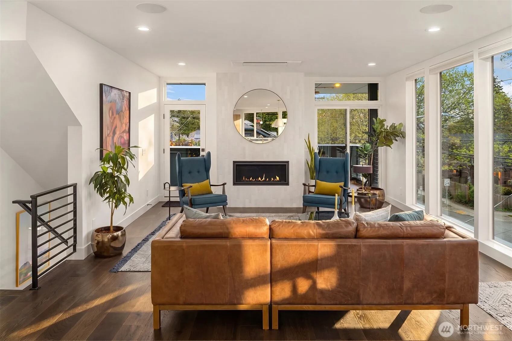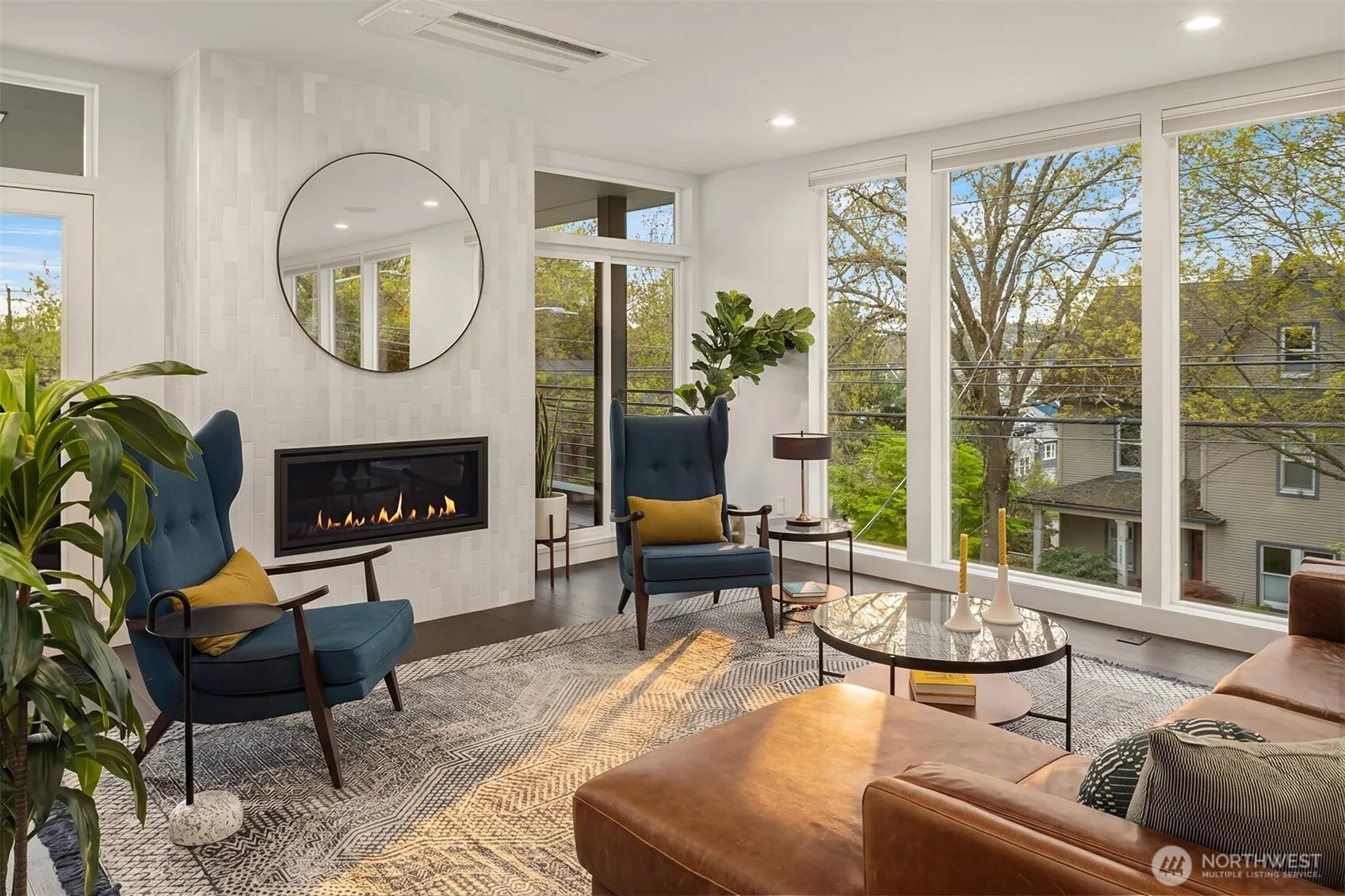 Steps from Irwin’s Cafe, the Burke-Gilman Trail, Gas Works Park, and dinner on Stone Way whenever you feel like it. Fremont and Green Lake are both within easy reach. This is Wallingford at its best, and then you come home. This home is a genuine retreat. Architect-designed, light-filled, and finished to a standard you notice the moment you walk in. Floor-to-ceiling windows bring in natural light all year, a gas fireplace anchors the living room, and the main living is where the trees are in summer and the views of Lake Union and the Seattle skyline open up in winter. The kitchen is built for real cooking and easy entertaining: gas range, large island, walk-in pantry, beverage fridge. Two covered heated decks bring the living outside, and the rooftop deck above is where the best evenings happen.The primary suite has heated bathroom floors and a large walk-in closet. Three additional bedrooms, or two plus an office, give the house room to flex. Downstairs: a cozy media room, a covered patio with ceiling heaters, and a private infrared sauna. High-end finishes throughout. Remote-controlled blinds. Attached garage with EV charging. Energy-efficient systems. Thoughtful upgrades at every turn. Downtown in 15 minutes. John Stanford Elementary geo zone.