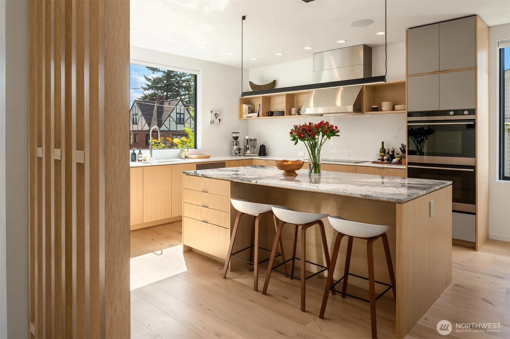 Architect-designed and completed in 2023, this exceptional 3,350 SF modern home sets a new standard for craftsmanship in Seattle. Enter a bright, open kitchen with custom White Oak cabinetry, Turkish marble and quartz countertops, flowing effortlessly into the dining and living rooms where floor-to-ceiling windows frame the private backyard and bring the outdoors in. Upstairs, a spectacular Mt. Rainier view stops you in your tracks. The upper level offers three generous bedrooms and two beautifully appointed baths. The sun-drenched daylight lower level provides a guest bedroom and large, cozy media room. The converted garage is a fully separate studio workspace — architecturally consistent with the home — offering the rare gift of genuine separation between work and life without leaving the property. The materials and workmanship throughout — European White Oak floors, Cedar and Shou Sugi Ban charred Larch siding, standing seam metal roof — reflect quality and care rarely seen in today’s construction. All-electric with zoned heat pump, A/C, and wood-burning fireplace. The private backyard deck, patio, and garden offer wonderful space to entertain and unwind. Minutes to Old Ballard and a short drive to downtown Seattle and Golden Gardens. Only a short walk to highly regarded bakeries and restaurants.
