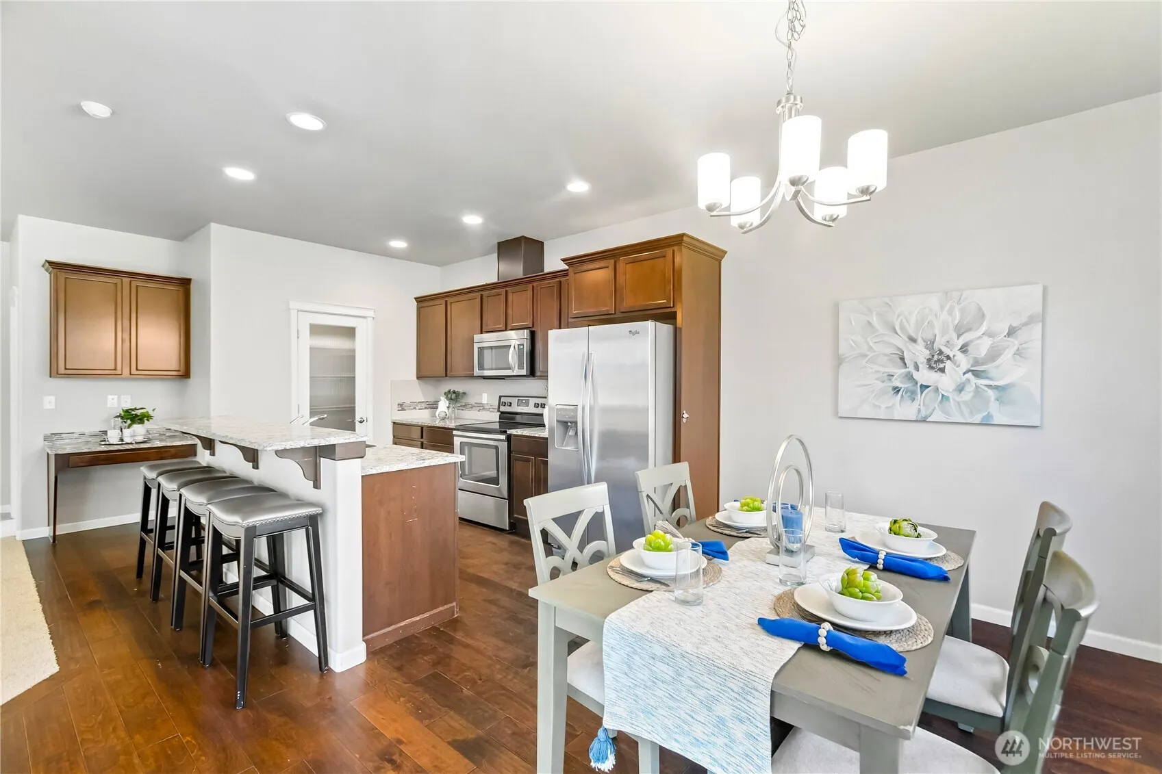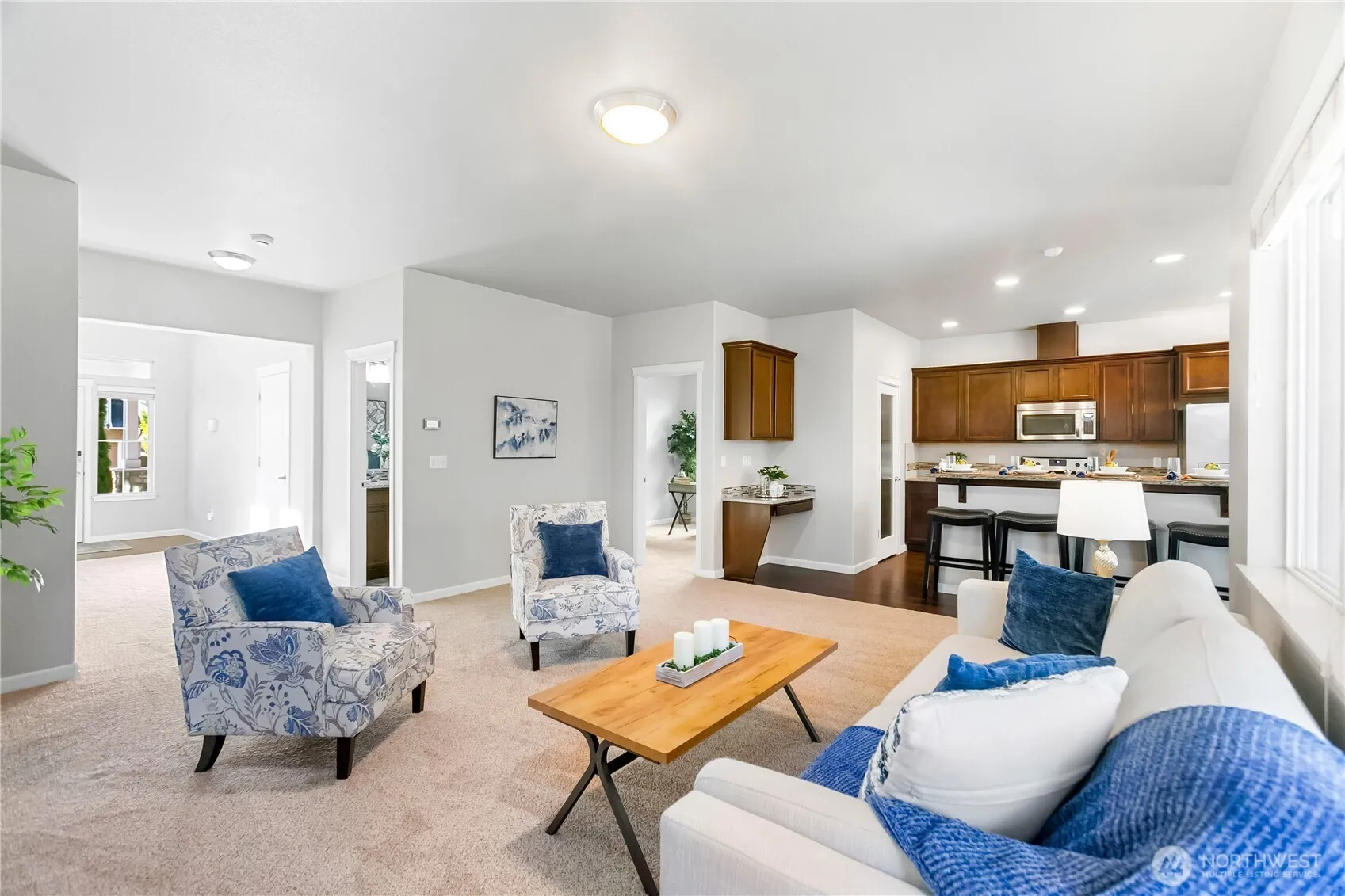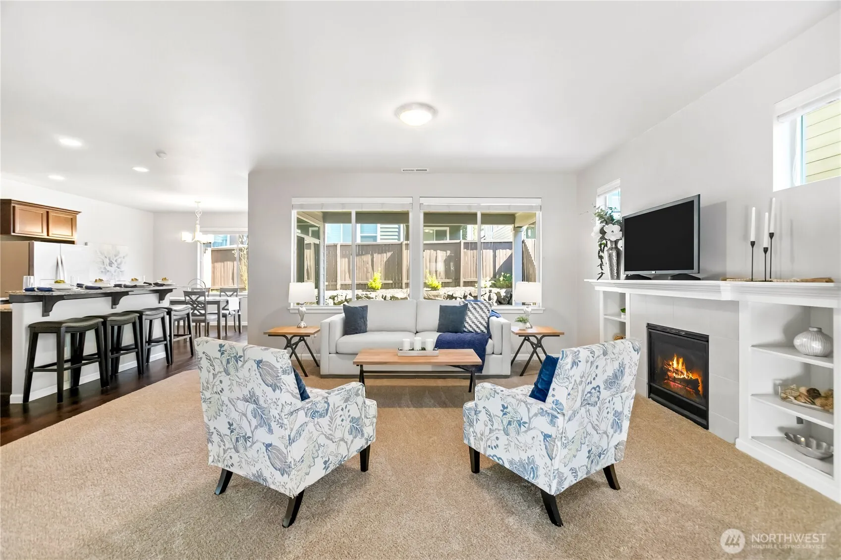Welcome to the highly sought-after Freestone at Bayside! This beautifully maintained 4-bedroom home shines with brand-new carpets and an impressive vaulted entry that floods the space with natural light. The functional open floor plan is anchored by a cozy gas fireplace with elegant custom built-ins, perfect for gatherings. A versatile main-level den offers the ideal setup for a home office or guest space. Upstairs, discover a flexible loft and a spacious primary suite featuring a large walk-in closet and en-suite bath. Modern essentials include a tankless water heater and a dedicated laundry room. Step outside to your private, fully fenced yard and covered patio—perfect for year-round entertaining. Conveniently located near local parks, golf, highways, and easy commuting routes to nearby bases and ferries.