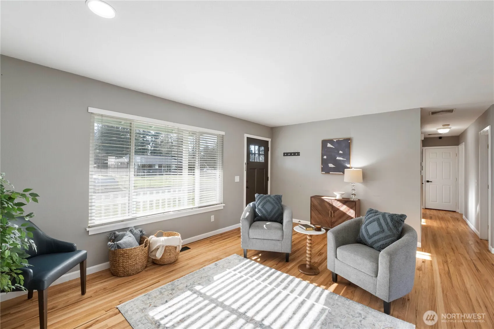 Welcome to this charming and beautifully updated open-concept rambler nestled on a quiet cul-de-sac in the heart of Federal Way! This inviting home blends timeless character with modern upgrades, featuring original hardwood floors flowing through the main living spaces and an oversized living room perfect for entertaining or relaxing by the cozy wood-burning stove. The stunning kitchen showcases quartz countertops, crisp white cabinetry, gleaming stainless-steel appliances, and an oversized island with eating bar that serves as the true centerpiece of the home. French doors off the dining area open to a generous backyard patio, creating effortless indoor-outdoor living and an ideal setting for gatherings. Enjoy energy efficiency and lower utility costs with installed solar panels, while the fully fenced backyard offers privacy and room to play or garden. This well-designed floor plan includes three comfortable bedrooms and 1.75 bathrooms, highlighted by a stylish primary suite featuring a tile shower. Additional amenities include a single-car garage, abundant natural light, and a large patio that extends the living space outdoors. Tucked away in a peaceful neighborhood yet close to shopping, dining, parks, and commuter routes, this home offers the perfect balance of tranquility and convenience — a rare opportunity to own a move-in-ready rambler with modern comforts and classic charm in a sought-after location.
