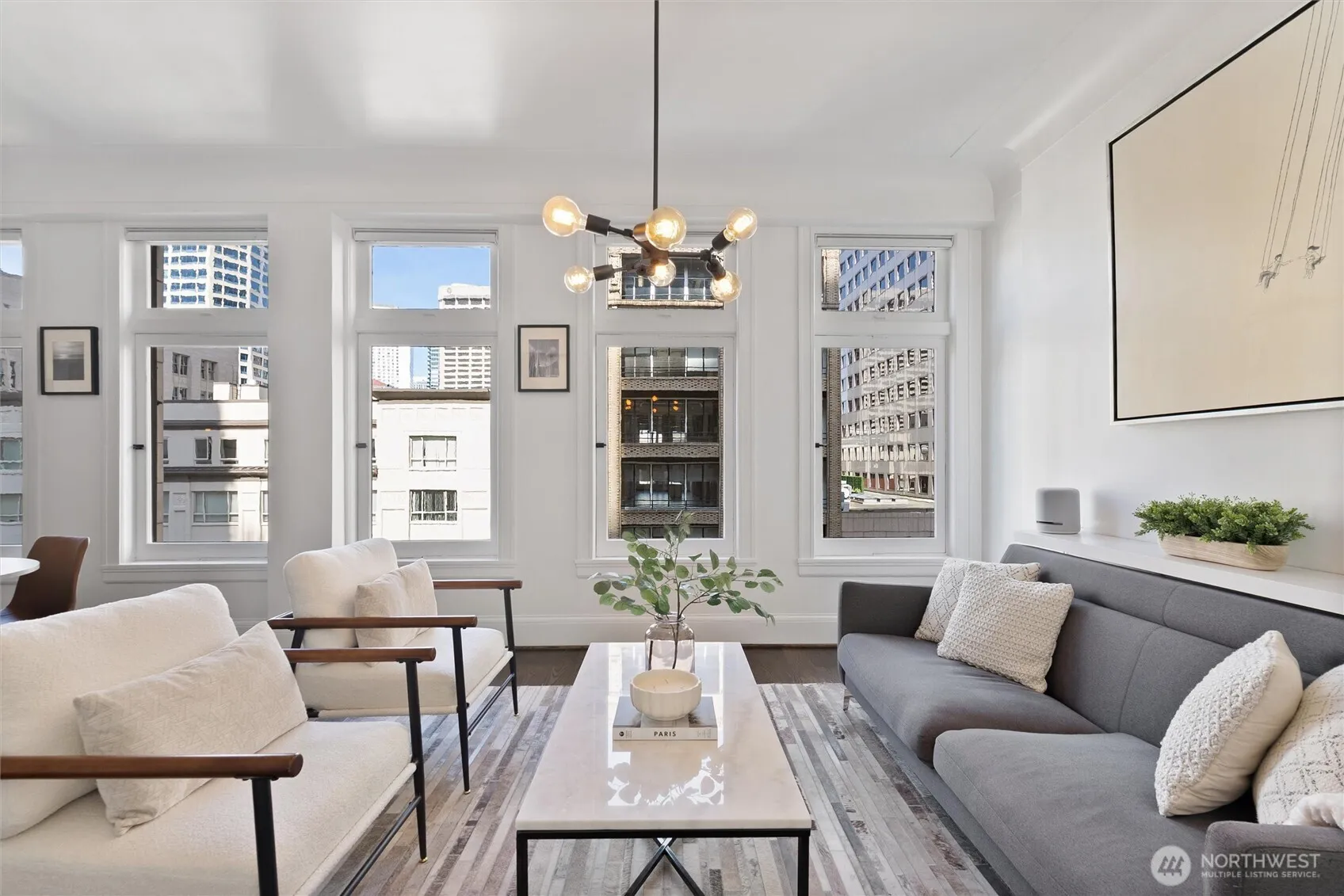 Beautifully updated 3-bedroom, 1.75-bath condo in a historic downtown Seattle building just one block from Pike Place Market. This 1,377 sq. ft. home blends timeless character with modern style and feels like an elegant apartment in Europe. Soaring ceilings, oversized windows, and rich walnut hardwood floors create a warm, light-filled feel. The spacious living and dining areas flow into a designer kitchen with marble counters, sleek cabinetry, premium appliances, and a stunning vintage Seattle map mural. The flexible floor plan includes three spacious bedrooms, beautifully updated baths, and two separate entrances—allowing the condo to easily be divided into two apartments. Perfect for multigenerational living, rental income, or adding a smart investment property to your portfolio for the price of one. Unbeatable location near the waterfront, shopping, dining, entertainment, and all the excitement of downtown Seattle—including the upcoming FIFA World Cup 2026.