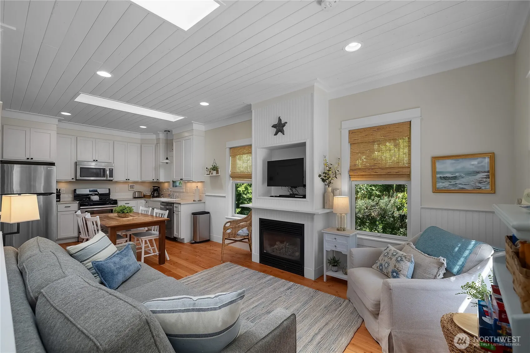 Beachy Keen is a unique two-story Beach Camp home, located on a wooded corner lot. Enjoy an open living room and kitchen with skylights, bamboo blinds, planked ceilings, and a gas fireplace. Downstairs, has high ceilings, a bunk area with built-in four extra-long twin beds with their own individual lights, shelves & drawers. The queen primary bedroom on the lower floor offers tranquil forest views. The Bathroom has a tile floor heating system. The lower level opens to a private patio surrounded by forest, featuring a bike shed, a seven-person hot tub for evening relaxation under the clear sky, with sounds of the ocean. The beach is a short walk away. This property is sold furnished, and has new carpet & new hardwood floors.