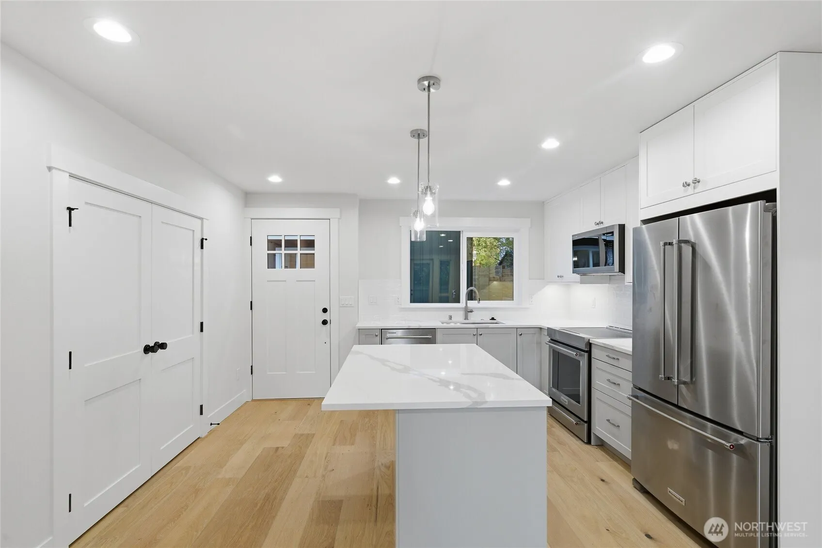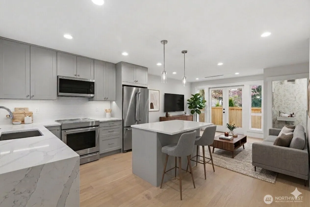 Crisp modern design meets everyday comfort. Two story detached home from Seattle favorite boutique builder Garton Developments on one of the finest tree-lined streets in North Green Lake. Thoughtfully designed new construction, these home blends modern craftsmanship with timeless finishes. Wide-plank hardwoods, clean-lined shaker doors, and black hardware create a cohesive, elegant look, while a custom entry drop zone adds practical style. The kitchen features two-tone Bellmont cabinetry, quartz counters, full-height backsplash, and a spacious peninsula with pendant lighting. Bathrooms showcase designer tile, quartz, and modern fixtures, including a spa-like primary suite bath and a boutique powder room. Additional highlights include plush carpeted bedrooms, black spindle stair railings, curated exterior lighting, and a neutral palette for a bright, calm feel. Don’t miss the heated garage/flex room, a rare find for in-city new construction. Total of 2 parking spaces (one inside garage and one uncovered outside). Set on a quiet, peaceful street yet just moments from vibrant conveniences including Green Lake, Northgate Station, North Seattle College and much more!