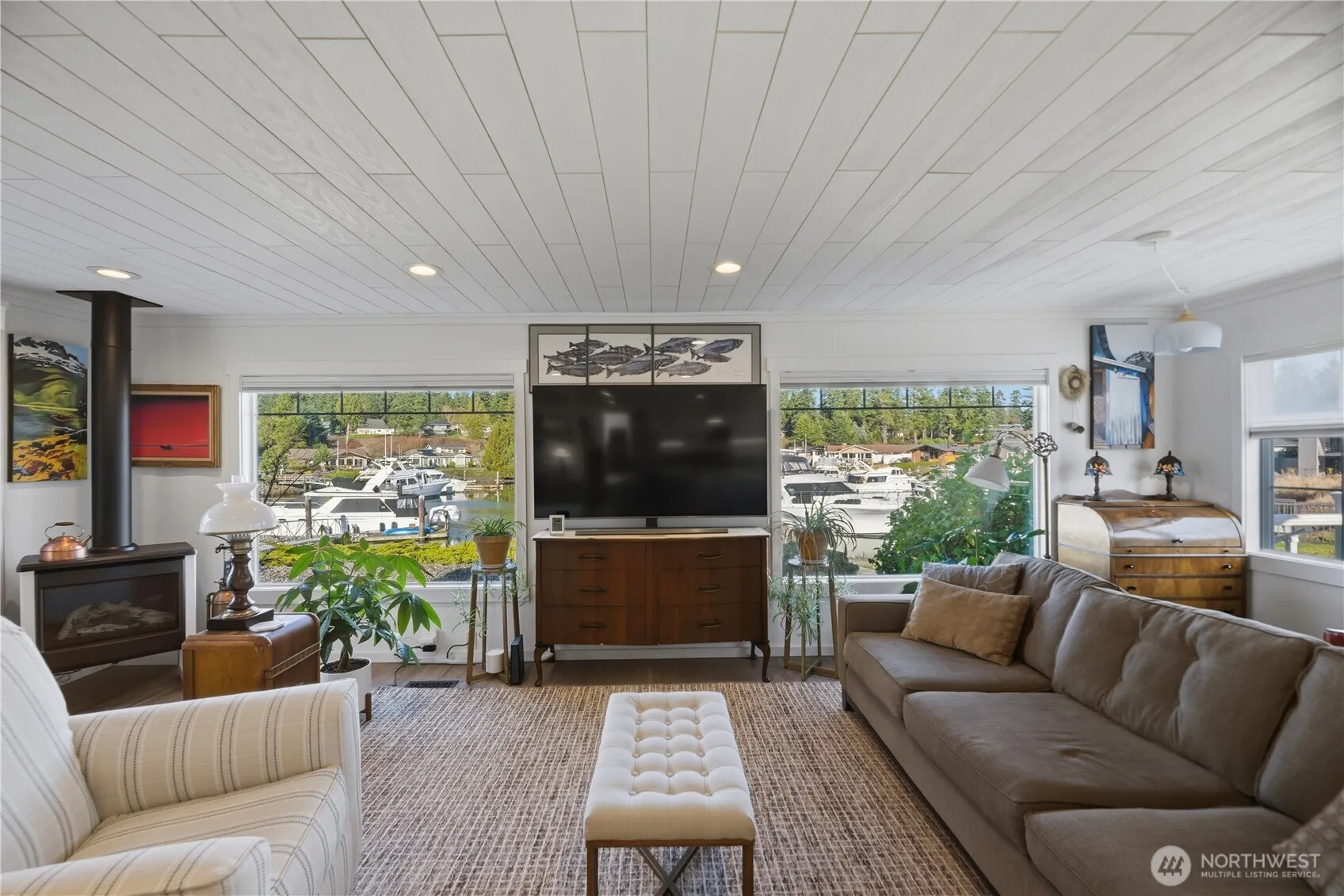 Experience premier waterfront living in highly desirable La Conner. This exceptional home boasts 120 feet of waterfront along with two deepwater floating docks—a 40-foot concrete dock and a shared 30-foot wooden dock—ideal for boating enthusiasts and yacht owners alike. Extensively renovated in 2021, the home showcases a beautifully updated kitchen featuring striking granite countertops, an impressive 8-foot island, and an open-concept layout that flows effortlessly into the main living space, all surrounded by stunning water views. Enjoy thoughtfully updated bathrooms, including a spa-inspired shower with a waterfall fixture, plus a dedicated office with radiant floor heating, new windows, a Scandinavian style propane fireplace/stove, heat pump, air conditioning and a refreshed laundry area. A durable 50-year tile roof adds long-term value and peace of mind. Granite and hardwoods throughout. Low property taxes enhance affordability, while Shelter Bay amenities—including a clubhouse, golf course, pool, beach access, and available RV parking—provide a resort-style lifestyle. Boating access from your backyard makes this home a true gateway to Anacortes and the San Juan Islands, with potential to lease moorage to other boaties. This property is on leased land, with the current lease in place through 2044 and negotiations underway for a new 75-year extension.