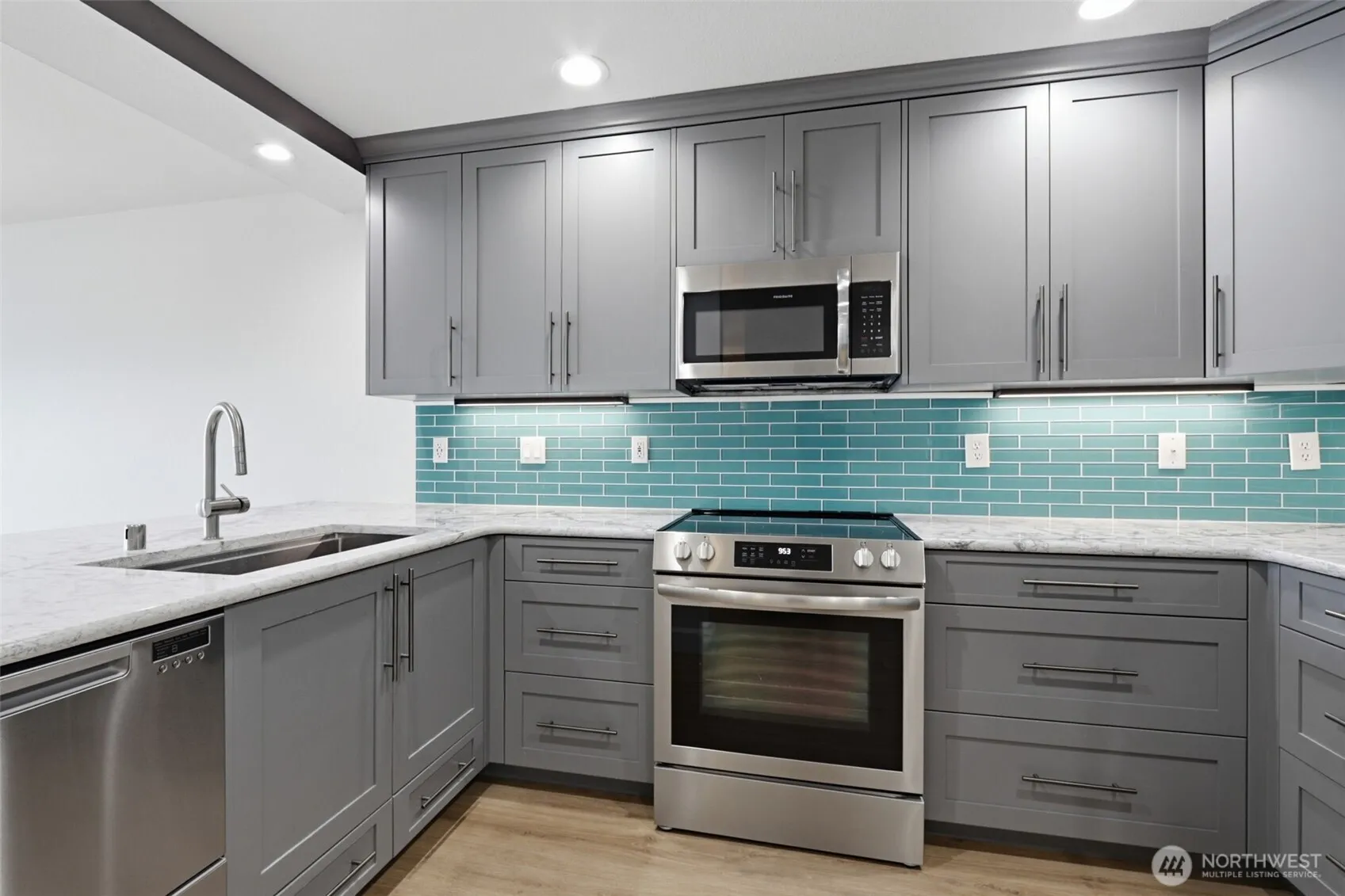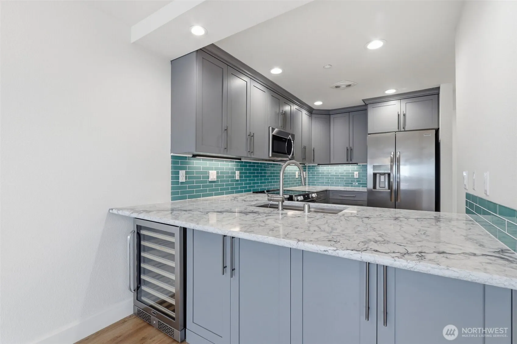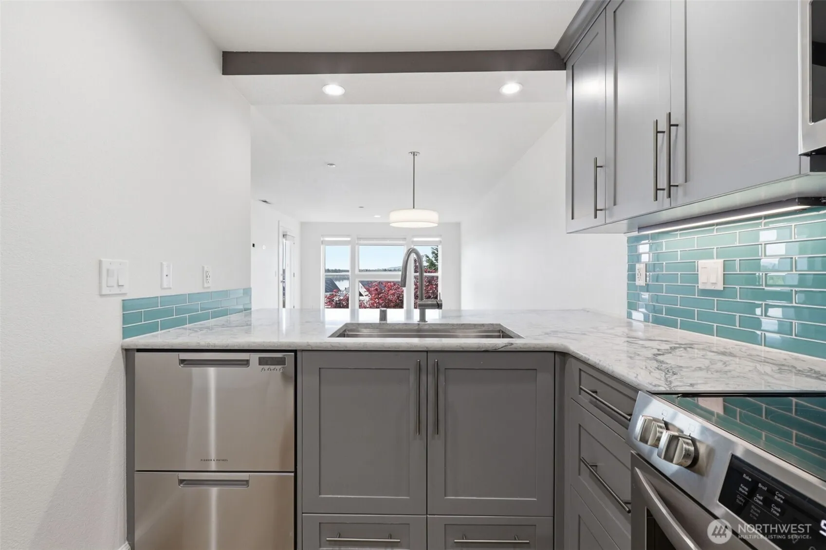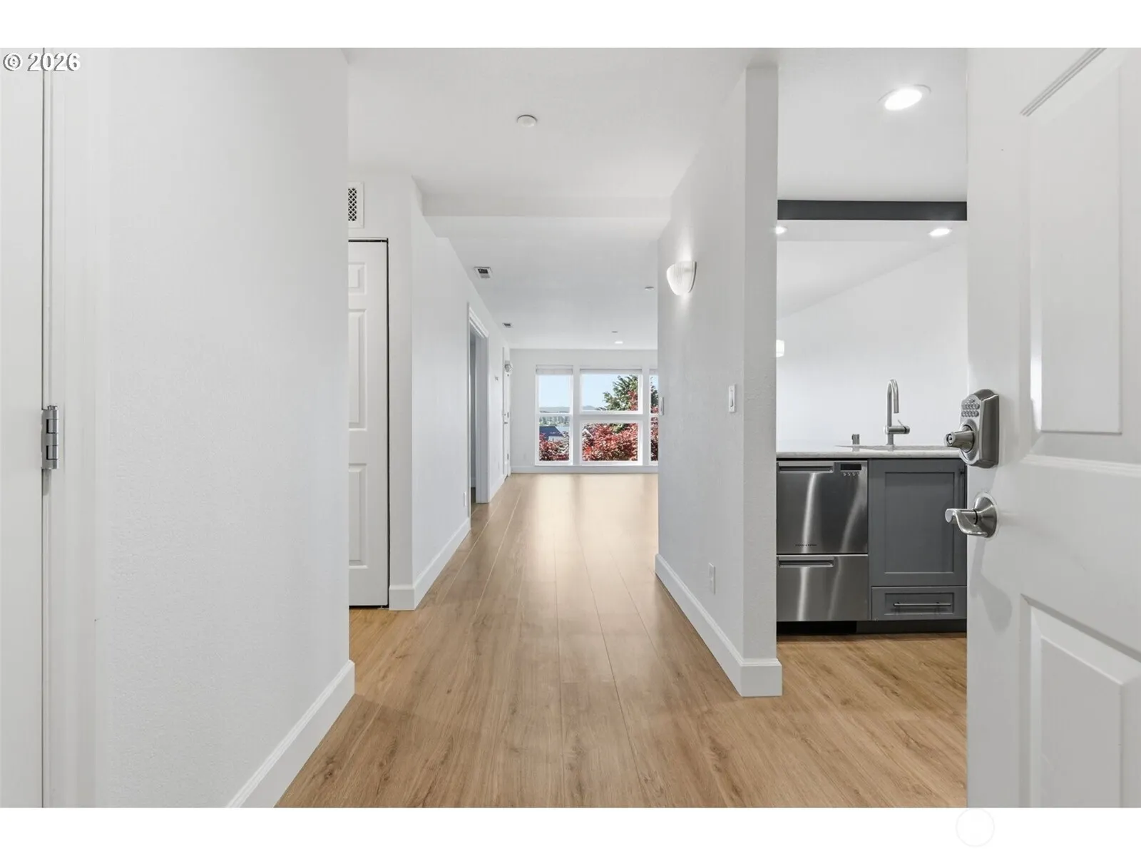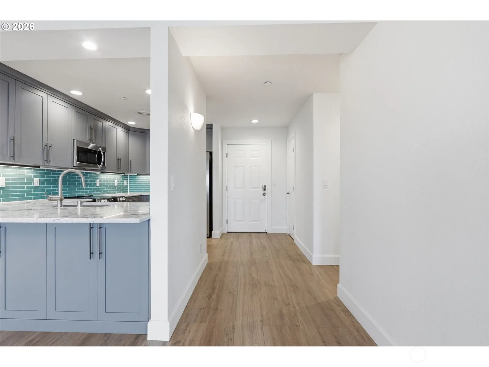 Fully remodeled with river views and a location that’s hard to find, all just a short stroll to the Vancouver waterfront. This single-level condo in Columbia Shores delivers the kind of updated, low-maintenance living you’ve been dreaming of. Inside, fresh interior paint and new flooring set the tone, while natural light fills the open living space. The layout flows easily from living to dining, creating a space that feels both functional and inviting. The kitchen is dialed in with quartz counters, stainless steel appliances, a wine cooler, and clean, modern finishes that make everyday living and entertaining easy. Step out to the covered deck to take in the fresh air and river views. The primary suite offers a true retreat with a beautifully remodeled bath, dual vanities, and a walk-in closet featuring custom built-ins and impressive storage. The second bedroom provides flexibility for guests or a home office. Enjoy the secure parking spot with EV charger and 9×9′ storage room for your private use. Community amenities include a fitness center, pool, and meeting space, elevator access, and beautifully maintained grounds. Just minutes to waterfront trails, dining, and shopping, this is easy living in one of Vancouver’s most sought-after locations.