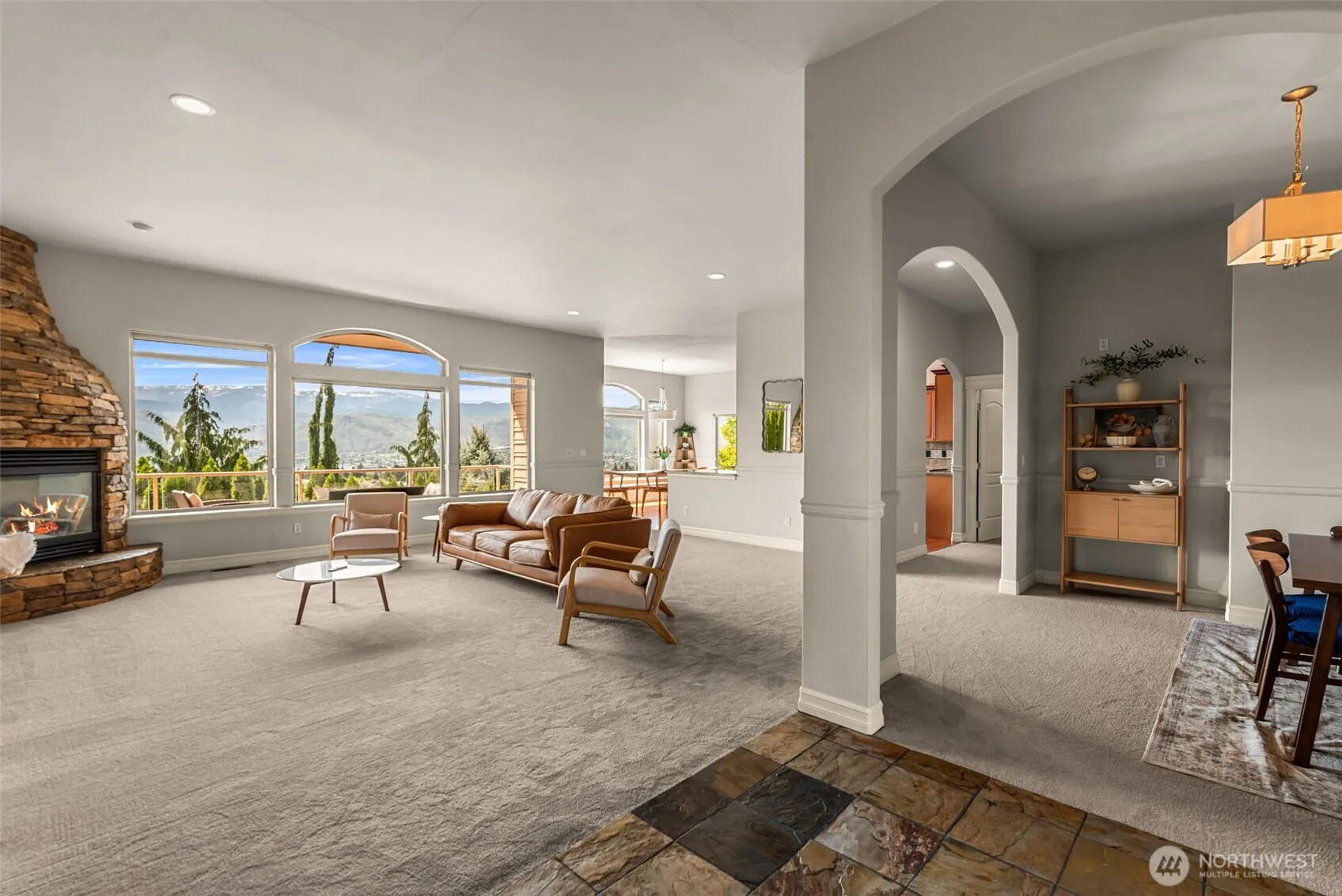 Perched in the desirable Briarwood neighborhood, this stunning view home captures sweeping vistas of the Wenatchee Valley, city, Columbia River, and Cascade Mountains, just minutes from the Wenatchee Golf & Country Club. A thoughtfully designed floor plan welcomes you with soaring ceilings and light-filled living spaces that highlight the incredible scenery. The living room features a gas fireplace with a stone surround and flows seamlessly into the kitchen and dining areas, perfect for everyday living and entertaining. A formal dining room offers additional space for hosting gatherings. The kitchen is equipped with granite countertops and custom cabinetry. Making it a stunning place to prepare you meals. The main level includes two bedrooms, including a spacious primary suite with a large en-suite bath featuring a walk-in tiled shower, double sinks, and an oversized walk-in closet. The lower level offers exceptional flexibility with a large open rec room, a bonus space ideal for a theater or flex use, and an additional room suited for a gym, workshop, or craft area. Two more bedrooms and a full bath complete the lower level. Enjoy outdoor living on expansive view decks, along with a low-maintenance yard and irrigation water. A three-car garage adds convenience, all set in an exceptional neighborhood.