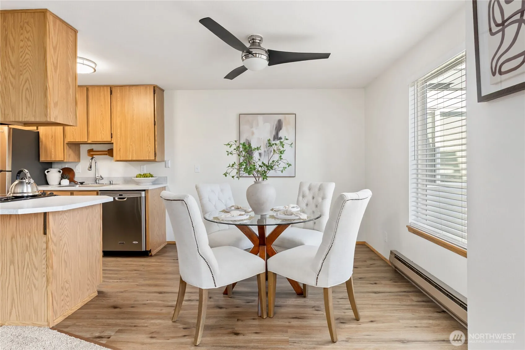 Updated top-floor condo offering natural light, privacy, and a functional layout. The open living area includes a dining nook and a private balcony overlooking the community. Kitchen features ample storage and a convenient breakfast bar. Two spacious bedrooms, including a primary with an attached bath and generous closet space. In-unit laundry and assigned parking included. Community amenities may include clubhouse, sport court, or common areas (buyer to verify). Close to shopping, schools, and transit access for easy commuting. HOA covers exterior maintenance, water, sewer, and common area care.