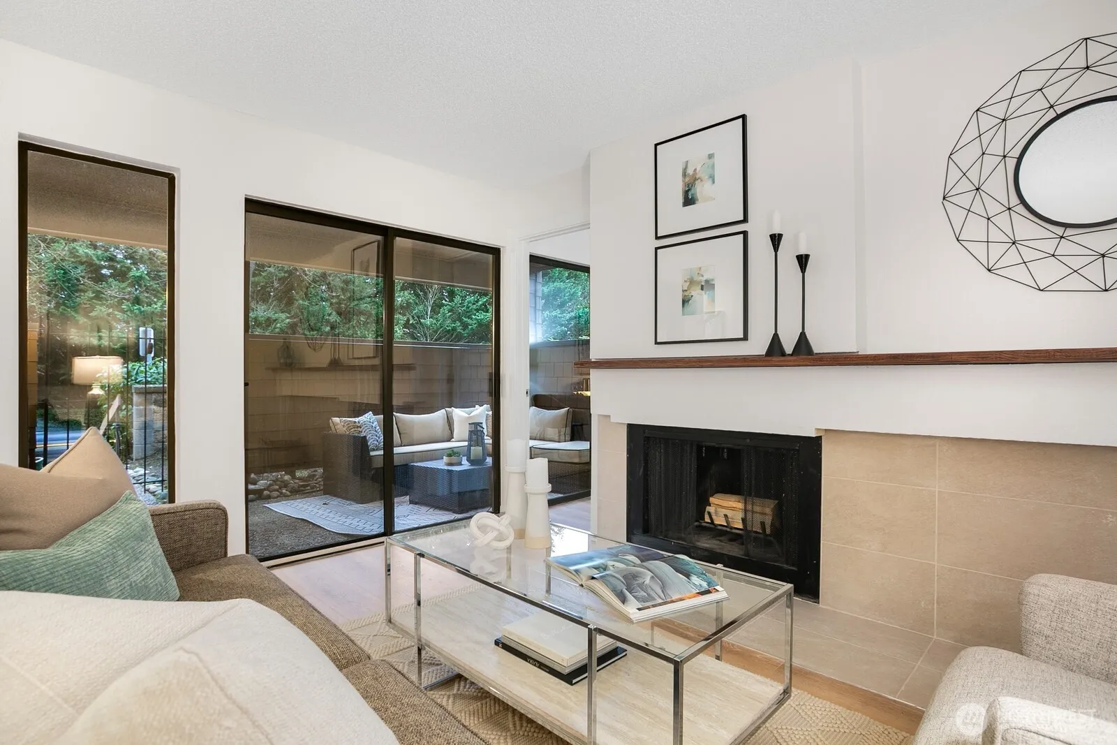 Rare find in this 2 bedroom, 1 bathroom ground floor, corner condo within walking distance to Whole Foods, Trader Joes, The Village, medical facilities, Kirkland Corridor Trail, Public Transit and more! This renovated home welcomes you with its large covered and secure front patio, enter the home and you will find a spacious living room with beautiful wood burning fireplace, along with new designer white shaker kitchen cabinets and quartz countertops and stainless appliances with an eating bar and breakfast nook, new flooring and finishes throughout. Bedroom w/ access to the covered patio as well as secondary bedroom w/ spacious walk-in closet. Beautiful bathroom with custom storage, white shaker cabinets, quartz countertops and designer tile. Washer/Dryer in unit. Community outdoor pool/hot-tub and beautiful grounds. No rental cap.